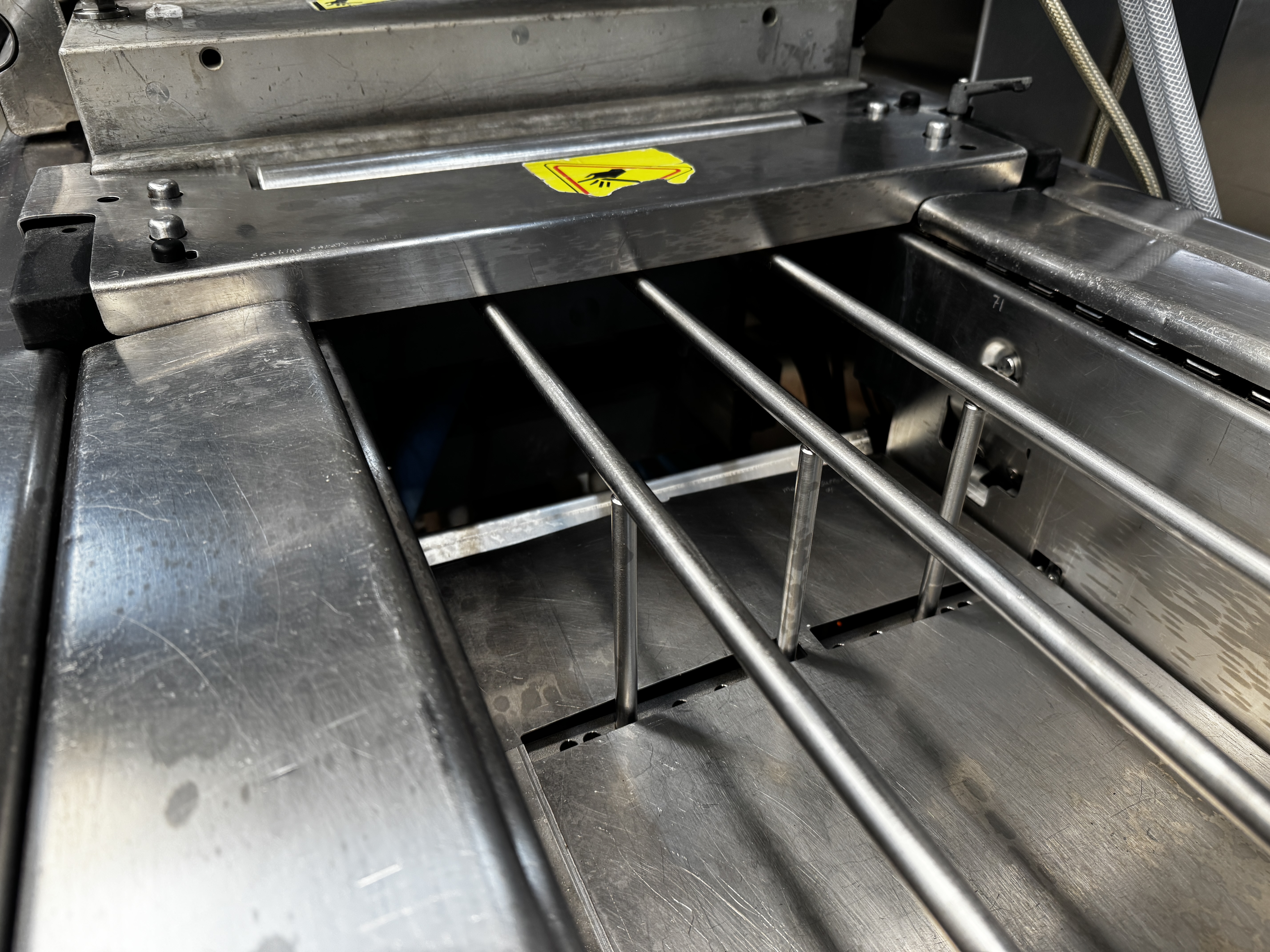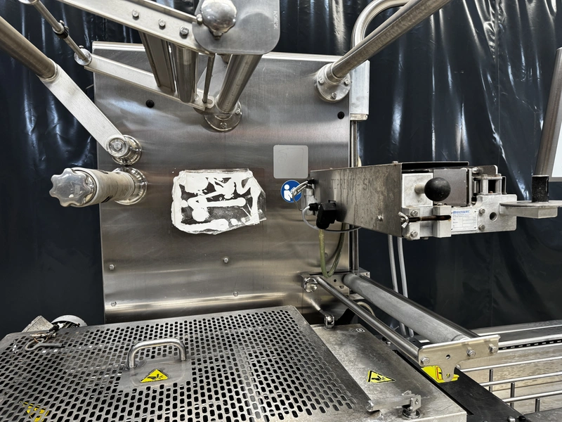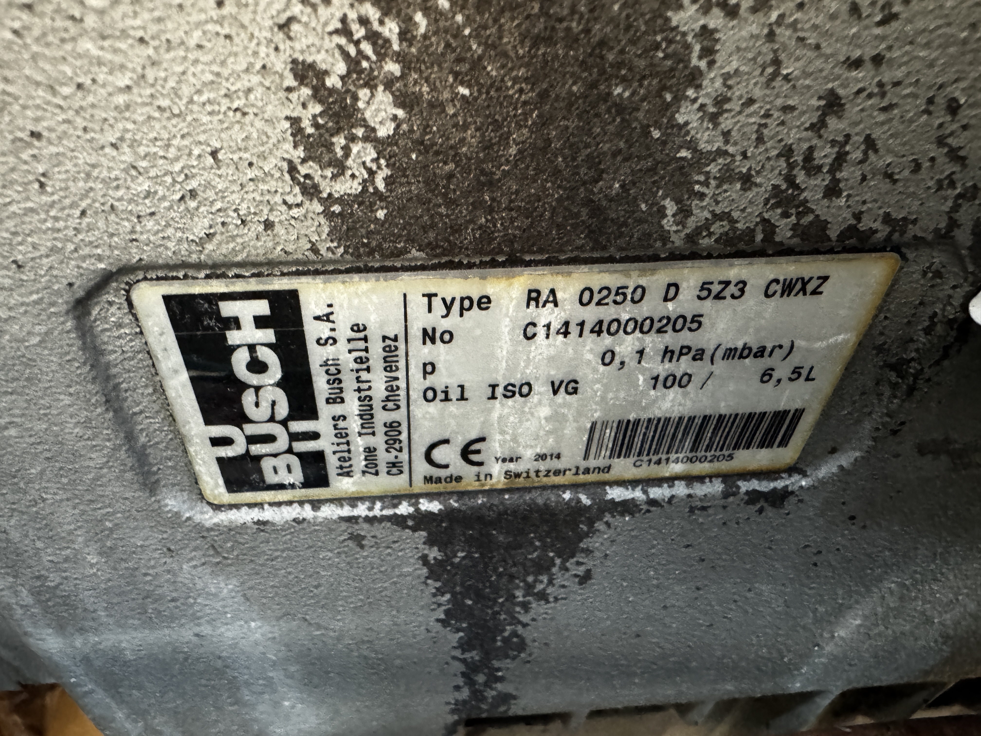 Multivac thermoformer, type: R145, serial number: 197815, year of construction: 2014, 400/230 V, 3 Ph, 50 Hz, 35 A, 12.5 kW, film width: 390 mm, (4x) dye: 175 mm x 70 mm, Busch vacuum pump, type: RA 0250 D 5Z3 CWXZ, capacity: 250 m³ per hour, total dimensions: 4600 mm x 1030 mm x 1950 mm.