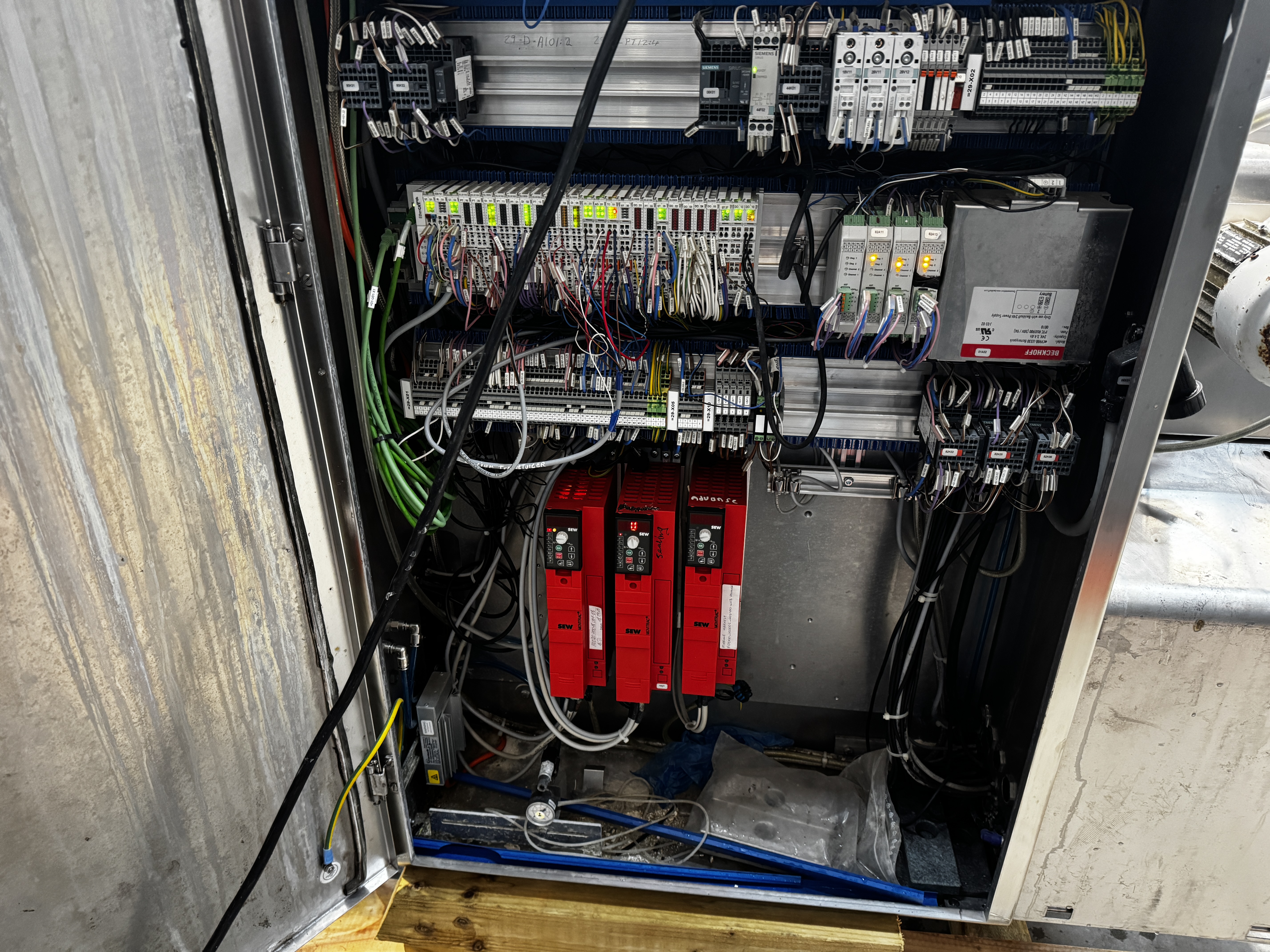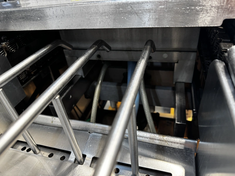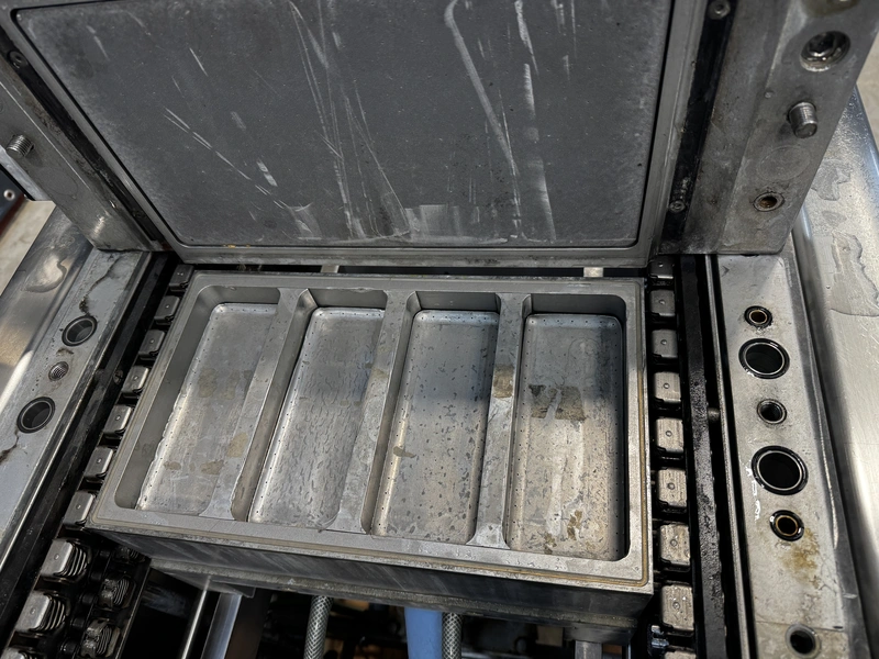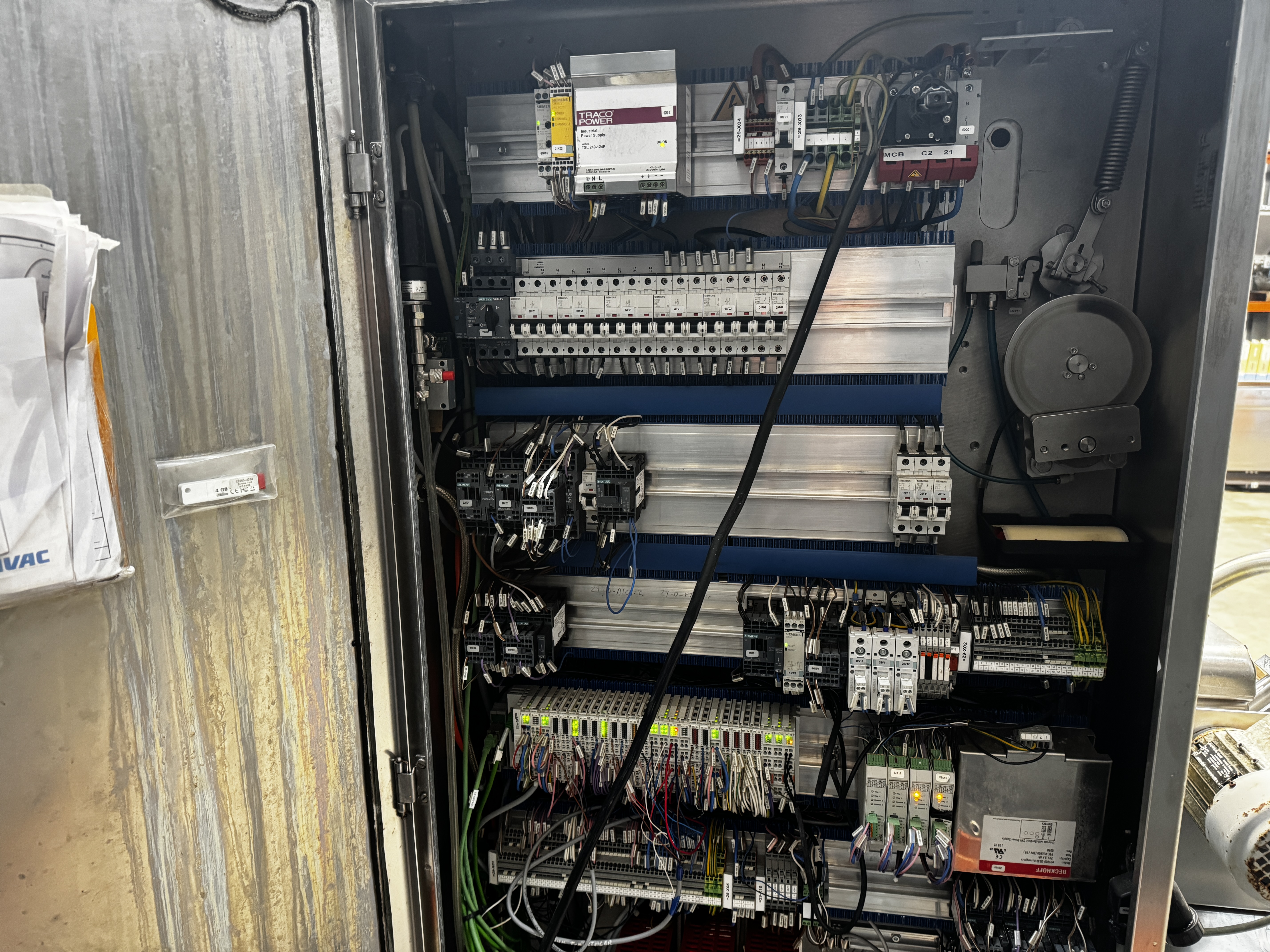 Multivac thermoformer, type: R145, serial number: 197815, year of construction: 2014, 400/230 V, 3 Ph, 50 Hz, 35 A, 12.5 kW, film width: 390 mm, (4x) dye: 175 mm x 70 mm, Busch vacuum pump, type: RA 0250 D 5Z3 CWXZ, capacity: 250 m³ per hour, total dimensions: 4600 mm x 1030 mm x 1950 mm.