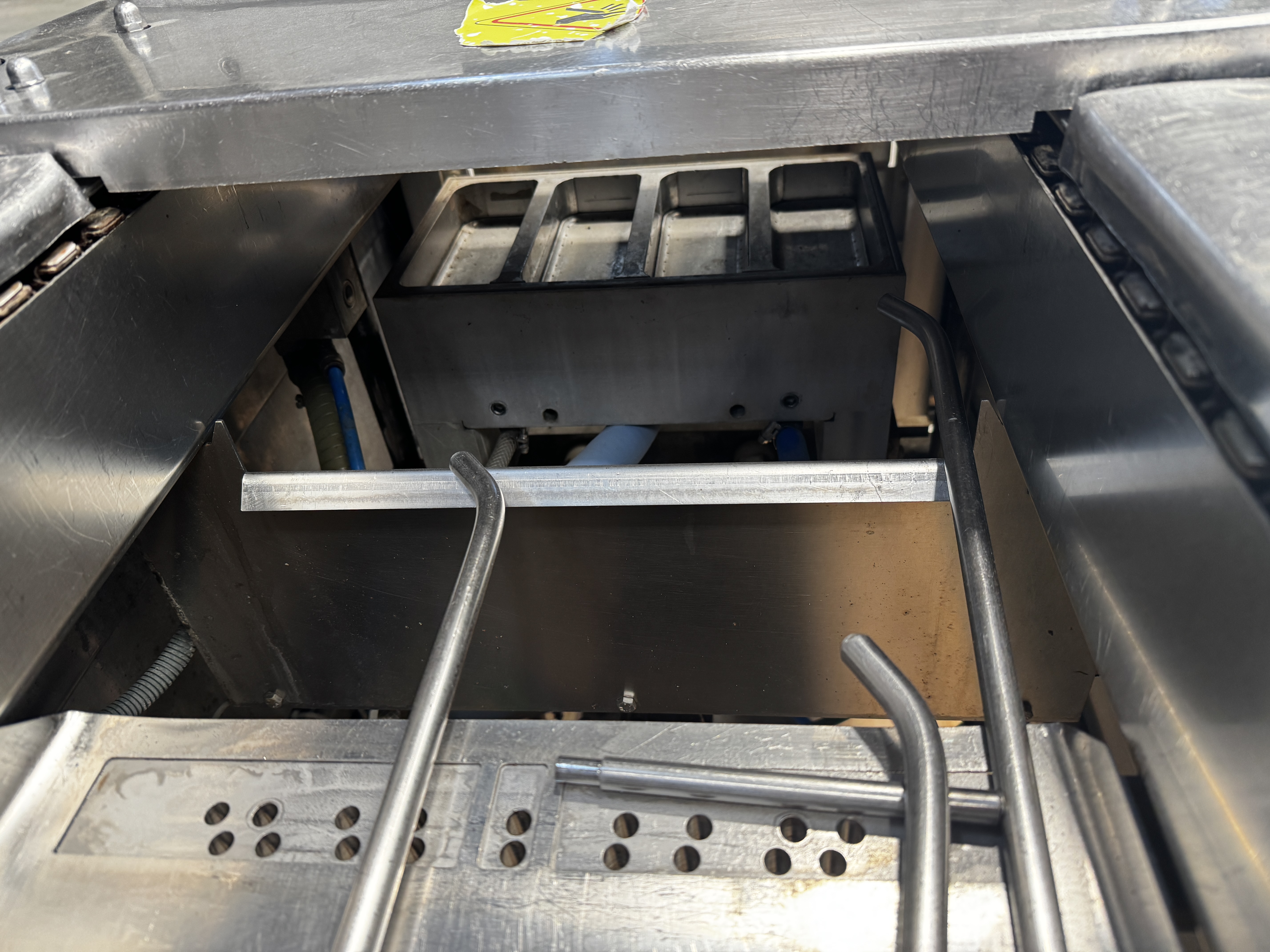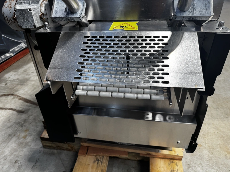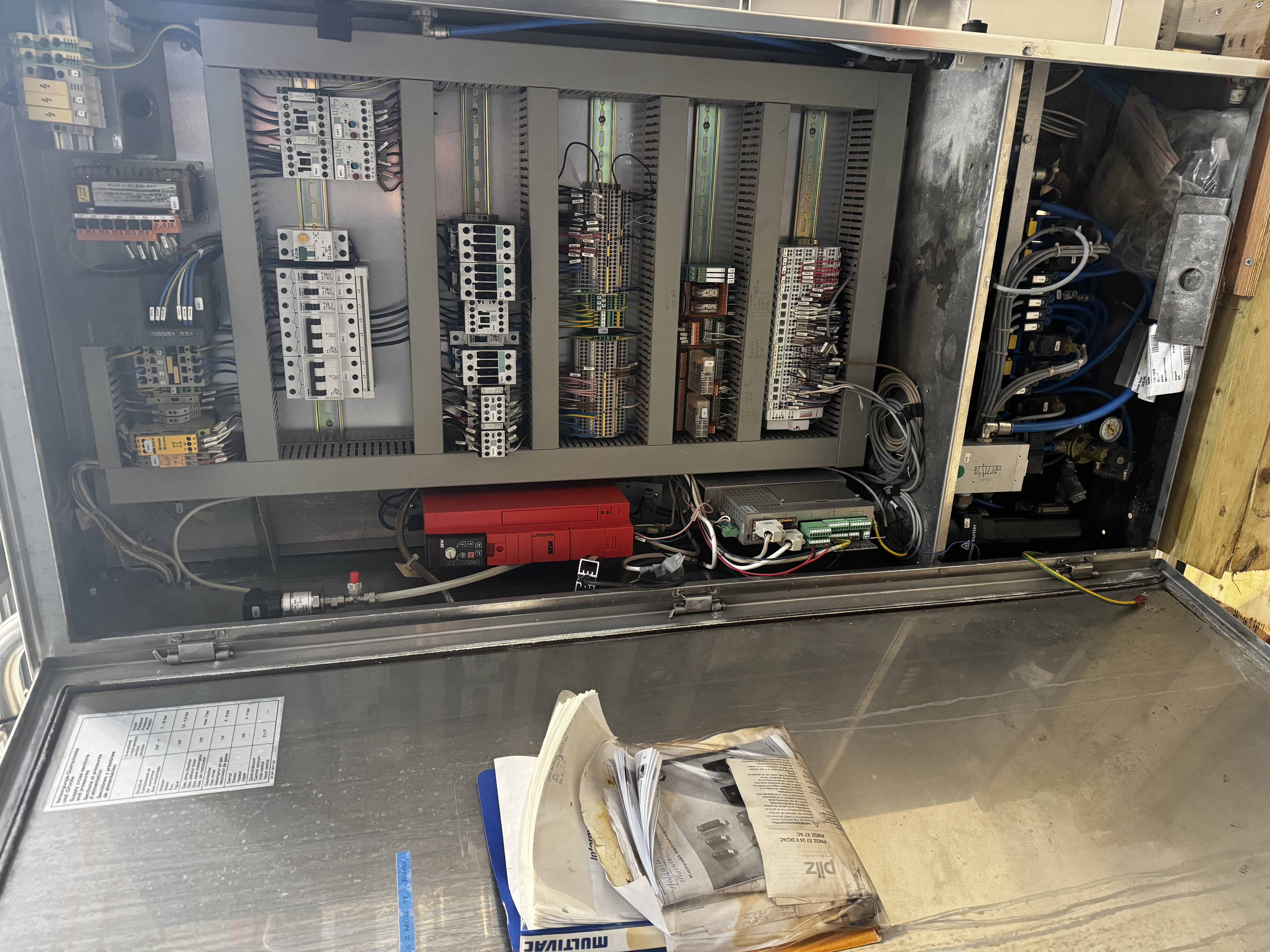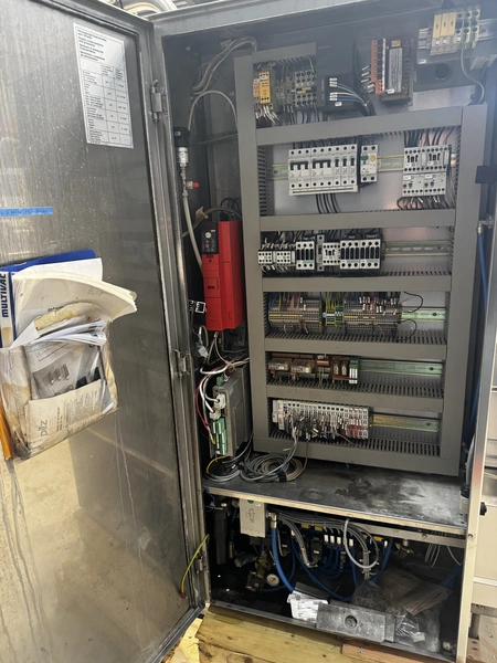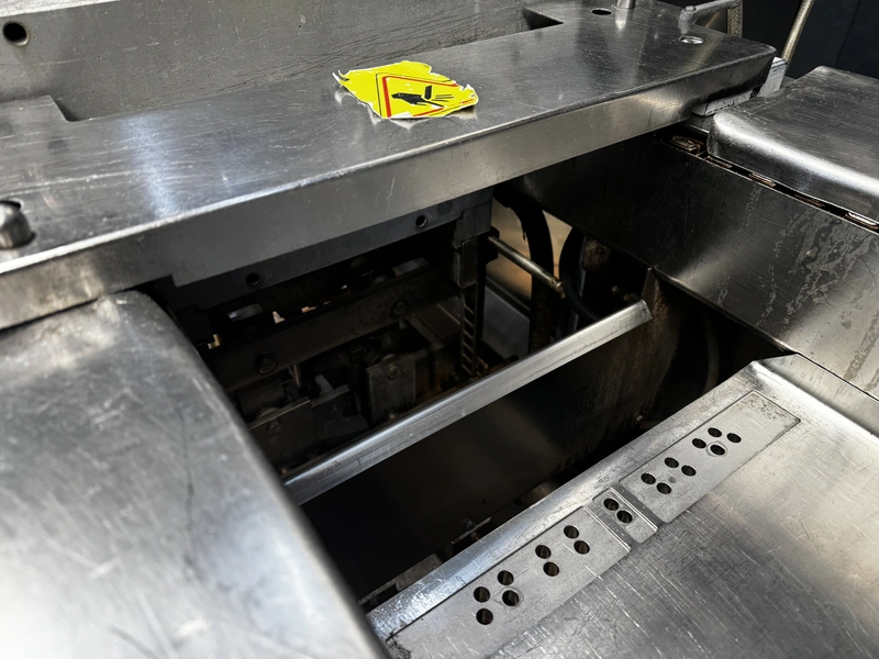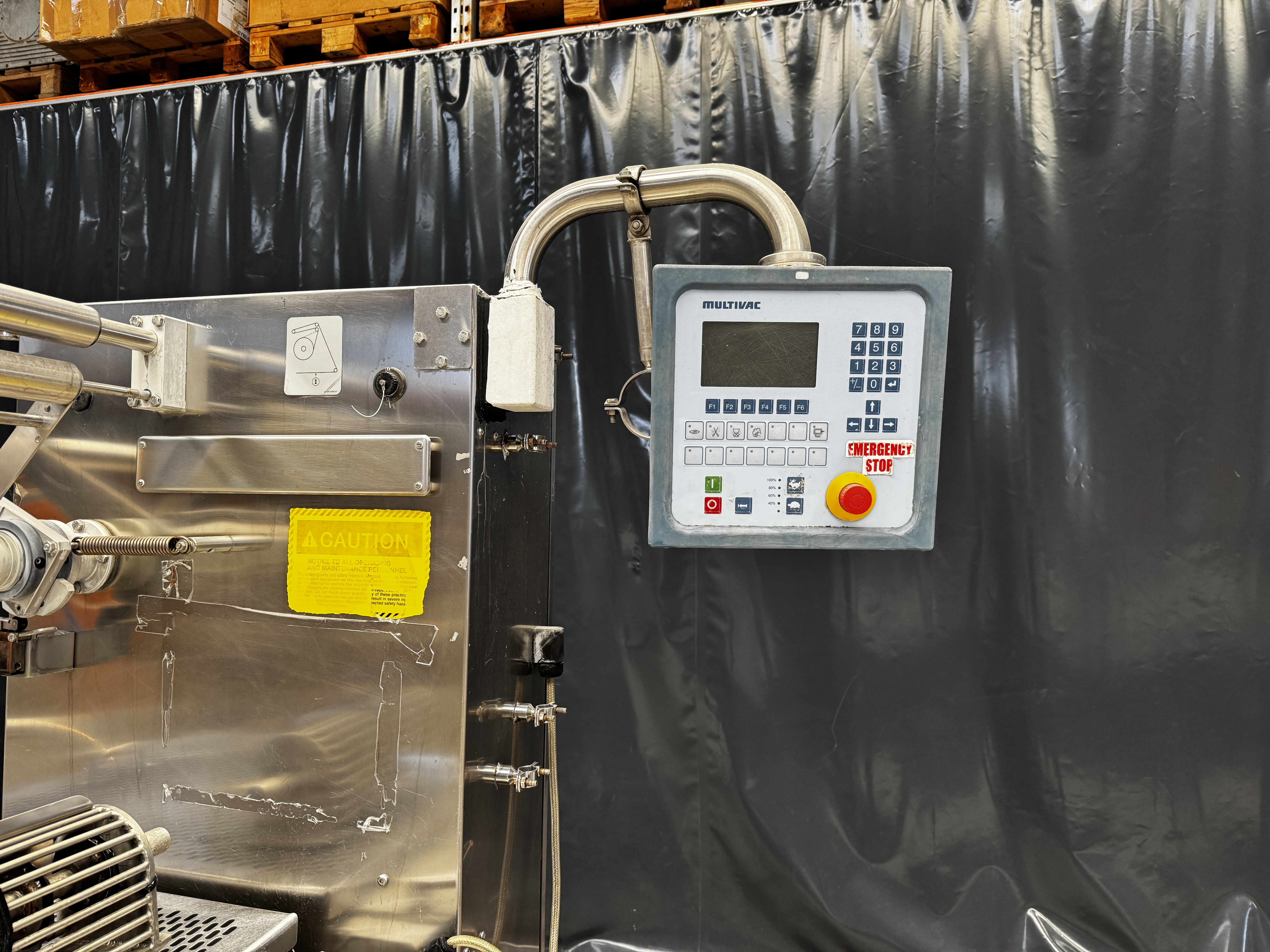 Multivac thermoformer, model: R140, serial number: 100499, year of construction: 2005, 400 V, 3 Ph, 50 Hz, 18 A, 6 kW, film width: 390 mm, (4x) dye: 180 mm x 70 mm, total dimensions: 4450 mm x 1000 mm x 1950 mm.
