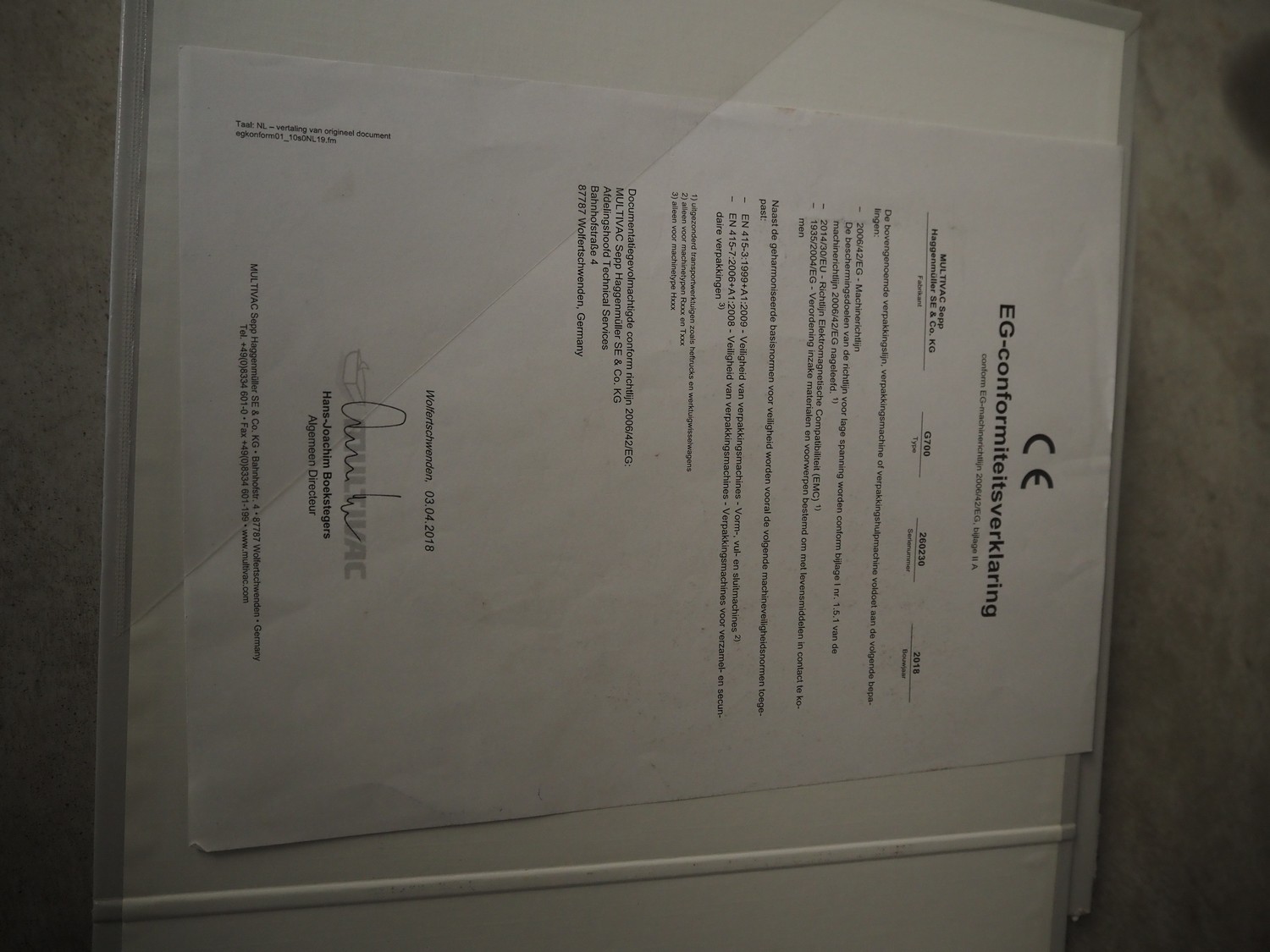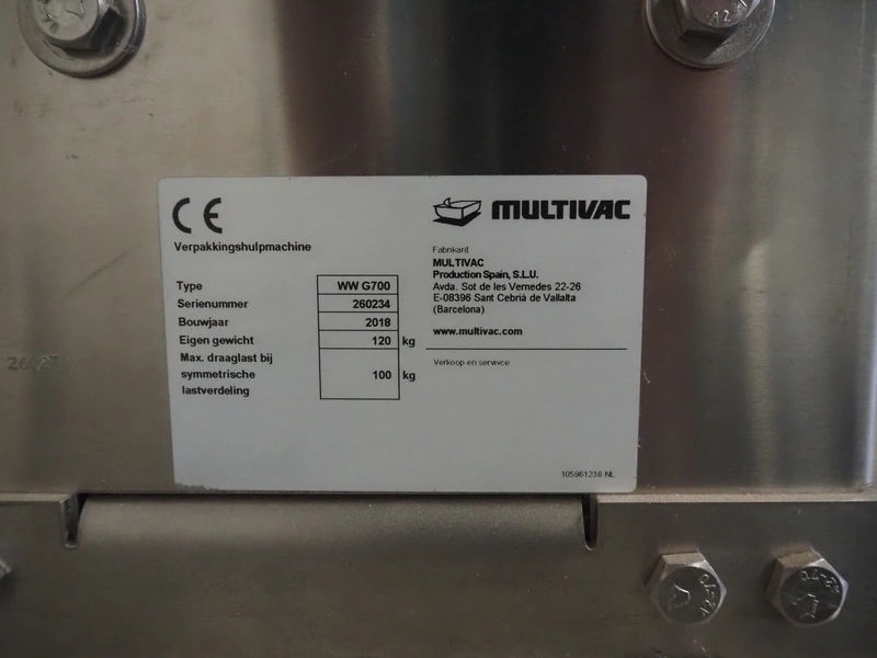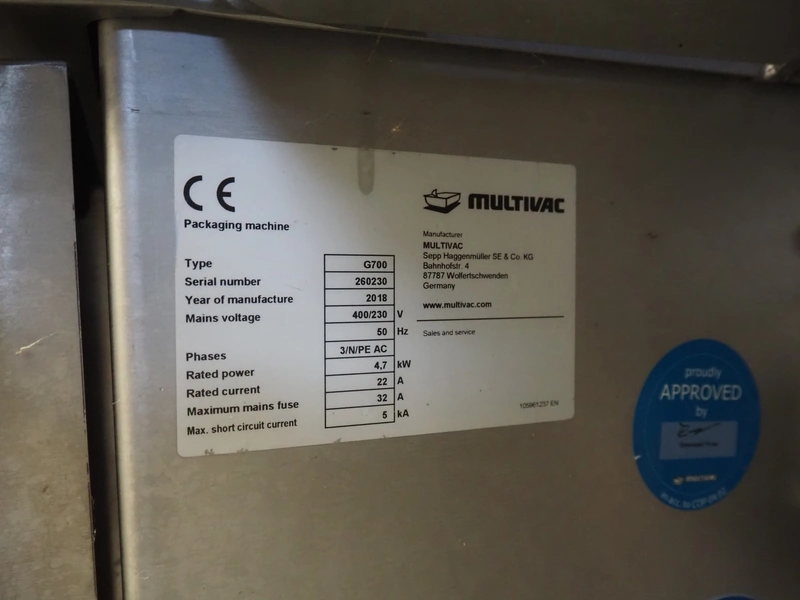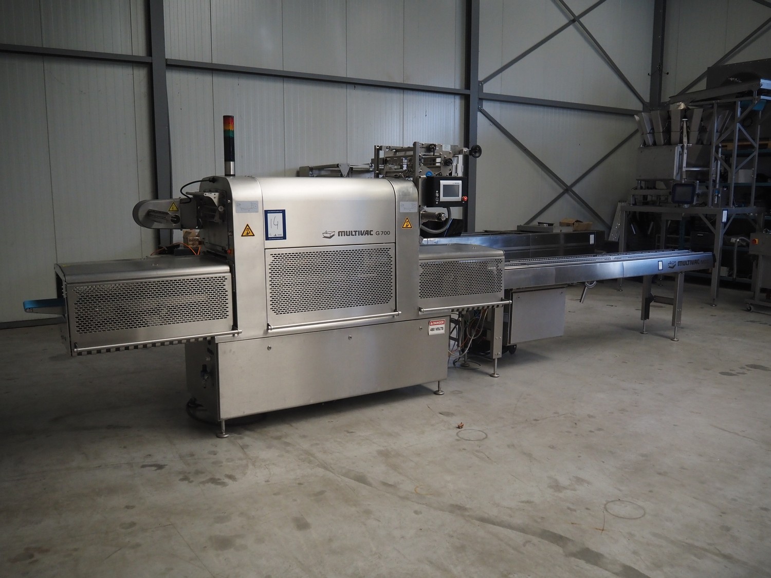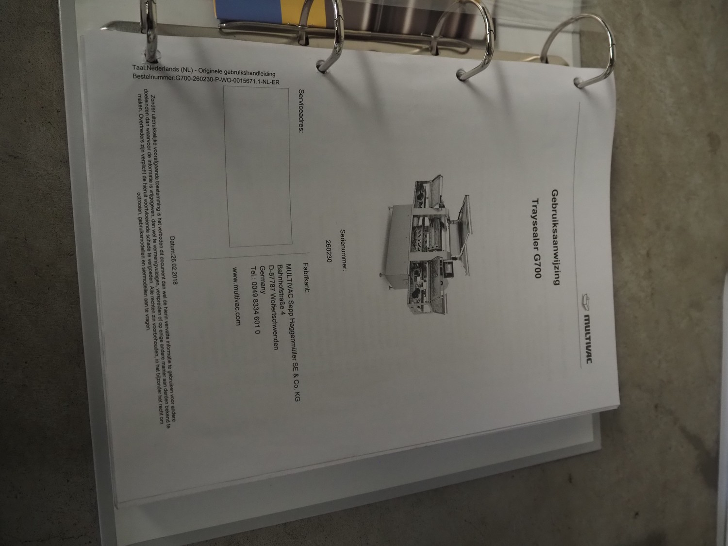 Multivac traysealer, type: G700, serial number: 260230, year of construction: 2018, 400/230 V, 3 Ph, 50 Hz, 22/32 A, 4.7 kW, film width: 410 mm, infeed chain with dividers, chain width: 165 mm, divider height: 10 mm, distance between dividers: 100 mm, dye: (6x) 180 mm x 90 mm, plastic outfeed belt, belt width: 245 mm, total dimensions: 3450 mm x 2100 mm x 900 mm. Including pallet with parts, 2 trolleys with dye's, dye: (6x) 190 mm x 95 mm, (6x) 175 mm x 95 mm, trolley dimensions: (2x) 1300 mm x 650 mm x 1680 mm, trolley to change dye's, dimensions: 1200 mm x 1100 mm x 1230 mm.