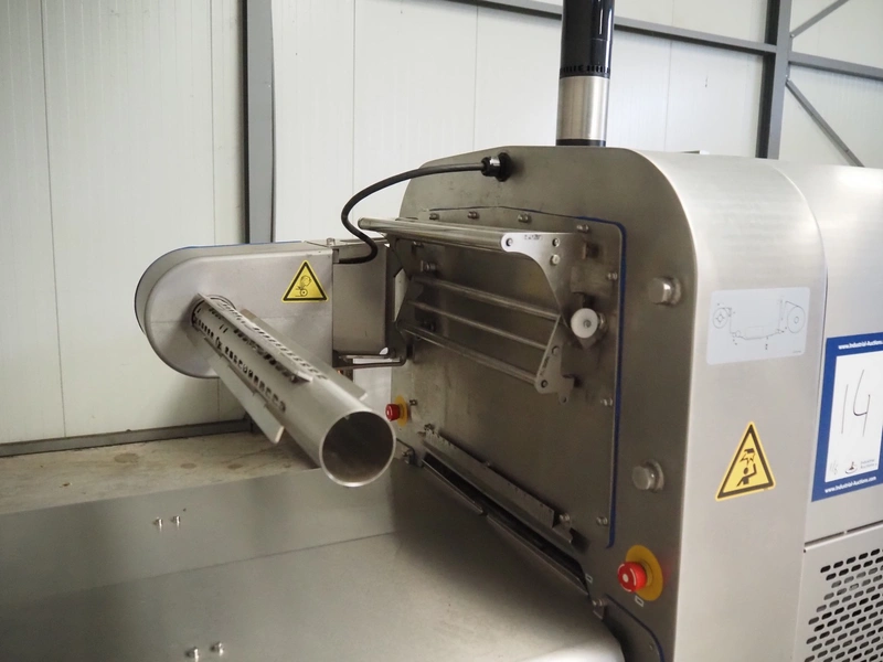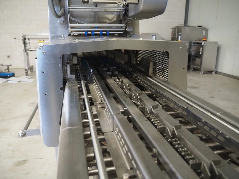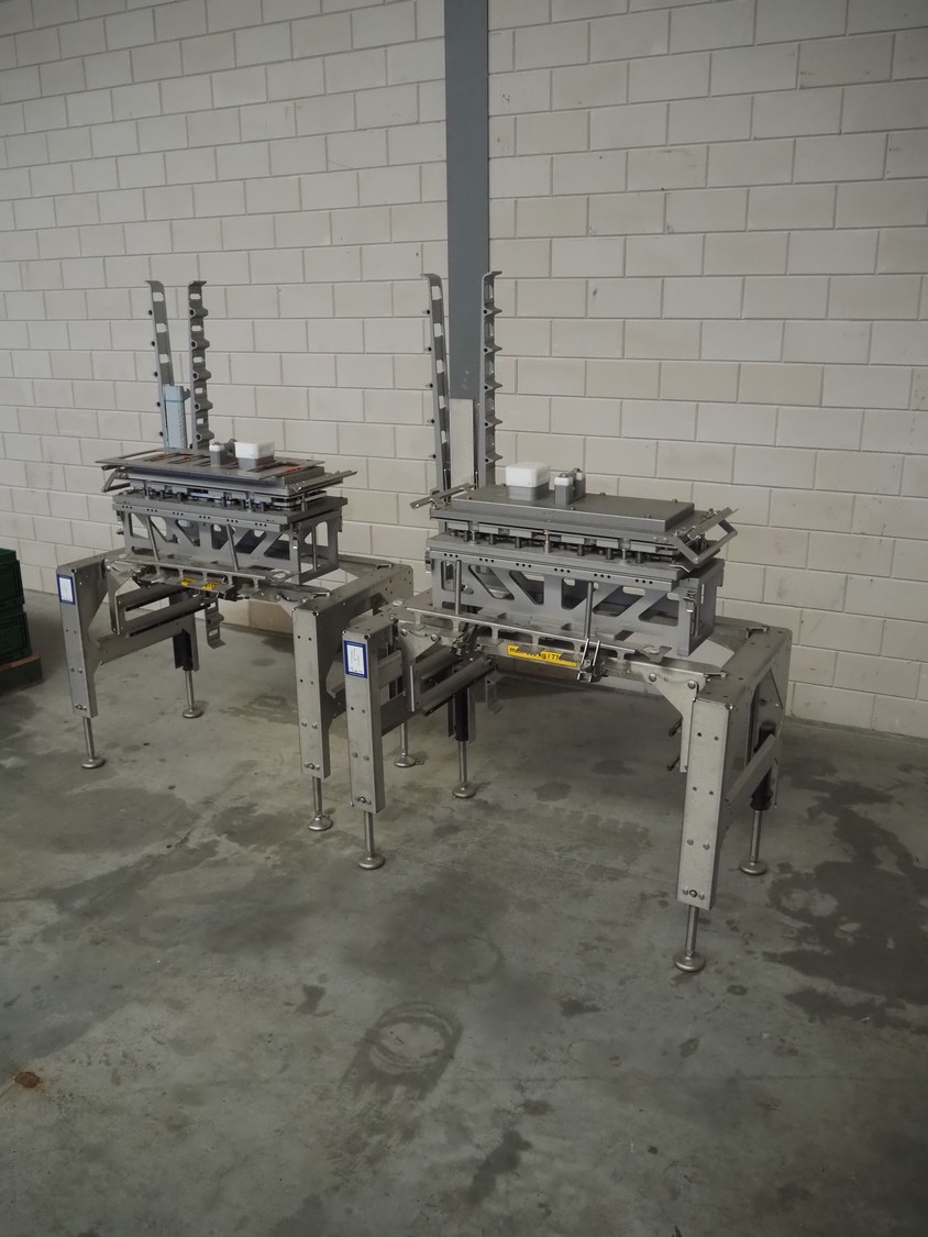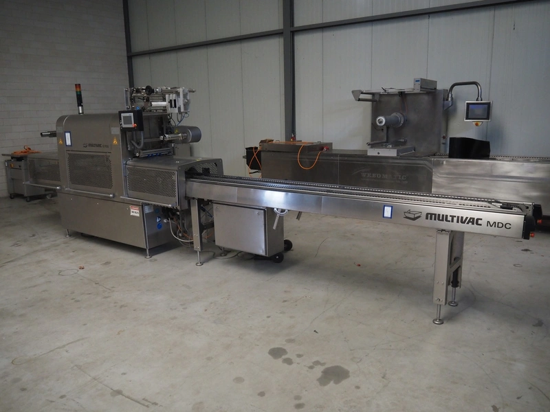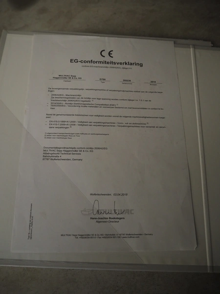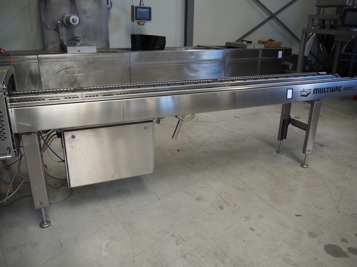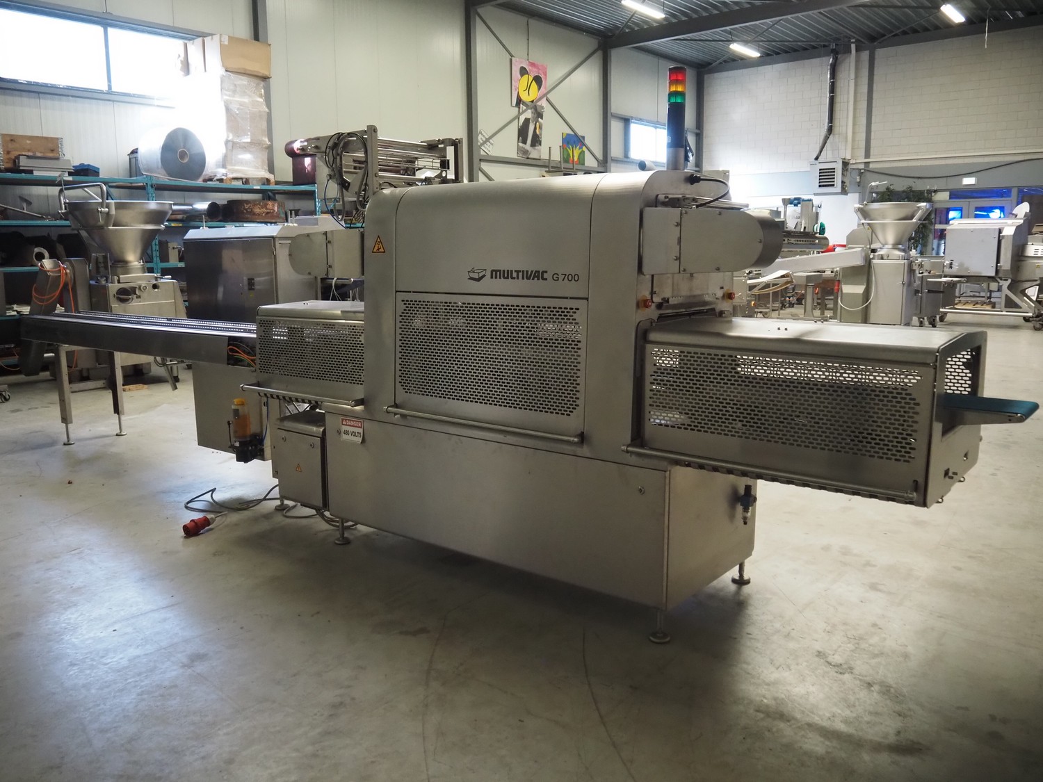 Multivac traysealer, type: G700, serial number: 260230, year of construction: 2018, 400/230 V, 3 Ph, 50 Hz, 22/32 A, 4.7 kW, film width: 410 mm, infeed chain with dividers, chain width: 165 mm, divider height: 10 mm, distance between dividers: 100 mm, dye: (6x) 180 mm x 90 mm, plastic outfeed belt, belt width: 245 mm, total dimensions: 3450 mm x 2100 mm x 900 mm. Including pallet with parts, 2 trolleys with dye's, dye: (6x) 190 mm x 95 mm, (6x) 175 mm x 95 mm, trolley dimensions: (2x) 1300 mm x 650 mm x 1680 mm, trolley to change dye's, dimensions: 1200 mm x 1100 mm x 1230 mm.