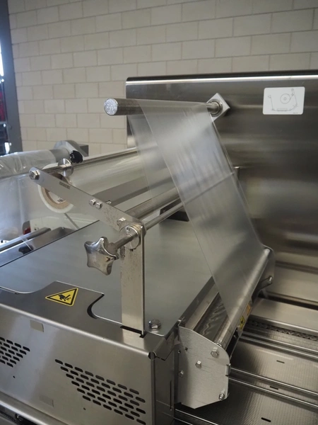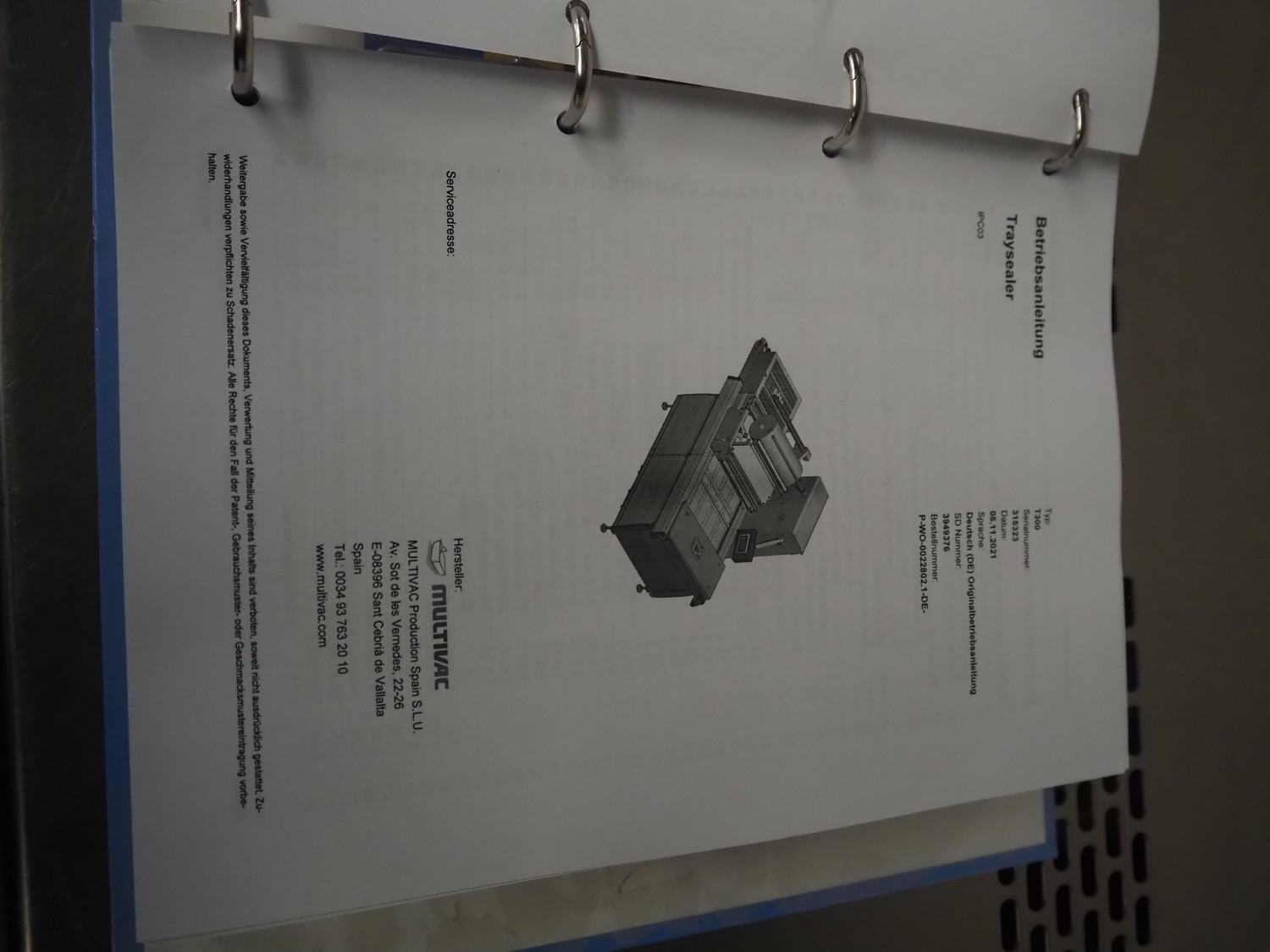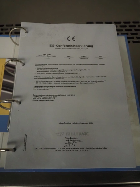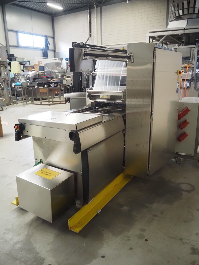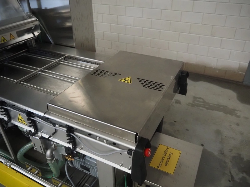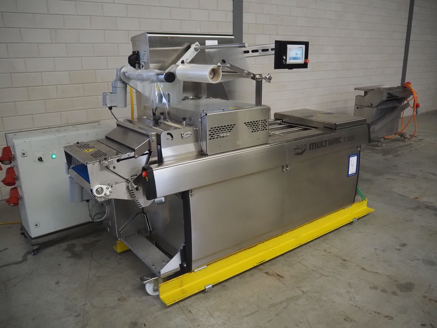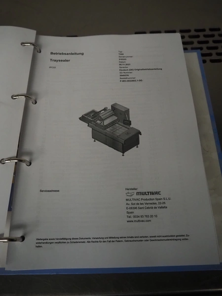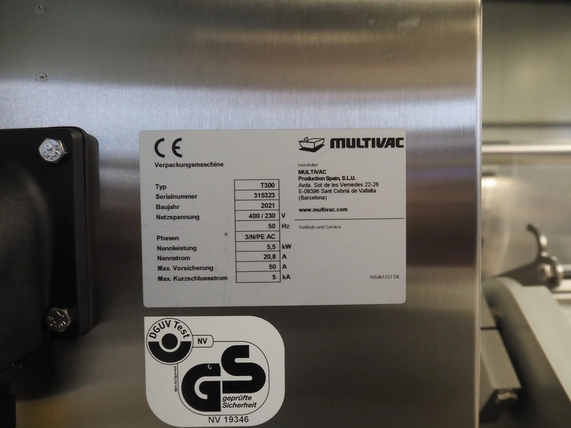 Multivac traysealer, type: T300, serial number: 315323, year of construction: 2021, 400/230 V, 3 Ph, 50 Hz, 20.8/50 A, 5.5 kW, film width: 390 mm, dye: (2x) 270 mm x 160 mm, plastic outfeed belt, belt width: 460 mmm, Busch vacuum pump, type: RA0100 F 503, capacity: 100 m³ per hour, total dimensions: 2600 mm x 1050 mm x 1670 mm.