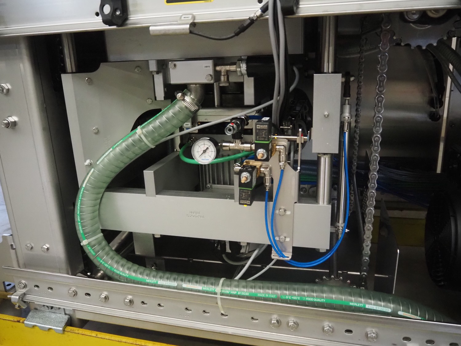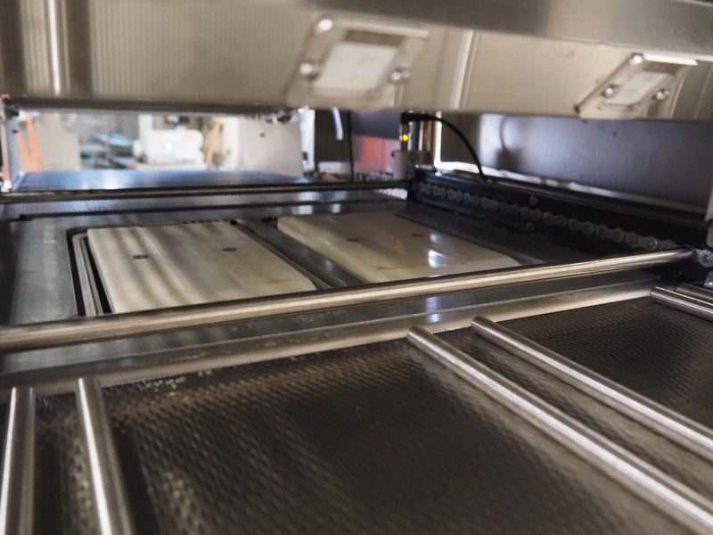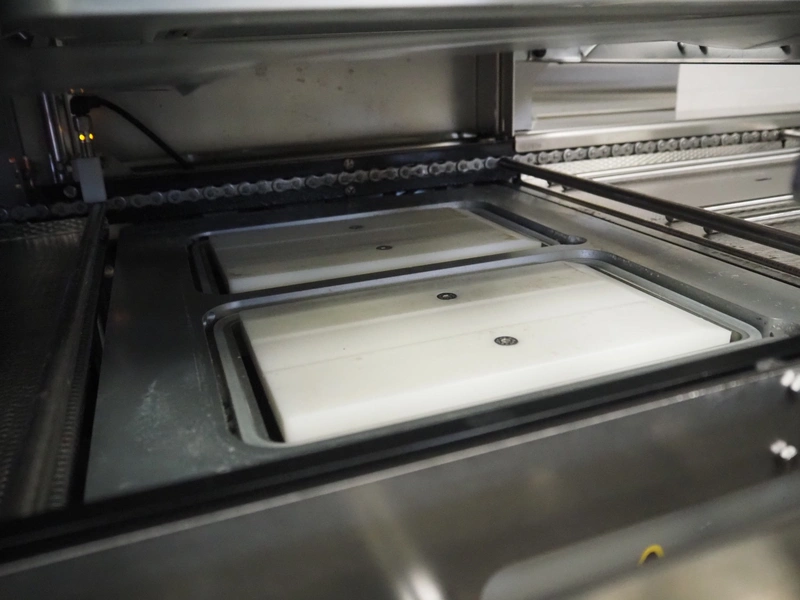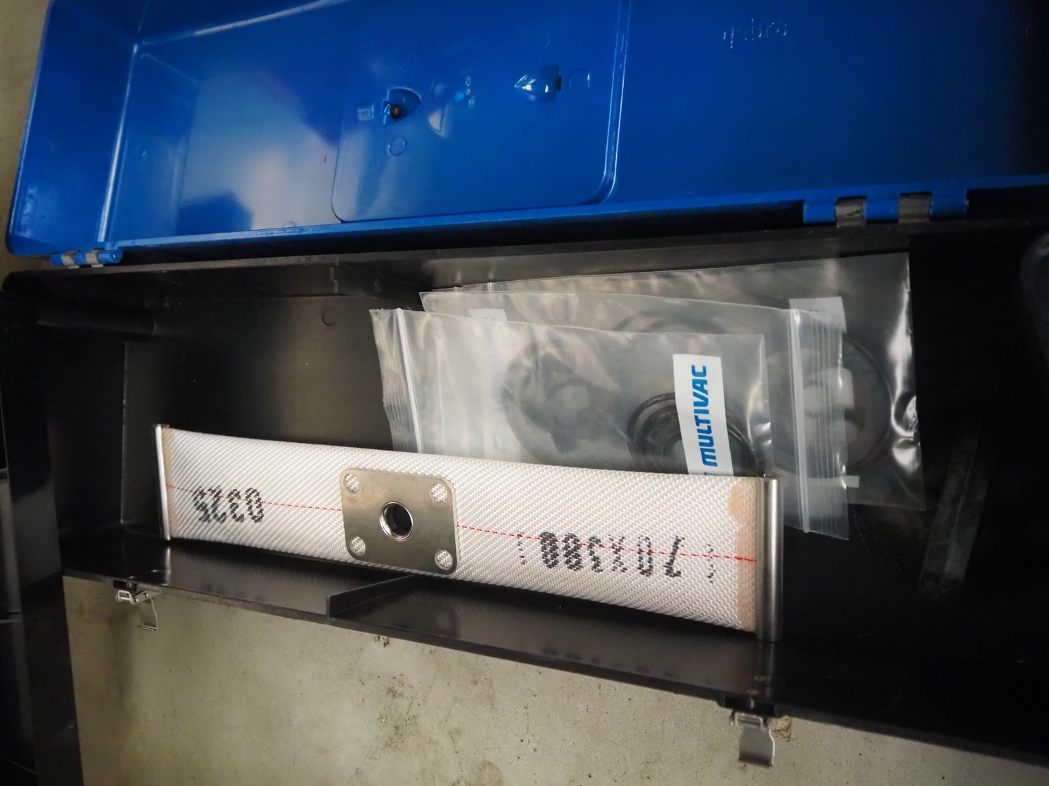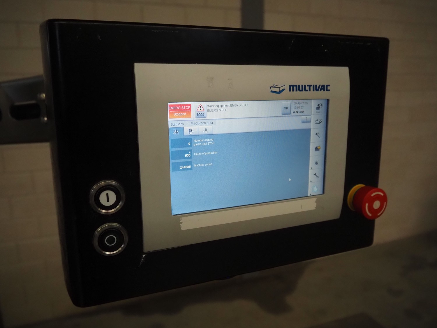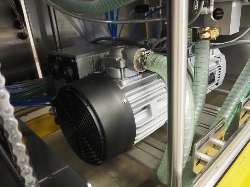 Multivac traysealer, type: T300, serial number: 315323, year of construction: 2021, 400/230 V, 3 Ph, 50 Hz, 20.8/50 A, 5.5 kW, film width: 390 mm, dye: (2x) 270 mm x 160 mm, plastic outfeed belt, belt width: 460 mmm, Busch vacuum pump, type: RA0100 F 503, capacity: 100 m³ per hour, total dimensions: 2600 mm x 1050 mm x 1670 mm.