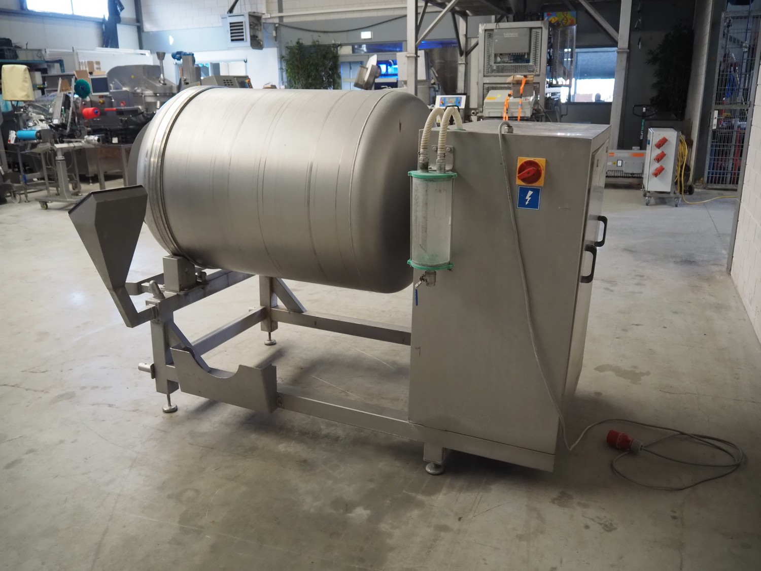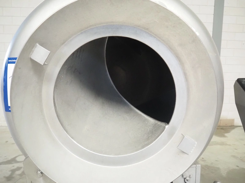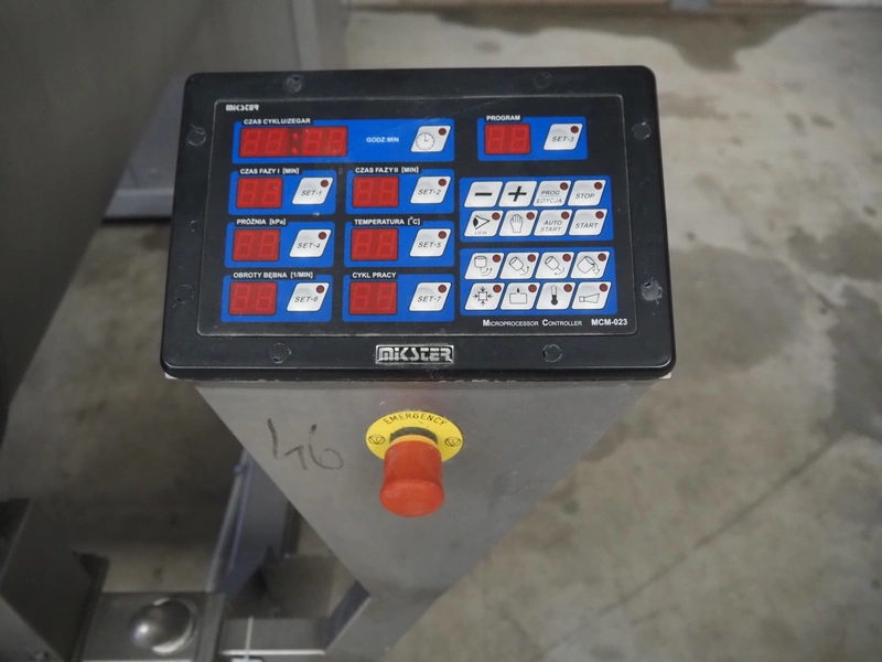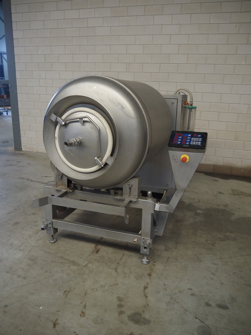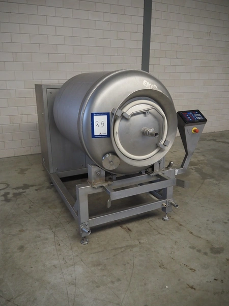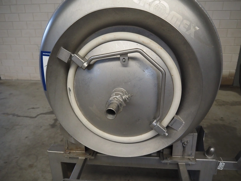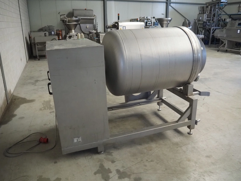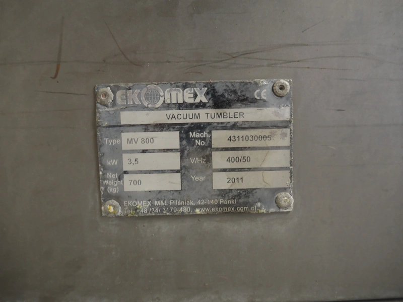 Ekomex vacuum tumbler, type: MV 800, machine number: 4311030005, year of construction: 2011, 400 V, 50 Hz, 3.5 kW, weight: 700 kg, volume: 800 liter, Busch vacuum pump, type: RA 0040 F 503, capacity: 40 m³ per hour, dimensions: 2250 mm x 1400 mm x 1600 mm.