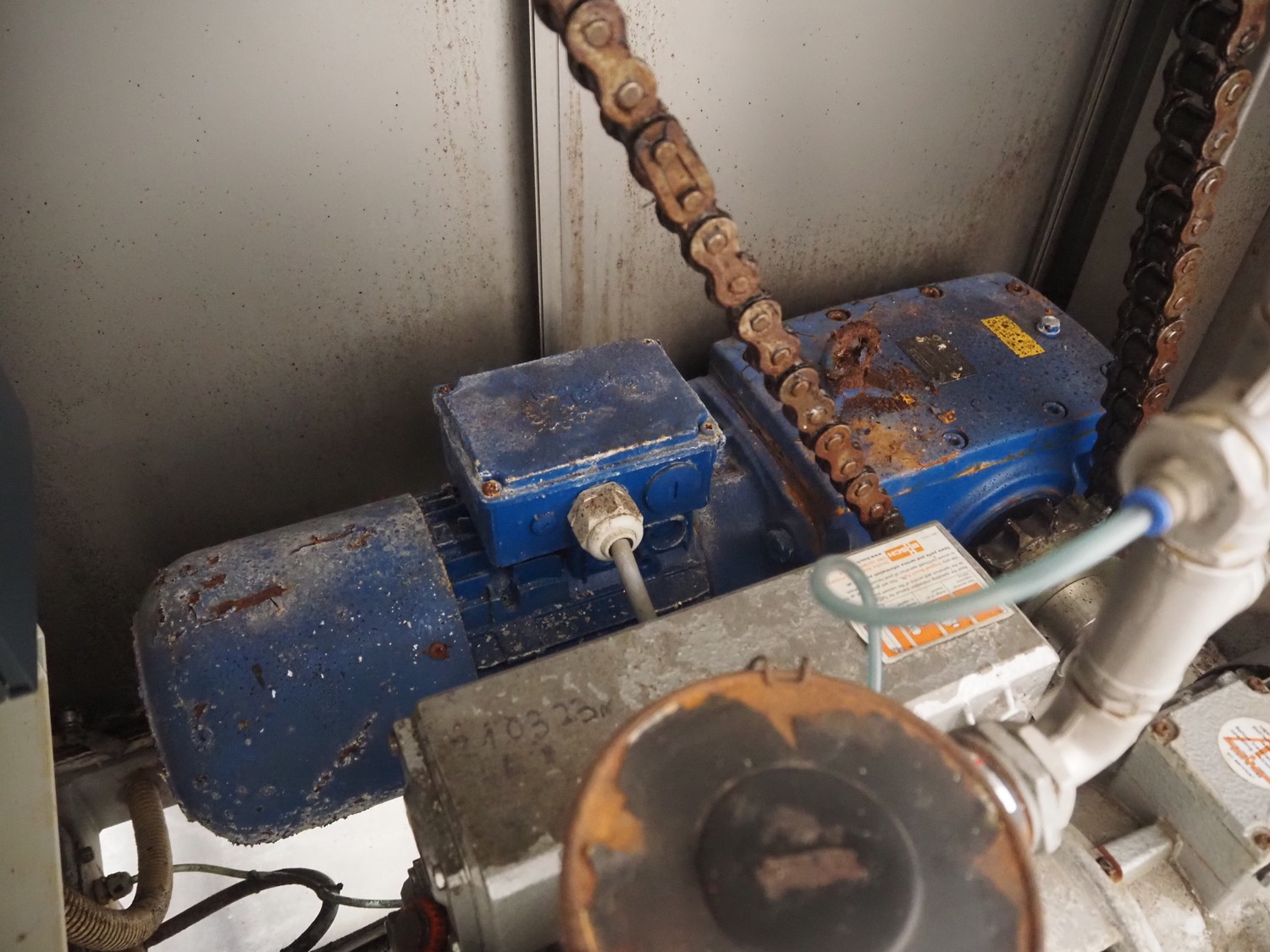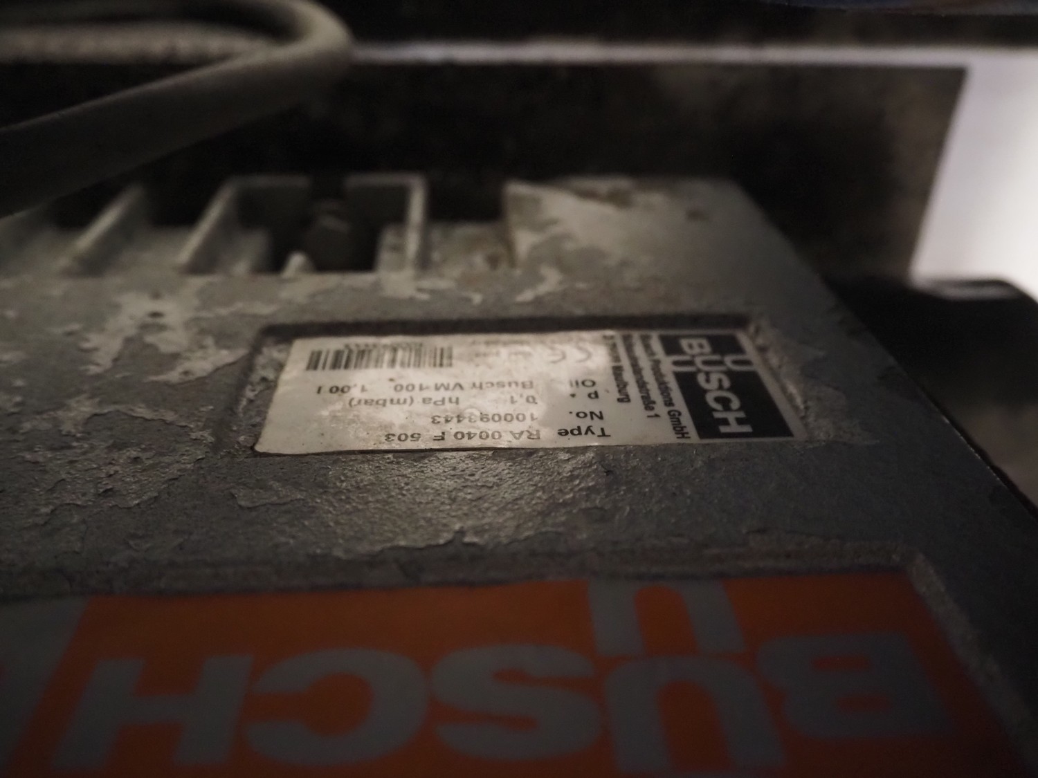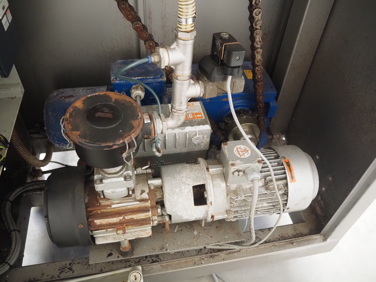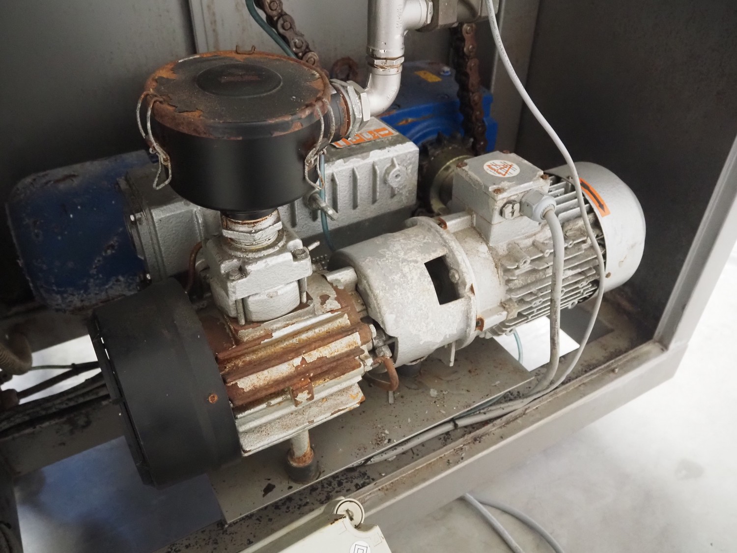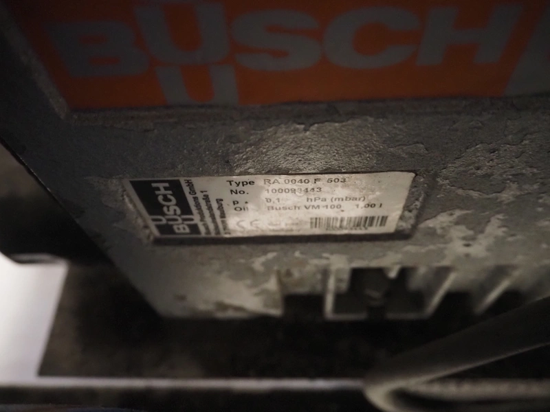 Ekomex vacuum tumbler, type: MV 800, machine number: 4311030005, year of construction: 2011, 400 V, 50 Hz, 3.5 kW, weight: 700 kg, volume: 800 liter, Busch vacuum pump, type: RA 0040 F 503, capacity: 40 m³ per hour, dimensions: 2250 mm x 1400 mm x 1600 mm.