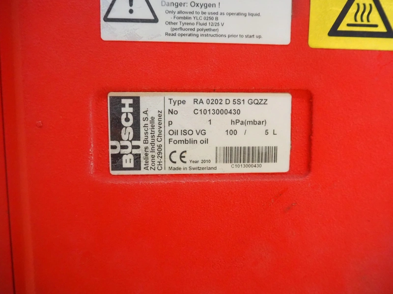 Busch vacuum pump, type: RA 0202 D 5S1 GQZZ, number: C1013000430, year of construction: 2010, capacity: 200 m³ per hour, dimensions: 1200 mm x 600 mm x 700 mm.