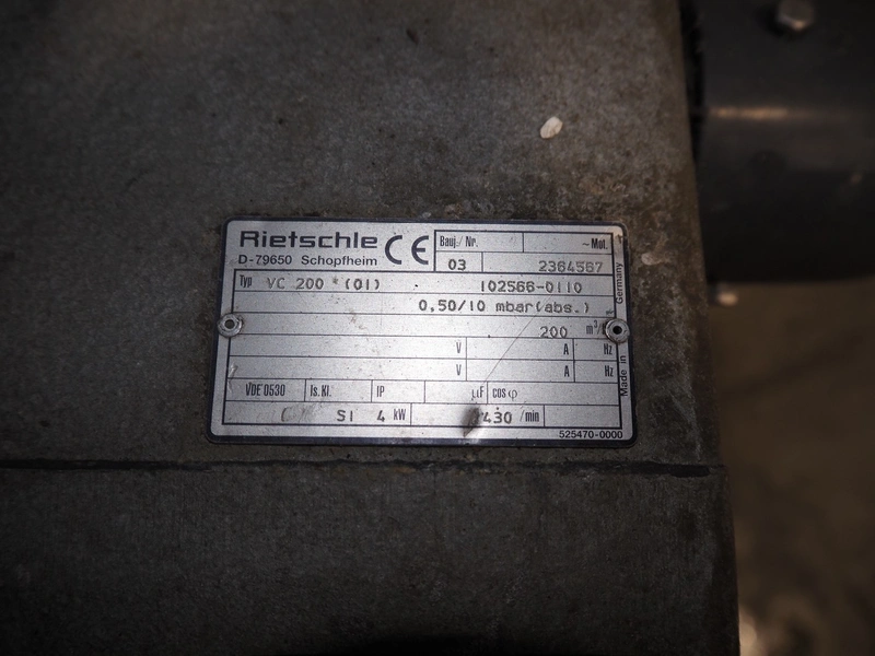 Rietschle vacuum pump, type: VC 200 (01), number: 2364567, year of construction: 2003, capacity: 200 m³ per hour, dimensions: 800 mm x 800 mm x 750 mm.