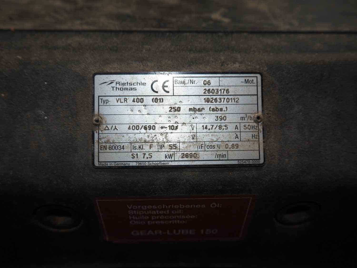 Rietschle vacuum pump, type: VLR 400 (01), number: 2603176, year of construction: 2006, 400/690 V, 3 Ph, 50 Hz, 14.7/8.5 A, 7.5 kW, capacity: 390 m³ per hour, dimensions: 1150 mm x 800 mm x 600 mm.