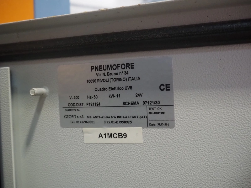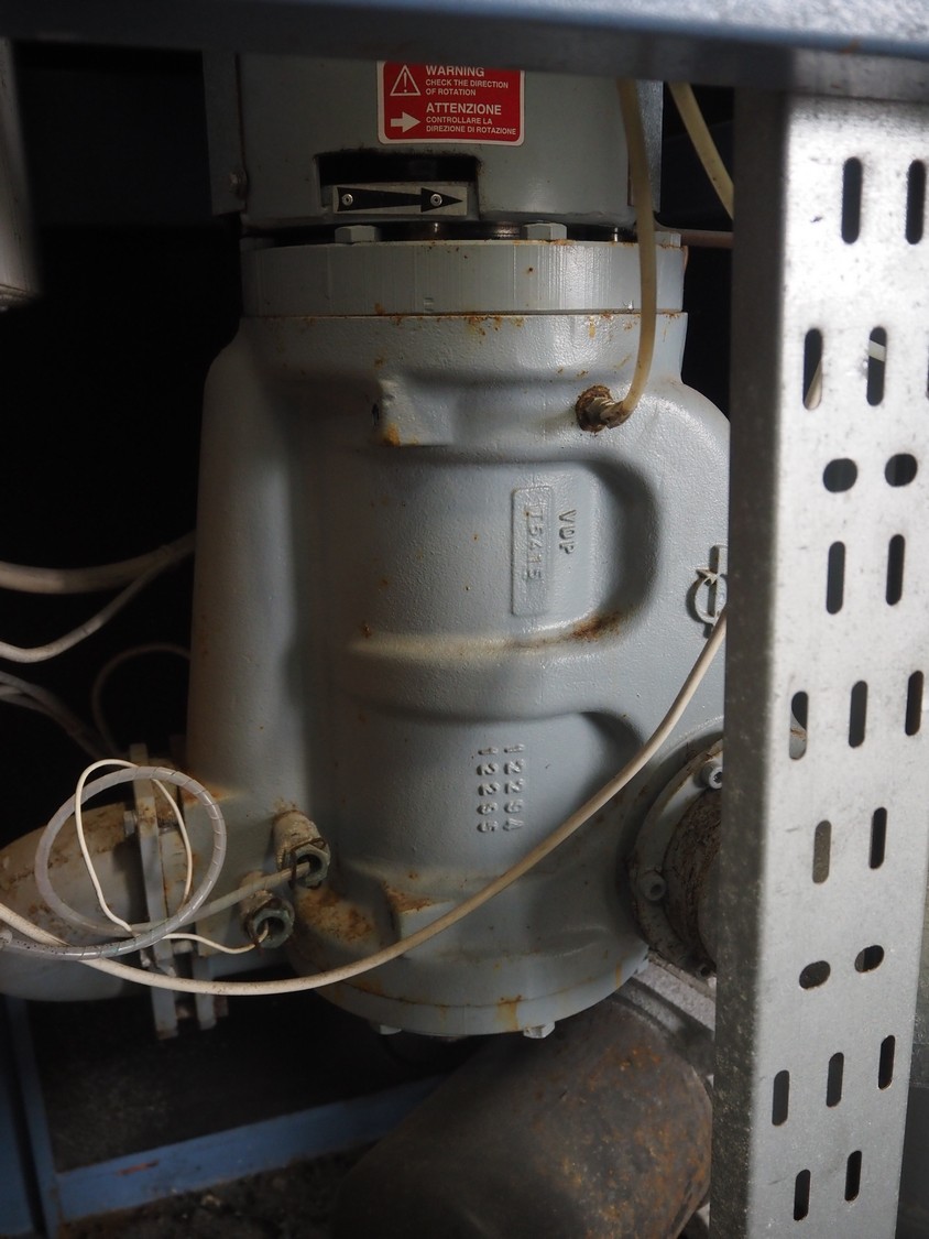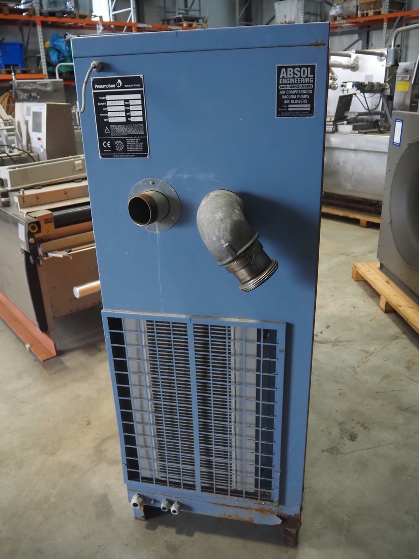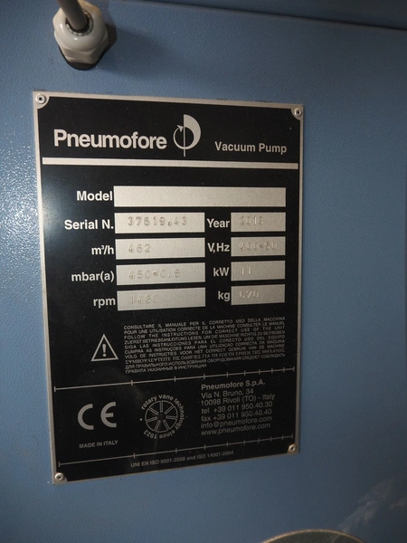 Pneumofore rotary vane vacuum pump, type: UV8 serial number: 37619.43, year of construction: 2013, 400 V, 50 Hz, 11 kW, 1460 rpm, weight: 670 kg, capacity: 462 m³ per hour total dimensions: 1590 mm x 780 mm x 1780 mm.