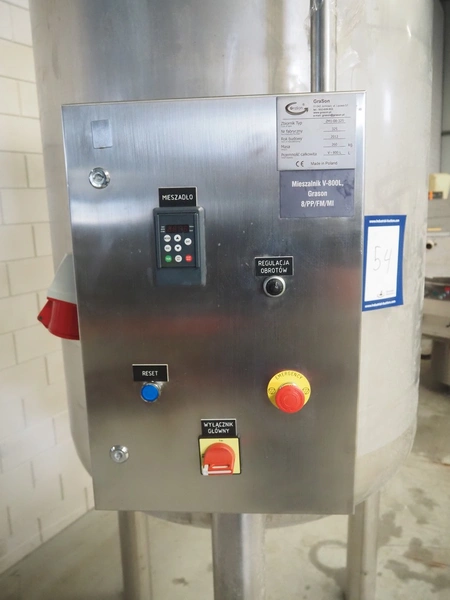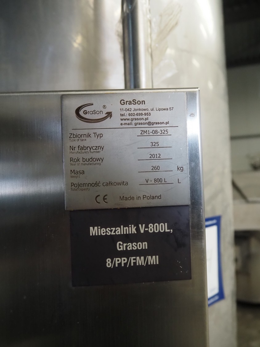 Grason s/s mixing tank, type: ZM1-08-325, number: 325, year of construction: 2012, capacity: 800 liter, weight: 260 kg, dimensions: 1400 mm x 1200 mm x 2700 mm.