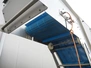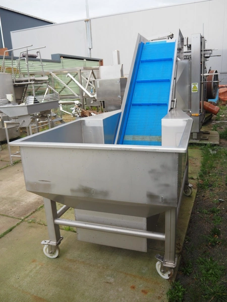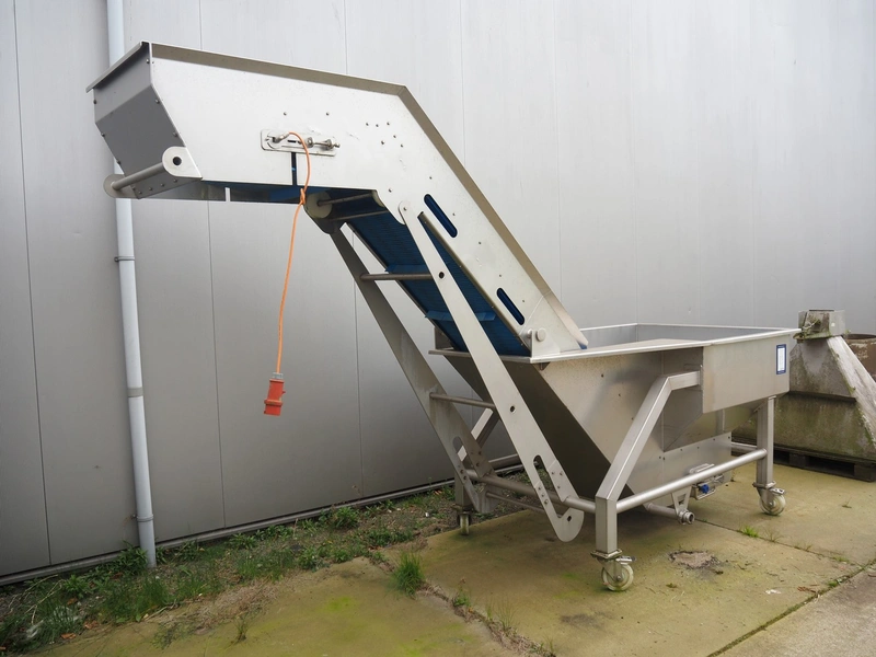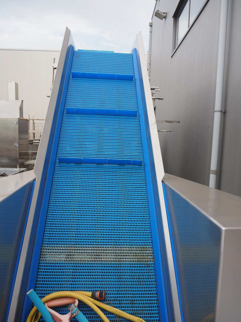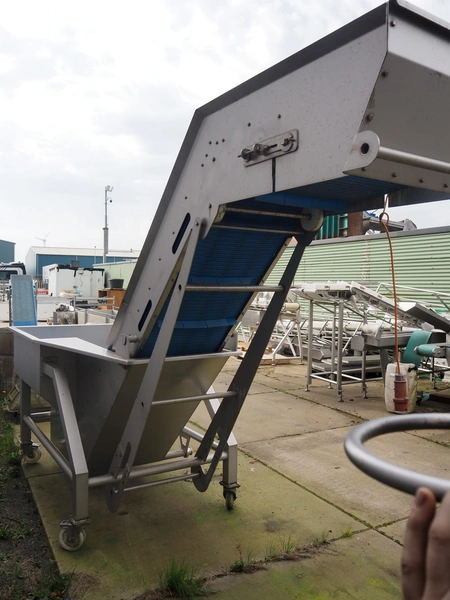Mobile elevating belt, s/s frame, plastic mesh belt with dividers, belt width: 525 mm, divider height: 50 mm, distance between dividers: 470 mm, elevating height: 2300 mm, total dimensions: 4100 mm x 1350 mm x 2550 mm.