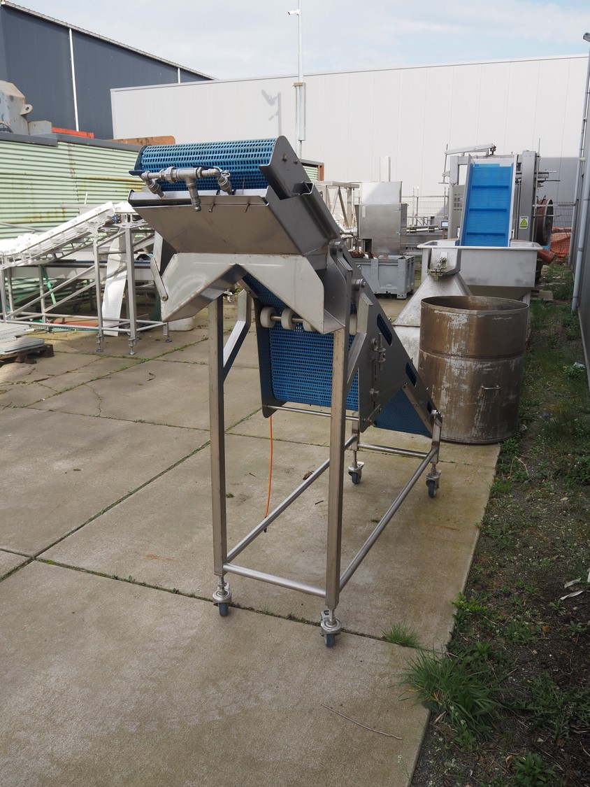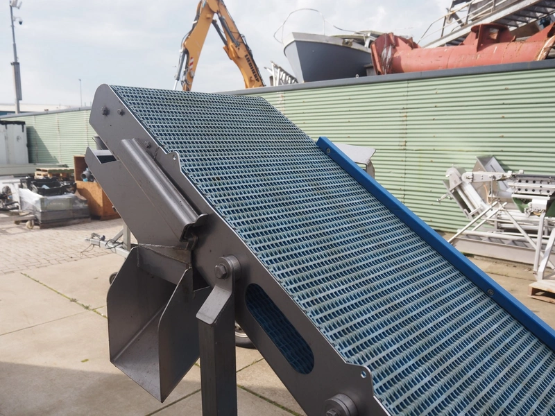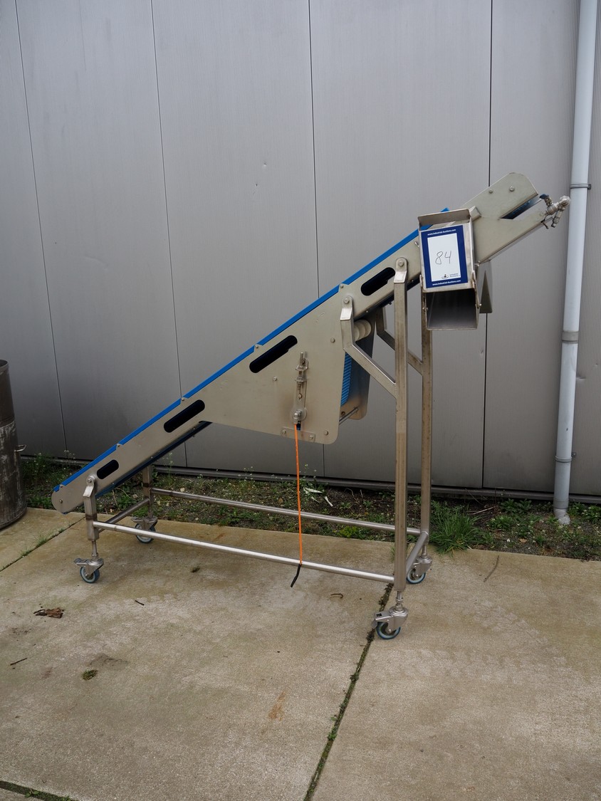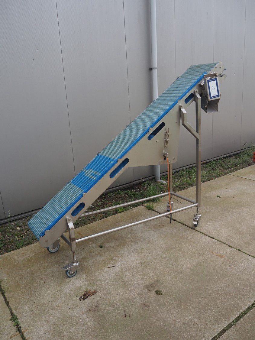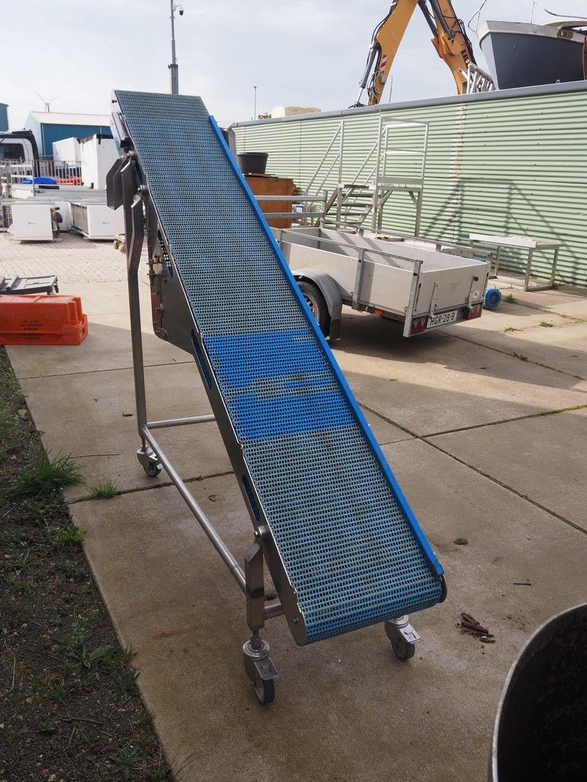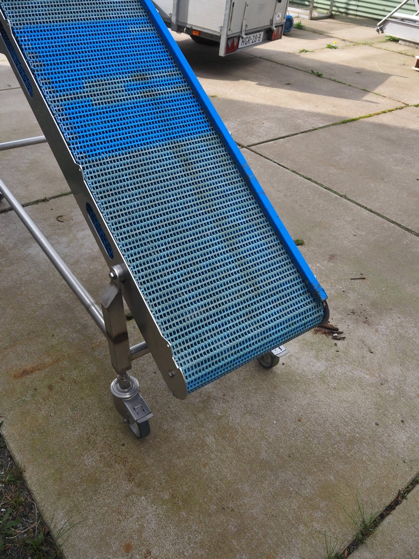 Mobile elevating belt, s/s frame, plastic mesh belt, belt width: 385 mm, elevating height: 1800 mm, total dimensions: 2400 mm x 500 mm x 1800 mm.