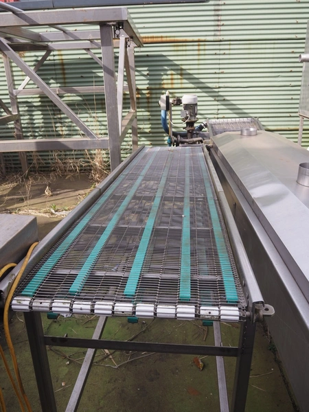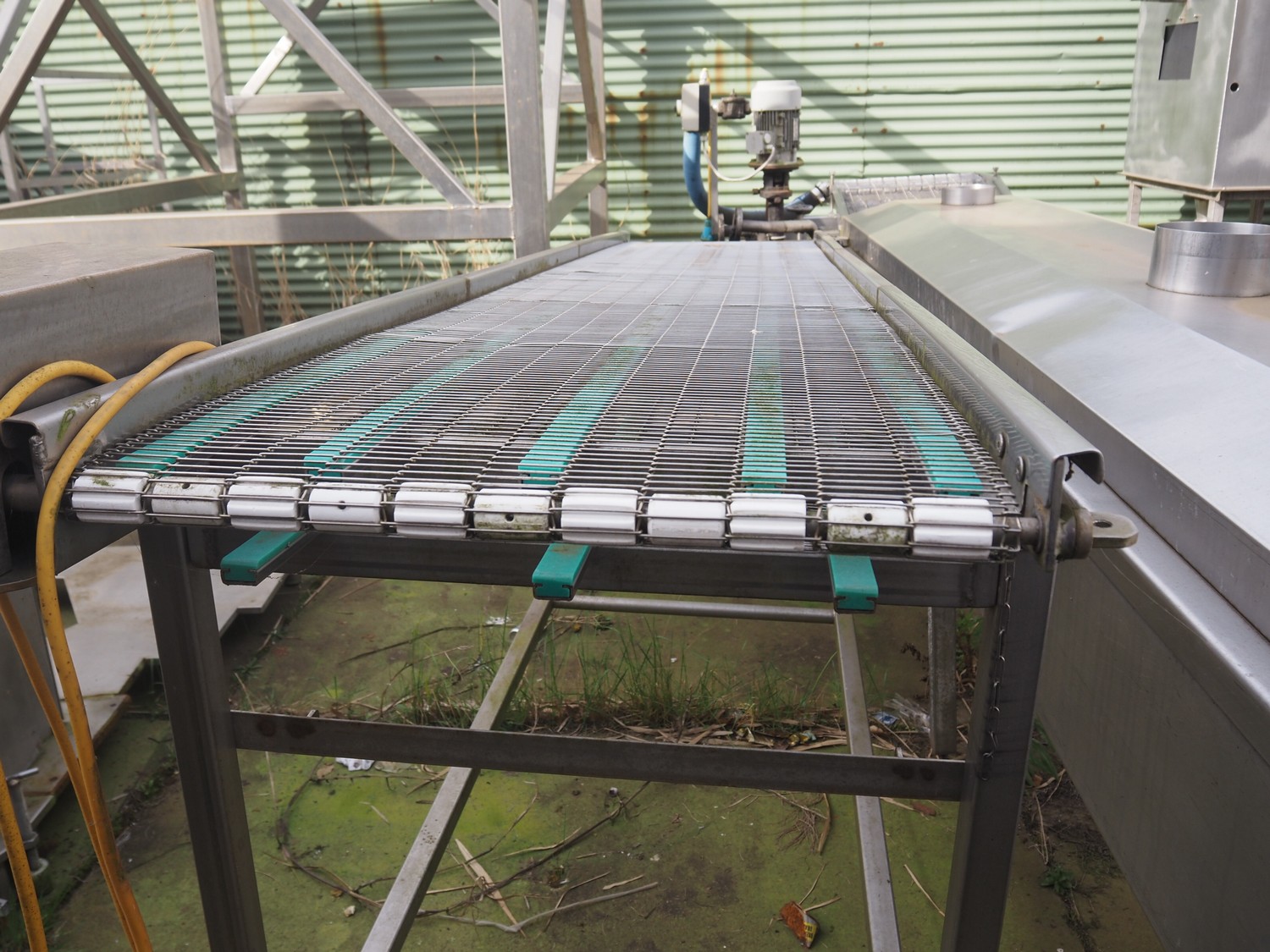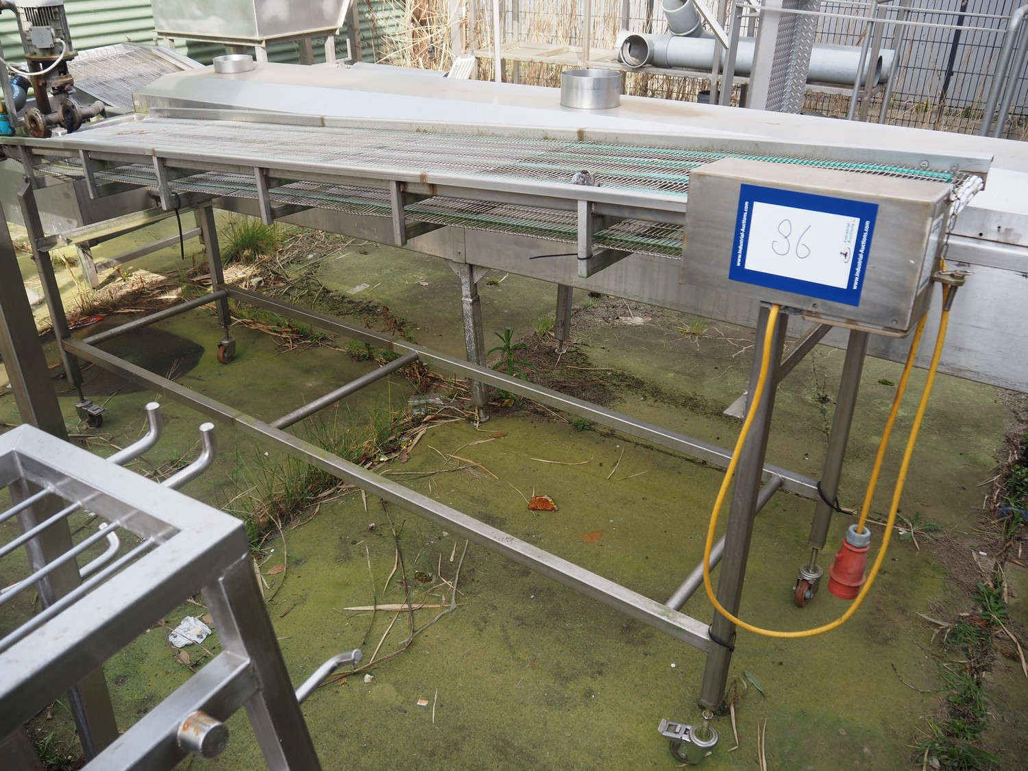 Mobile s/s mesh belt, belt width: 600 mm, total dimensions: 3000 mm x 890 mm x 1400 mm.