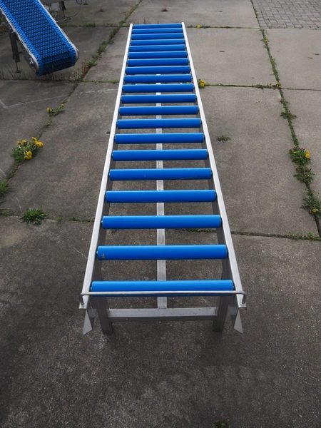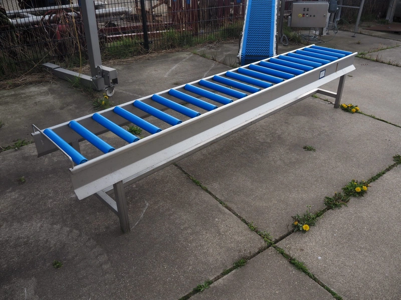 Roller conveyor, s/s frame, plastic rollers, roller width: 450 mm, total dimensions: 3000 mm x 520 mm x 580 mm.