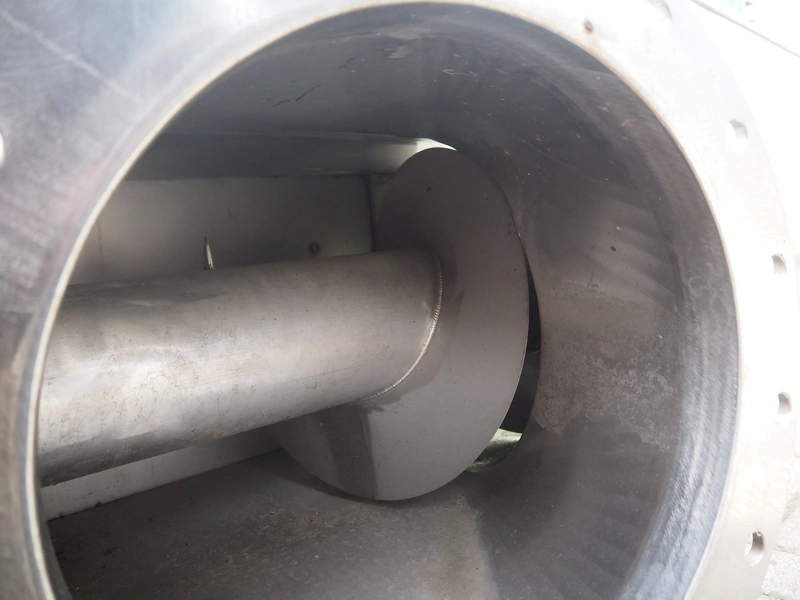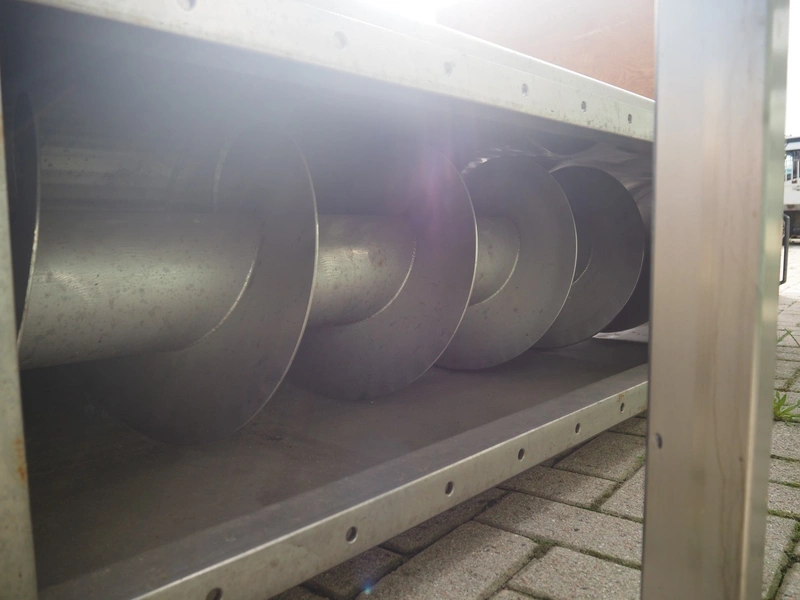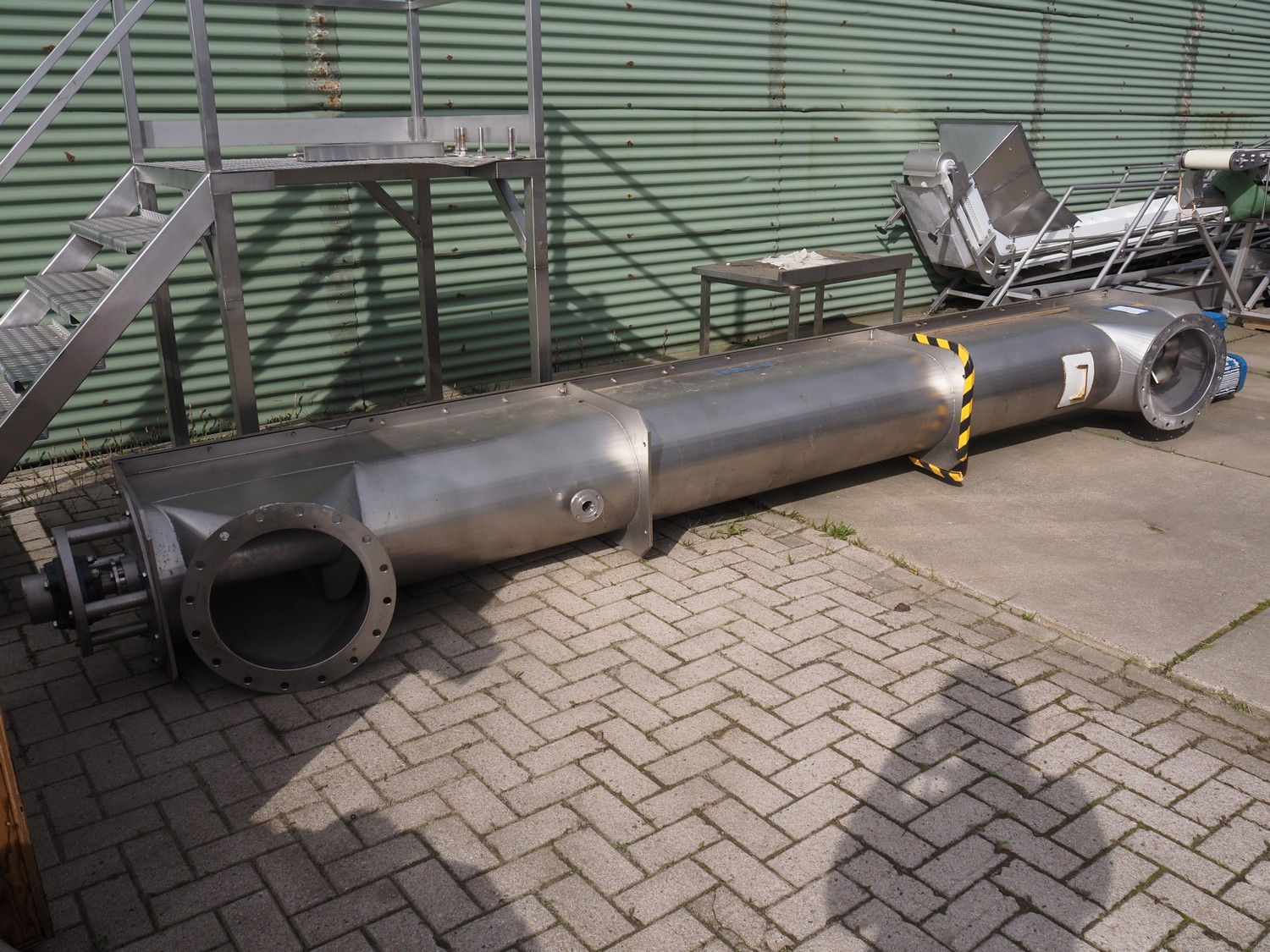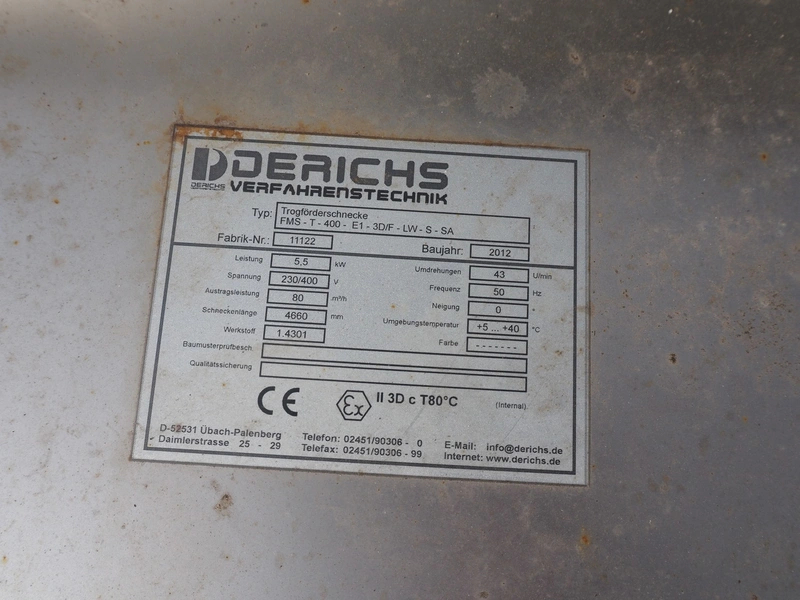 Derichs transport screw, type: FMS-T-400-E1-3D/F-LW-S-SA, factory number: 11122, year of construction: 2012, 230/400 V, 50 Hz, 5,5 kW, s/s screw, screw diameter: 450 mm, tier: 270 mm, total dimensions: 5800 mm x 700 mm x 530 mm.