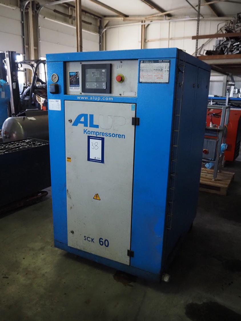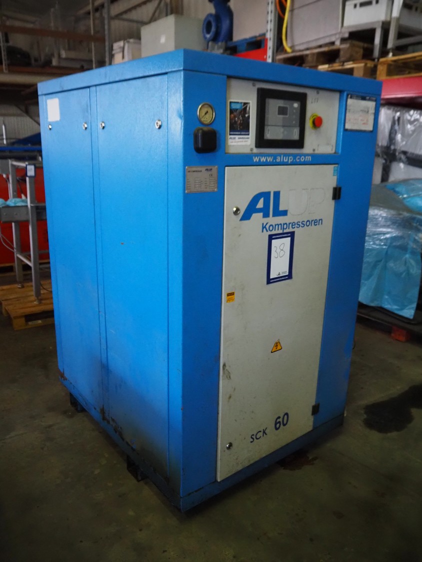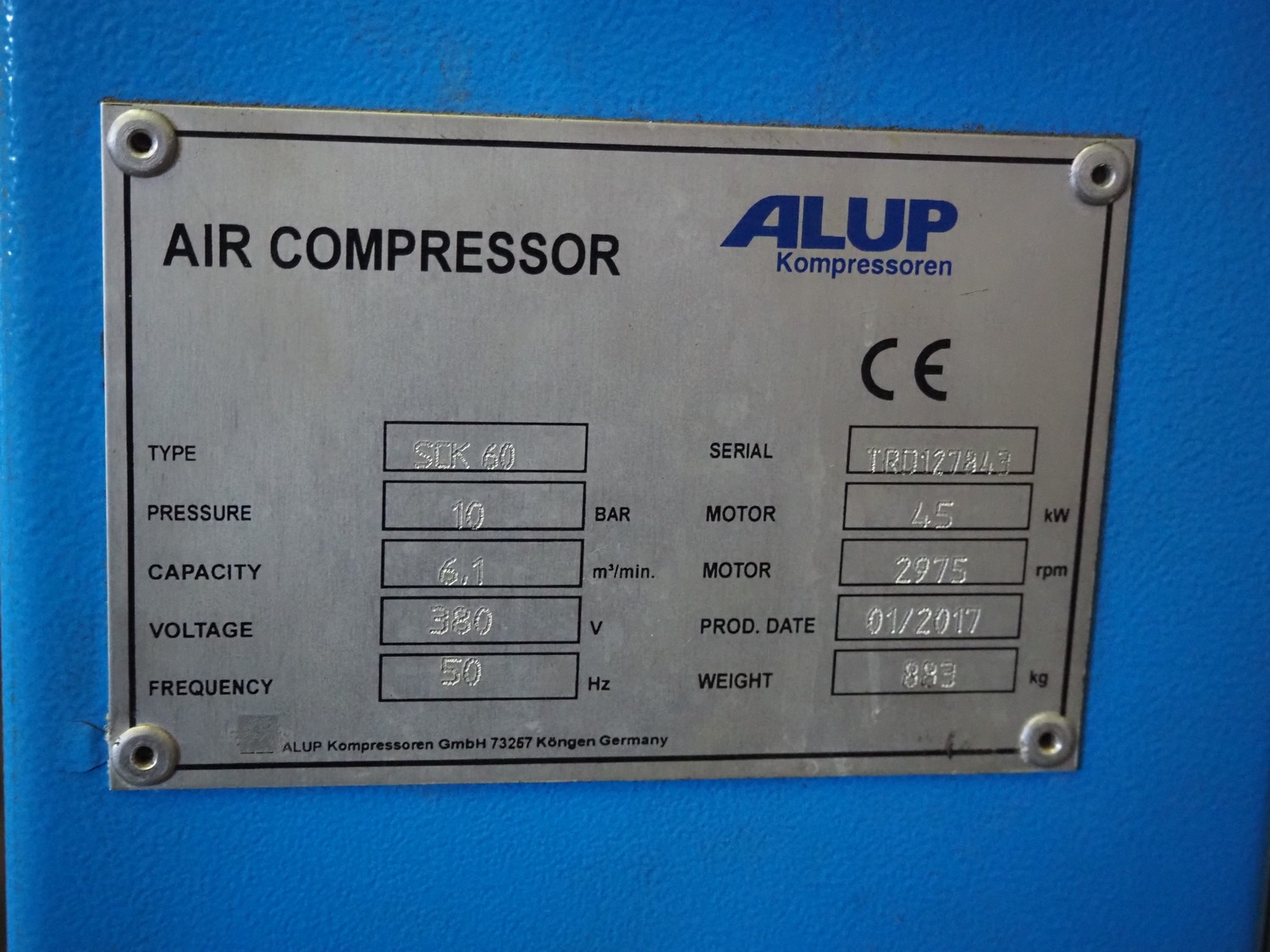 Alup Kompressoren GmbH screw compressor, type: SCK60, serial number: TRU127843, year of construction: 01/2017, 380 V, 50 Hz, 45 kW, capacity: 6.1 m³ per minute, 10 bar, dimensions: 1300 mm x 1000 mm x 1770 mm.