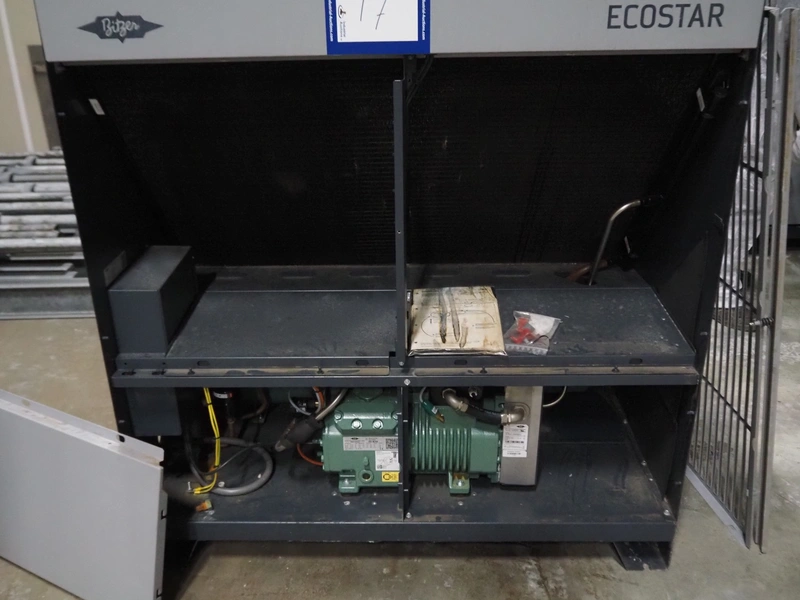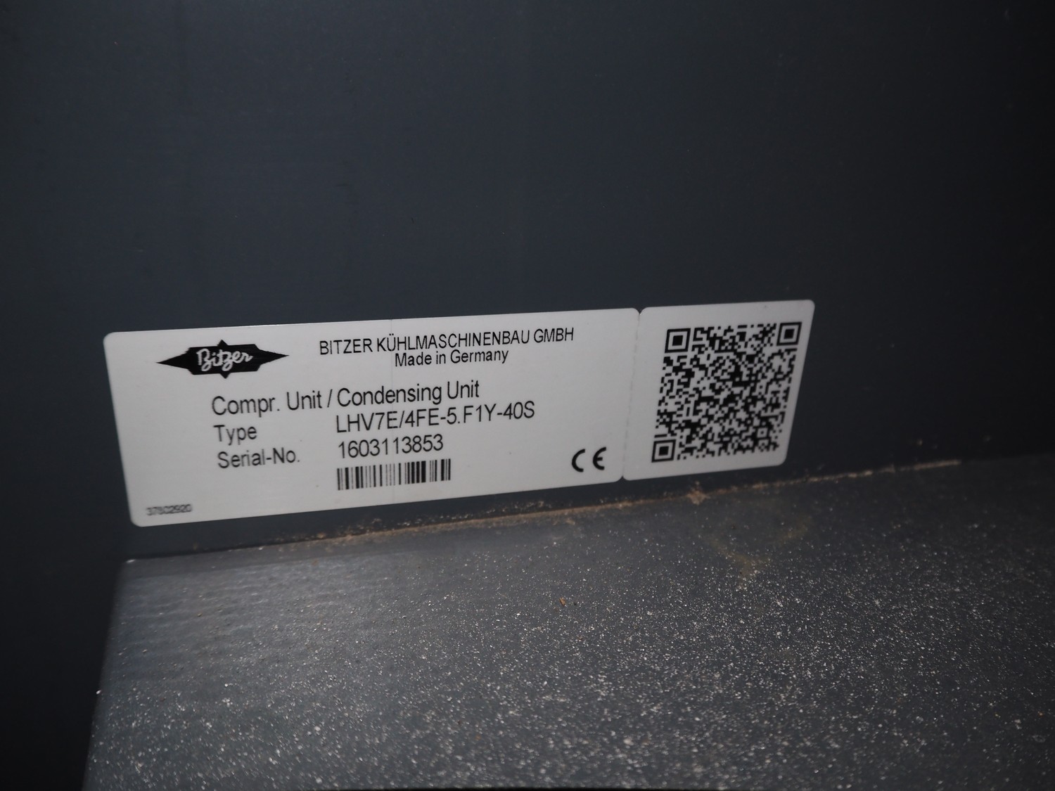 Bitzer Kühlmaschinenbau GmbH condensing unit, type: LHV7E/4FE-5.F1Y-40S, serial number: 1603113853, Bitzer Kühlmaschinenbau GmbH cooling compressor, type: 4FE-5.F1Y-40S, capacity: 18.1/21.8 m³ per hour, dimensions: 1350 mm x 700 mm x 1700 mm. Never used.