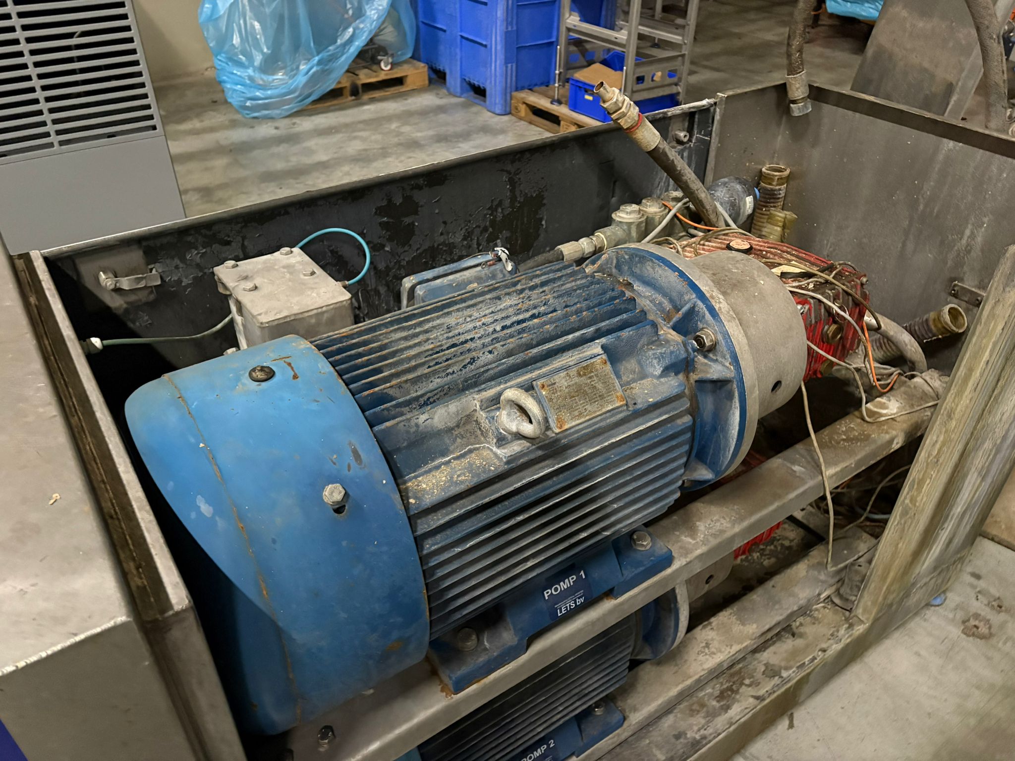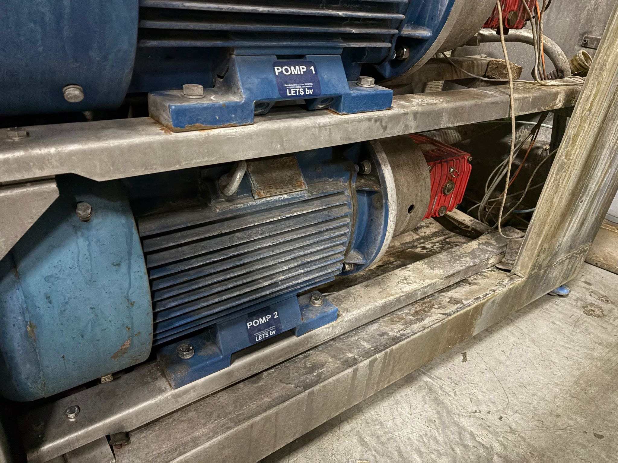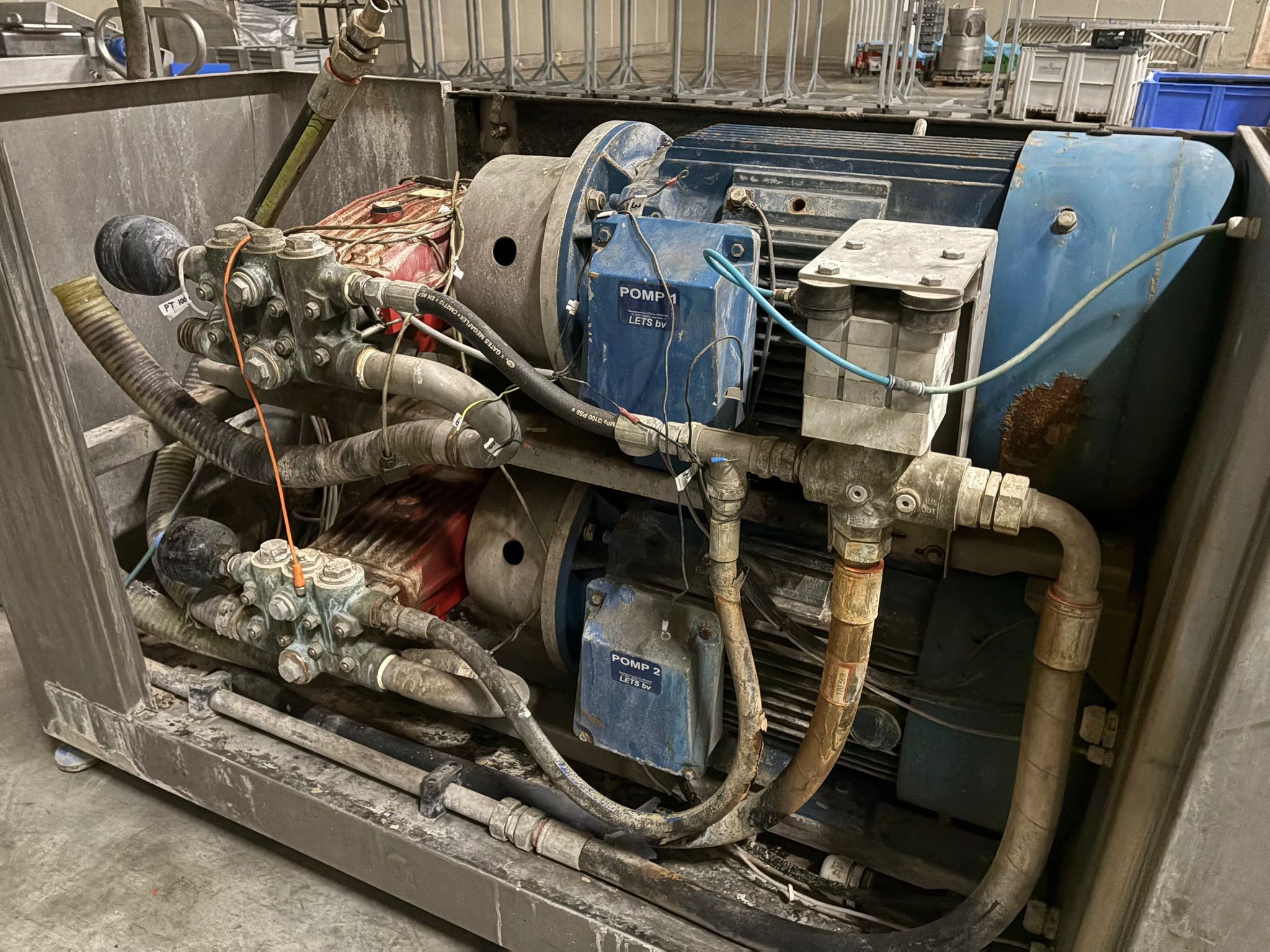 Lets BV high pressure unit with buffer tank, dimensions high pressure unit: 2150 mm x 800 mm x 2190 mm, dimensions buffer tank: 1400 mm x 800 mm x 500 mm.