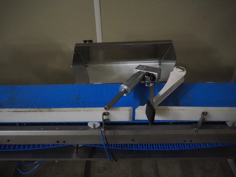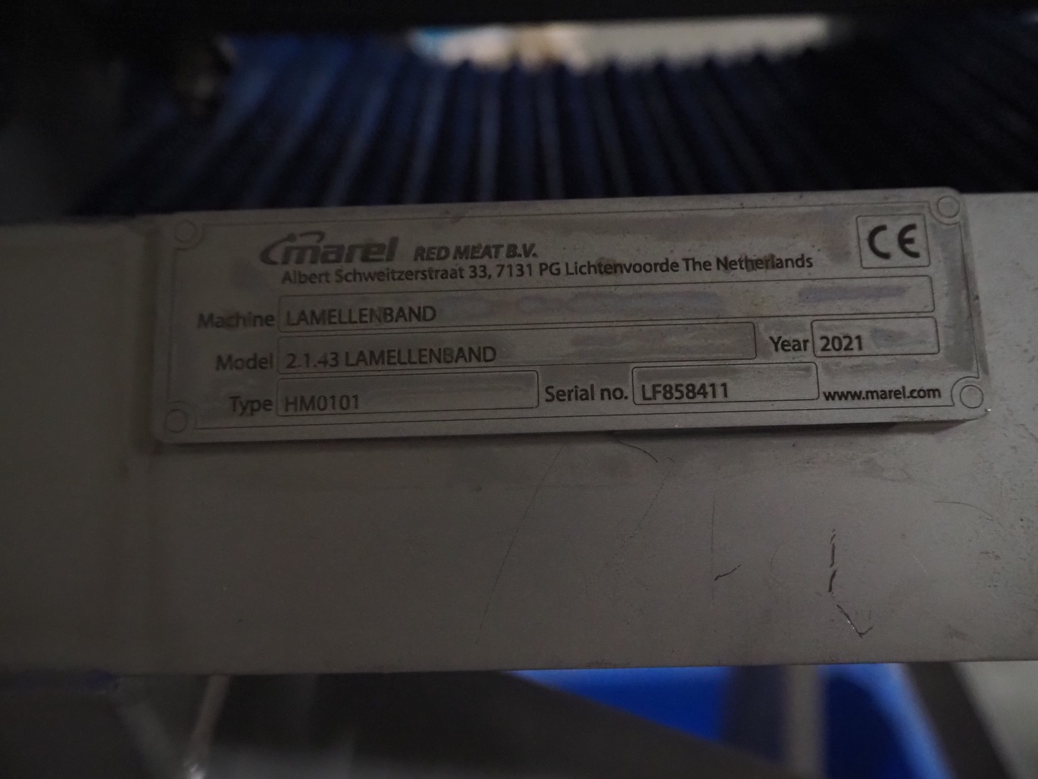 - Marel outfeed belt, model: 2.1.43 LAMELLENBAND, type: HM0101, serial number: LF858411, year of construction: 2021, plastic belt, belt width: 300 mm, total dimensions: 1400 mm x 500 mm x 1800 mm.
