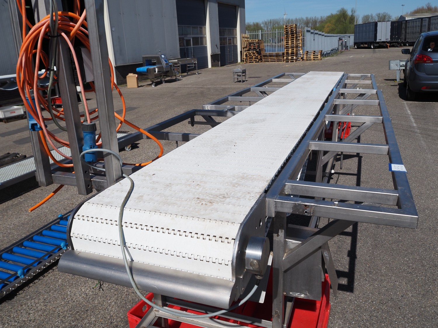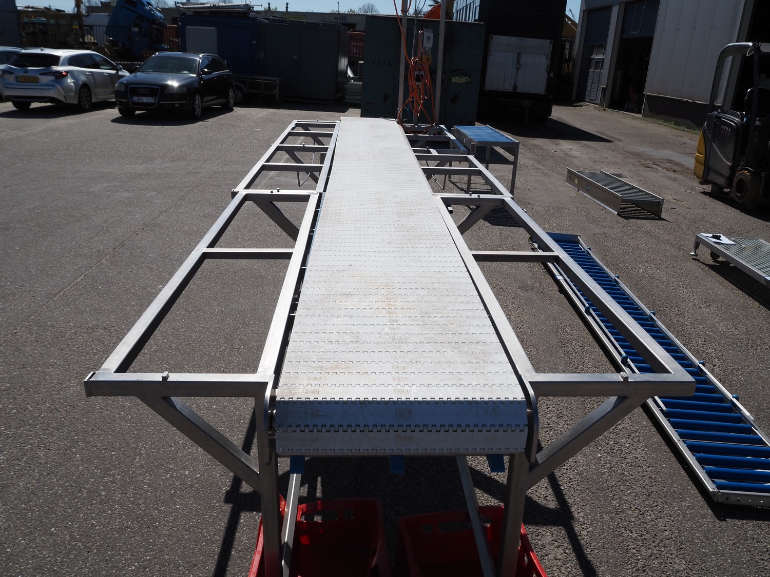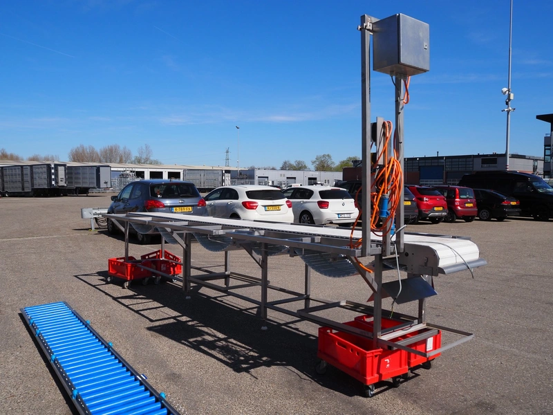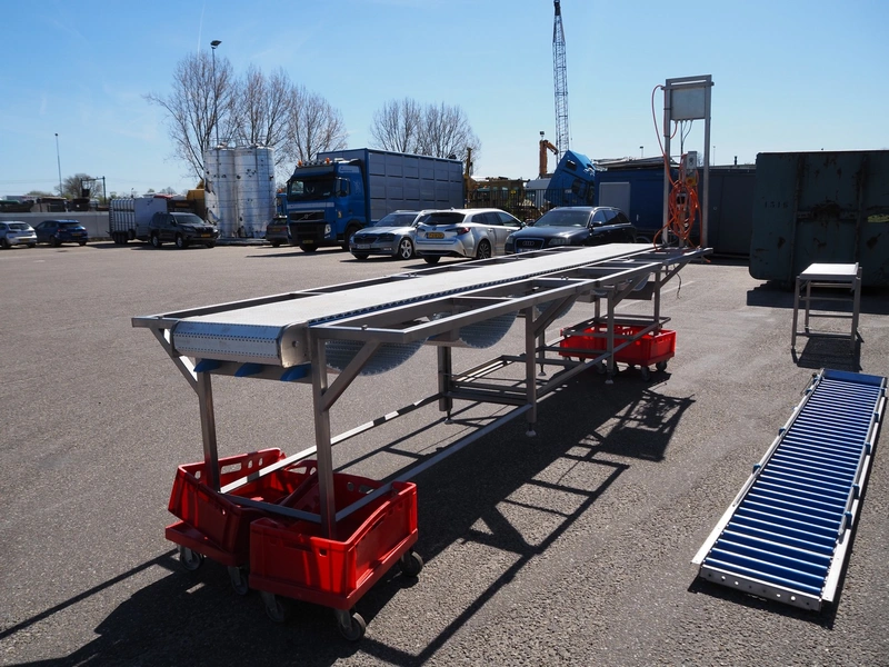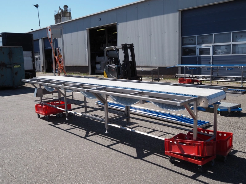Deboning belt, s/s frame, plastic belt, belt width: 500 mm, total dimensions: 5400 mm x 1400 mm x 2550 mm. Missing cutting plates.