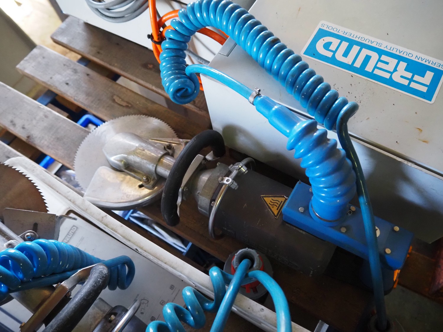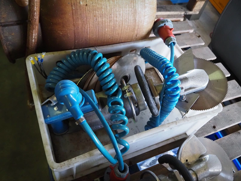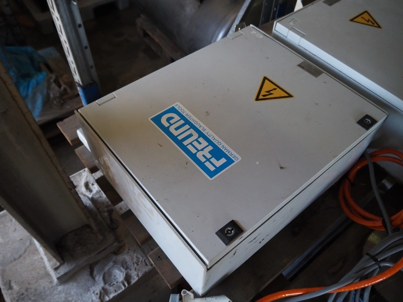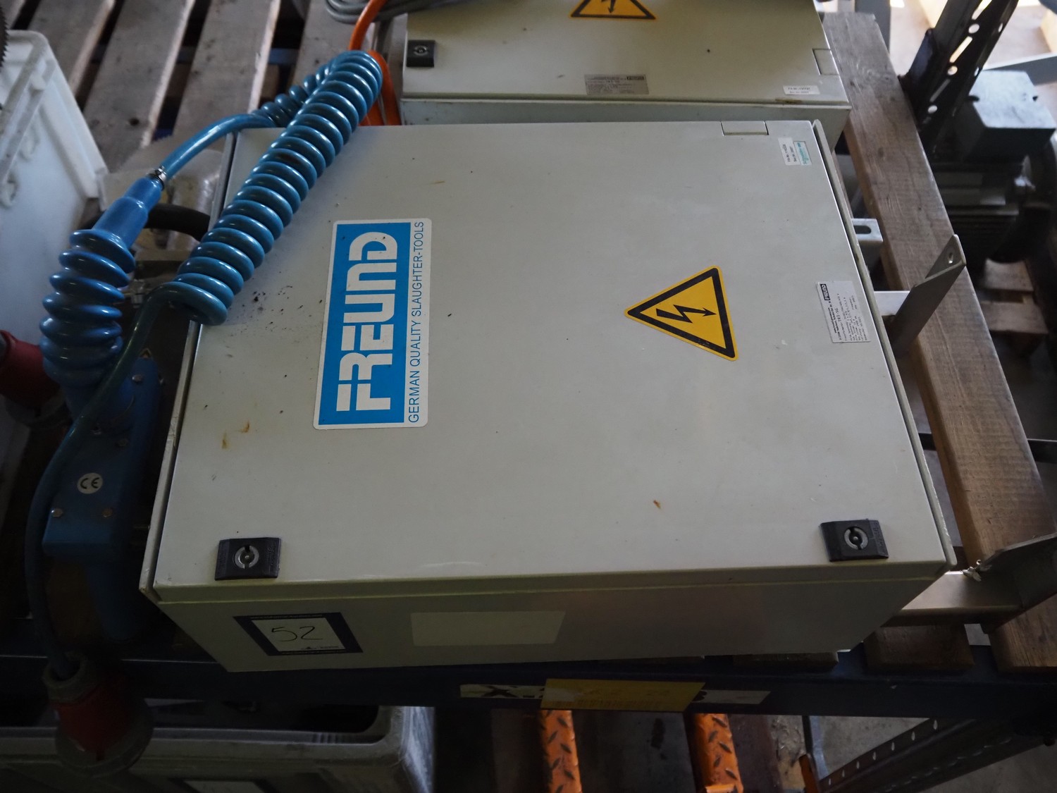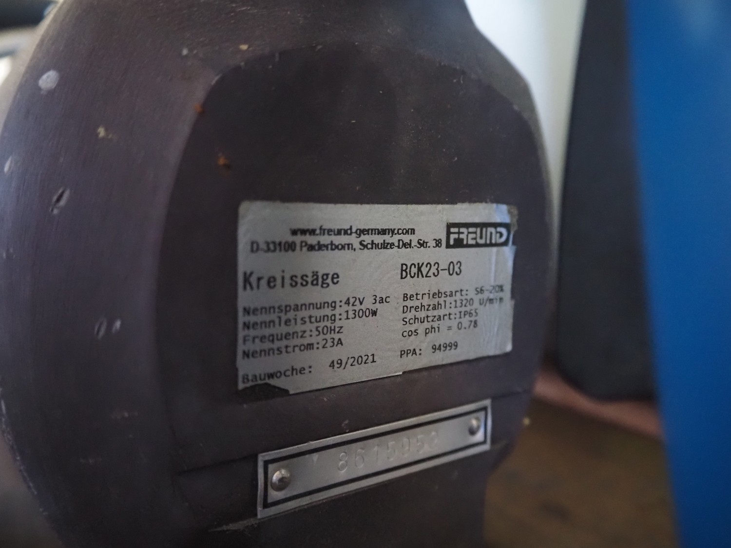 2 Freund splitting saws 2 with control cabinets, type saw: BCK23-03, year of construction: 49/2021, dimensions saw: (2x) 700 mm x 220 mm x 300 mm, dimensions control cabinet: (2x) 530 mm x 430 mm x 200 mm.
