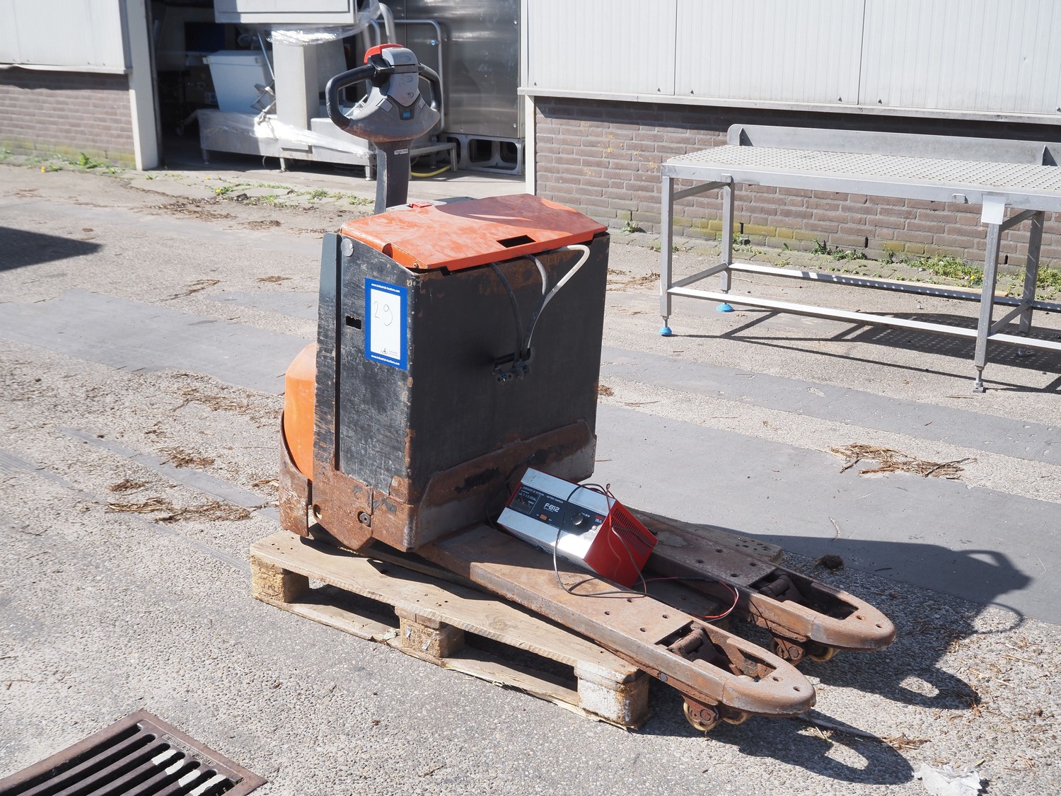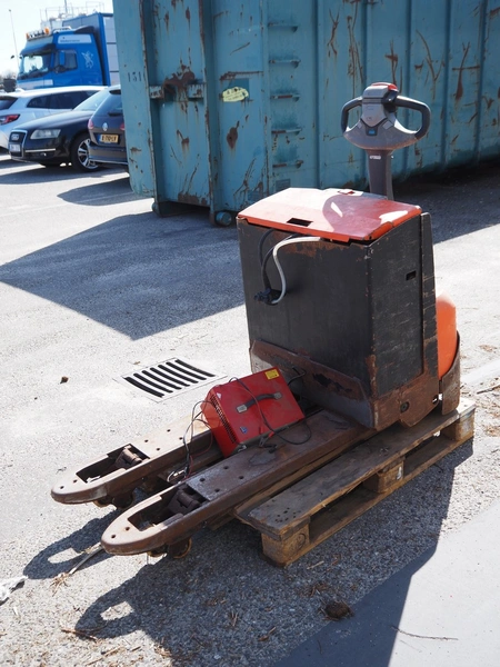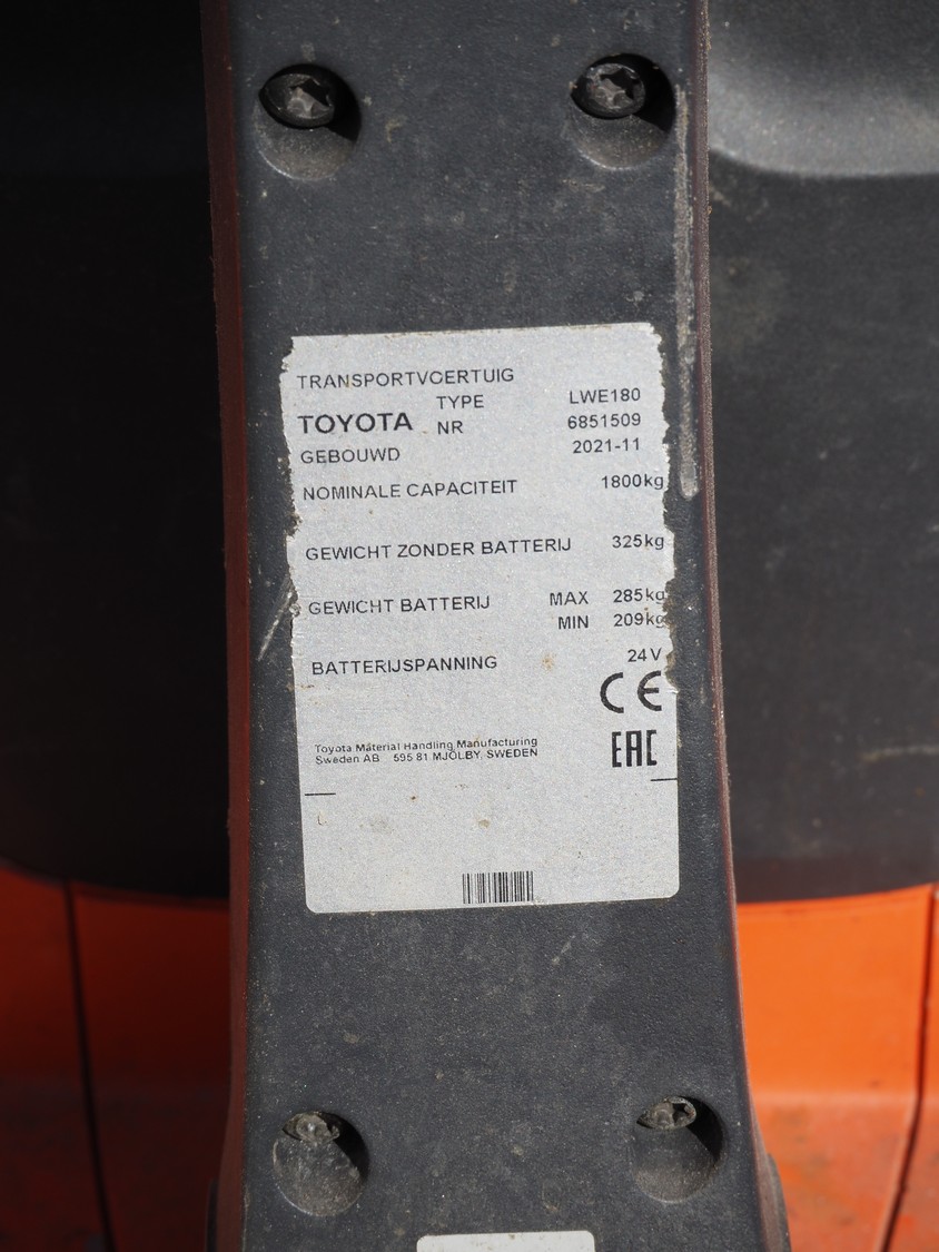 Toyota electric pallet lifter, type: LWE180, number: 6851509, year of construction: 2011-11, capacity: 1800 kg, fork length: 1000 mm, total dimensions: 1600 mm x 700 mm x 1450 mm. Including charger. Technical condition unknown.