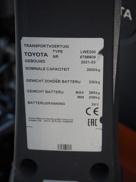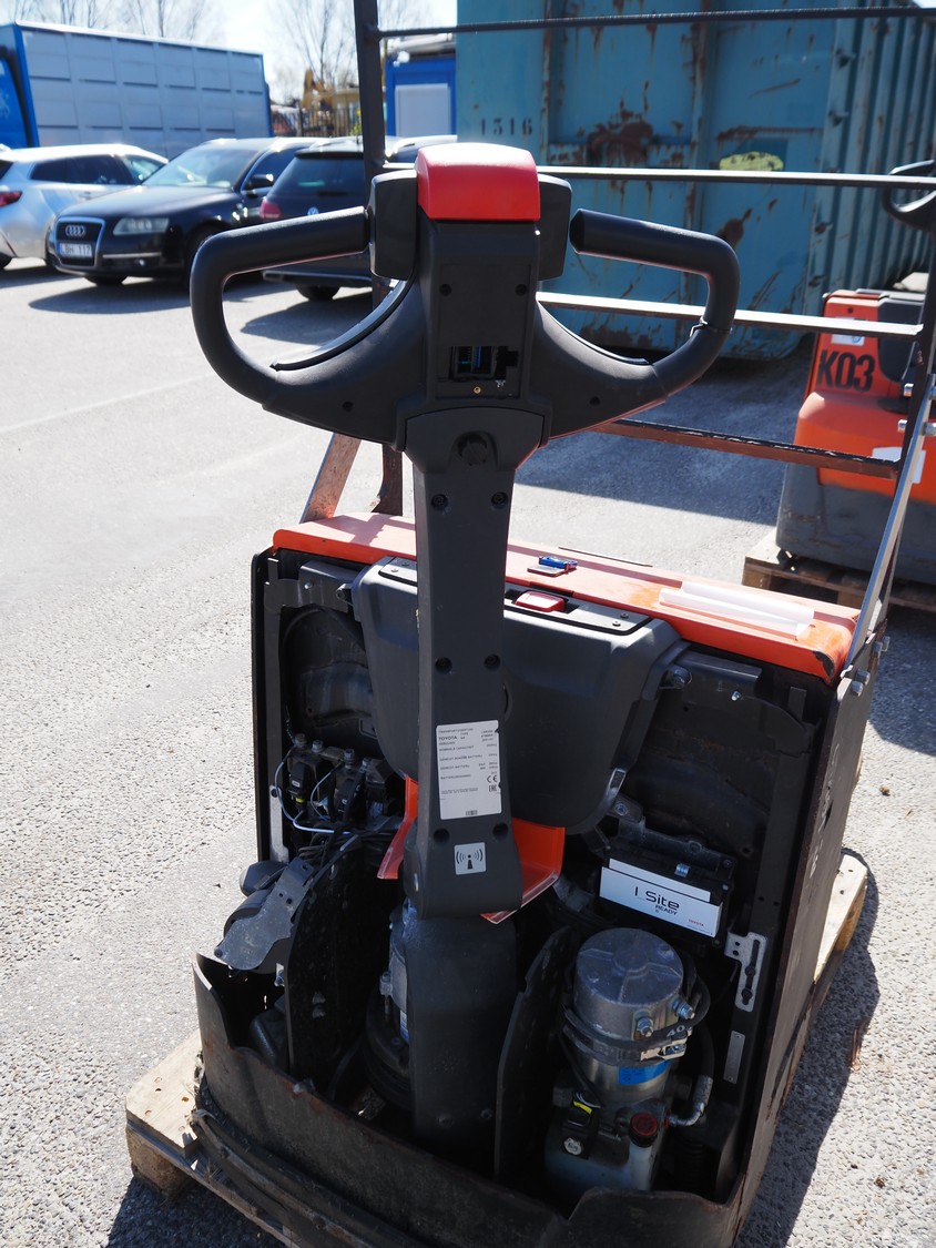 Toyota electric pallet lifter, type: LWE200, number: 6798809, year of construction: 2021-03, capacity: 2000 kg, fork length: 1000 mm, total dimensions: 1550 mm x 750 mm x 1550 mm. Without charger. Technical condition unknown.