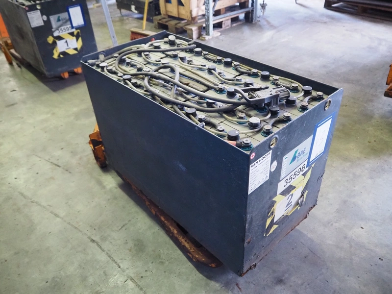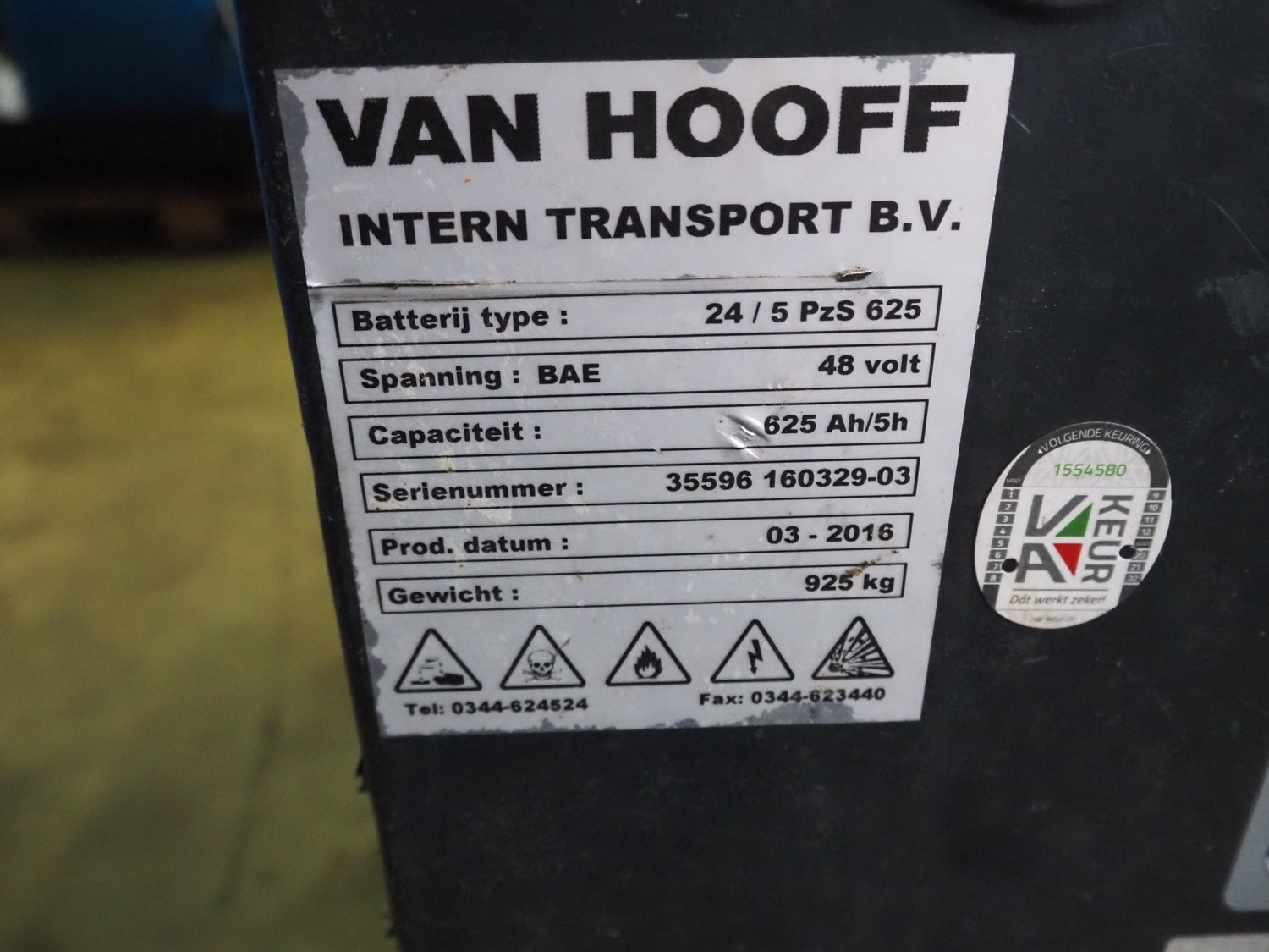 Van Hoof accu, type: 24/5 PzS 625, serial number: 35596 160329-03, year of construction: 03-2016, 48 V, capacity: 625Ah/5h, weight: 925 kg, dimensions: 1020 mm x 530 mm x 660 mm.