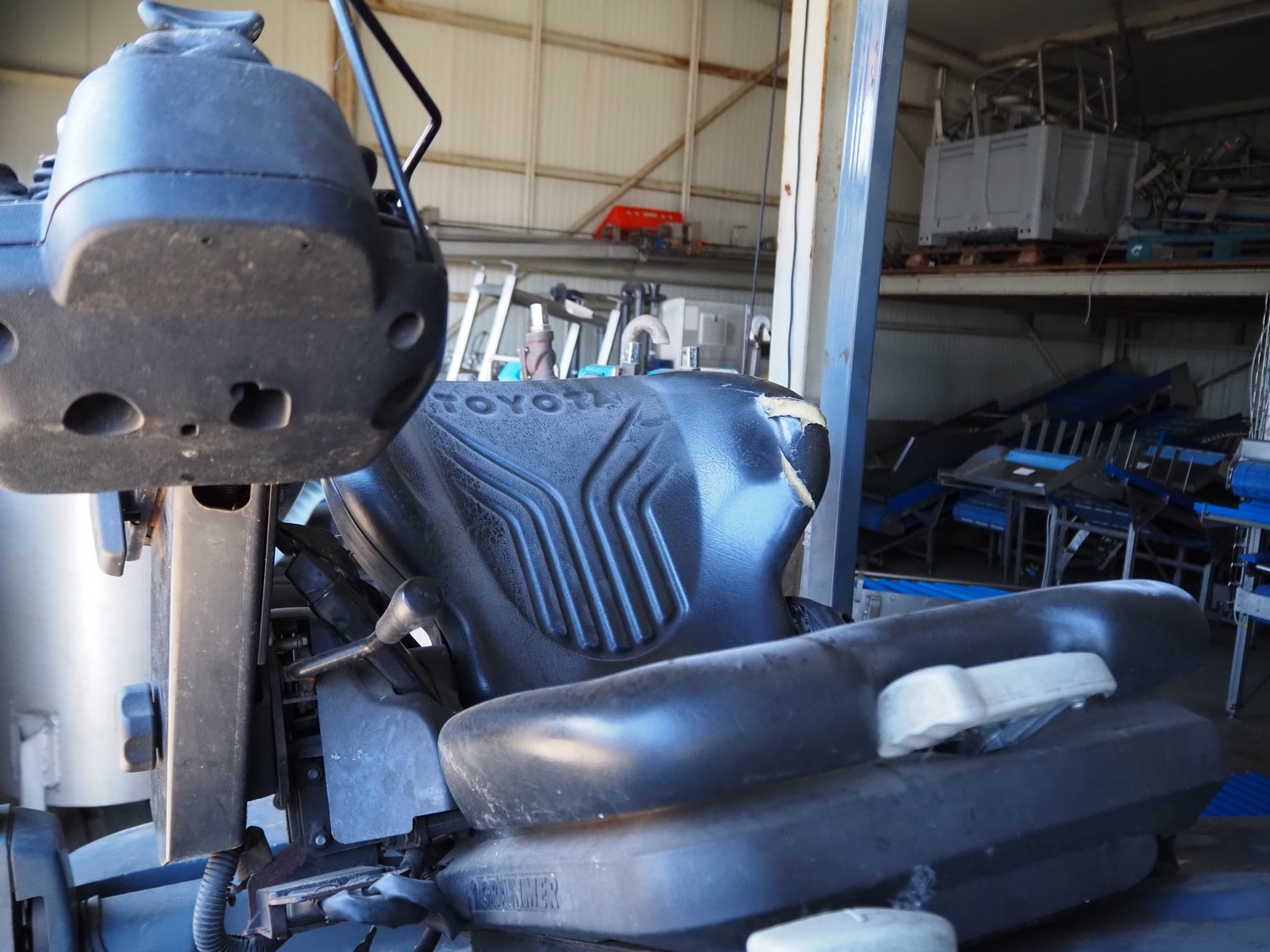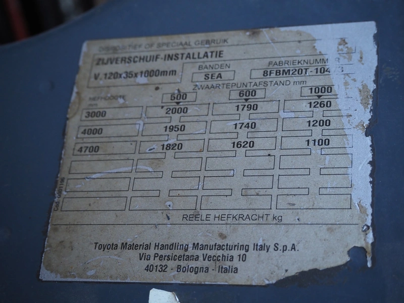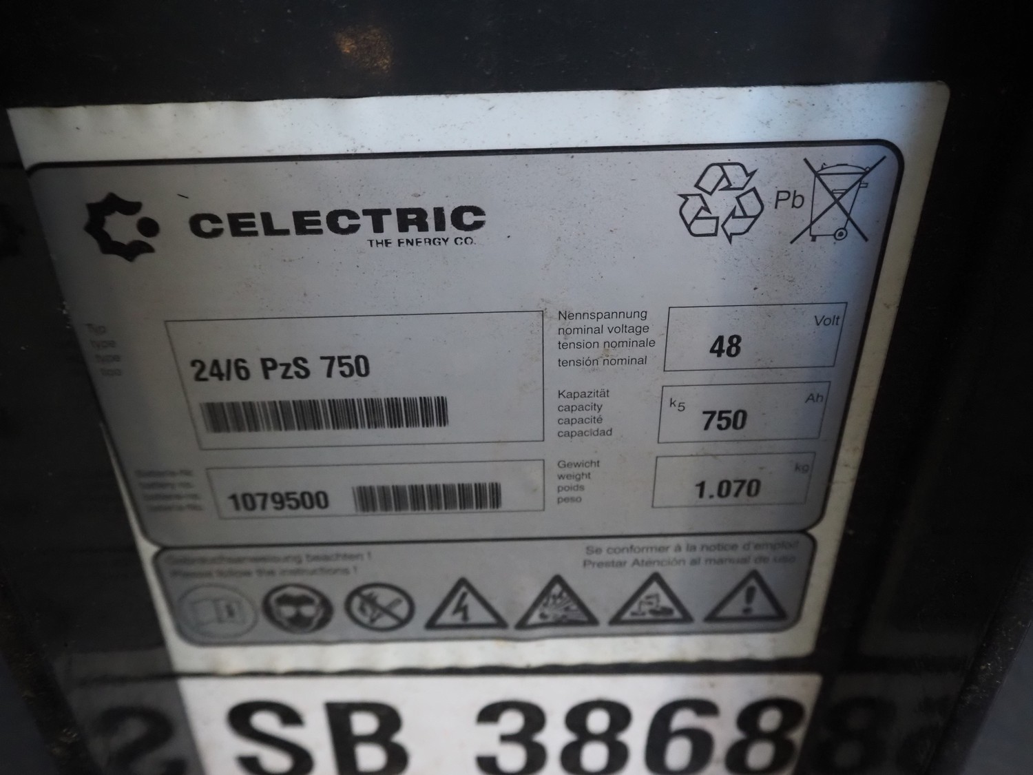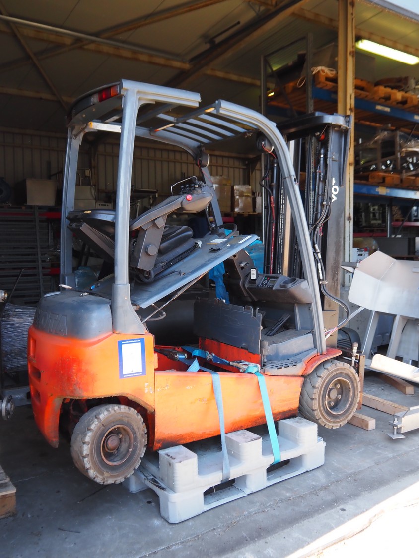 Toyota forklift, fabrication number: 8FBM20T-10423, capacity: 2000 kg, dimensions: 2100 mm x 1000 mm x 2100 mm. With Celectric accu, type: 24/6 PzS 750, 48 V, 750 Ah, weight: 1070 kg, dimensions: 750 mm x 900 mm x 1100 mm. Technical condition unknown. Without forks.