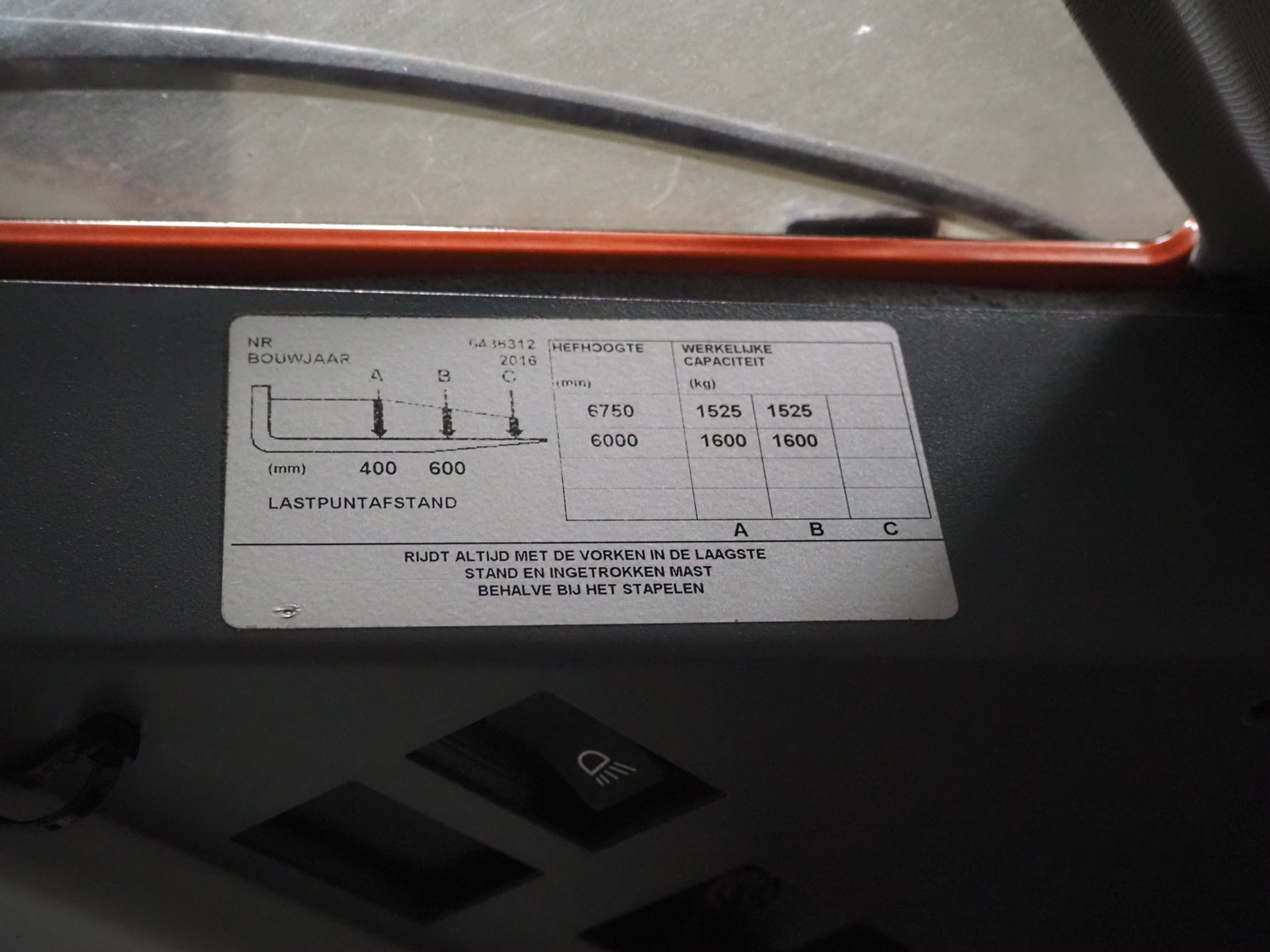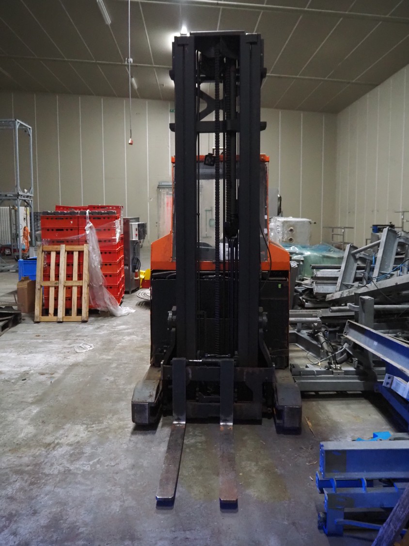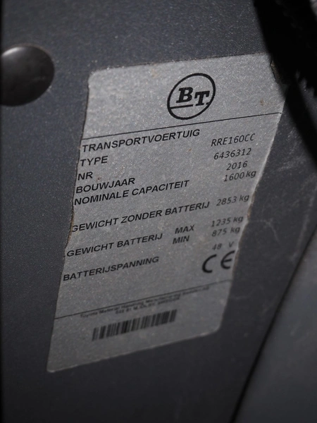 BT reach truck, type: RRE160CC, number: 6436312, year of construction: 2016, capacity: 1600 kg, fork length: 1000 mm, total dimensions: 2600 mm x 1300 mm x 2900 mm. Defect.