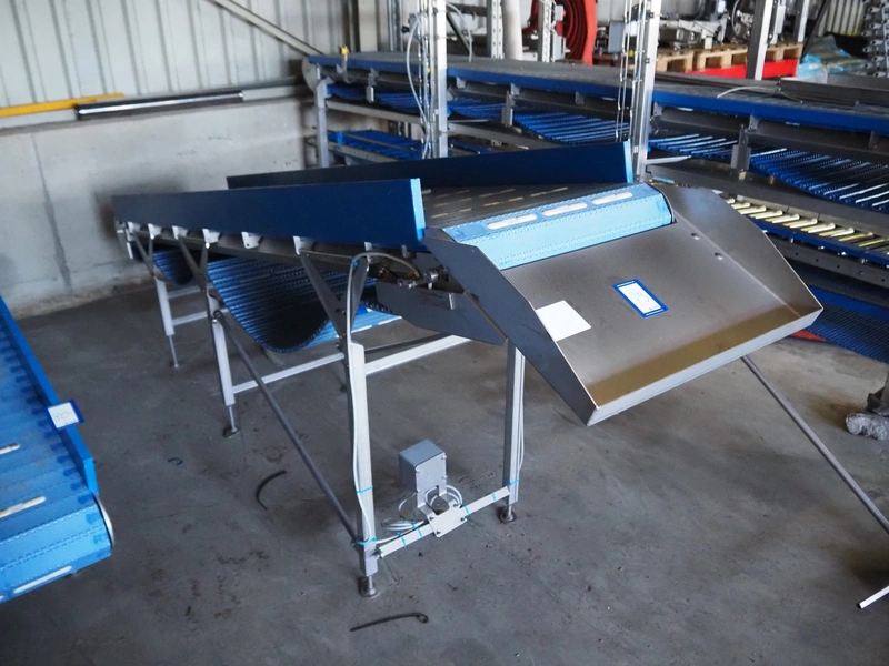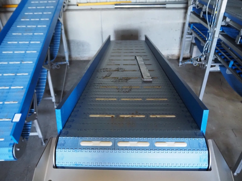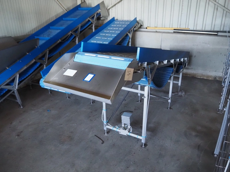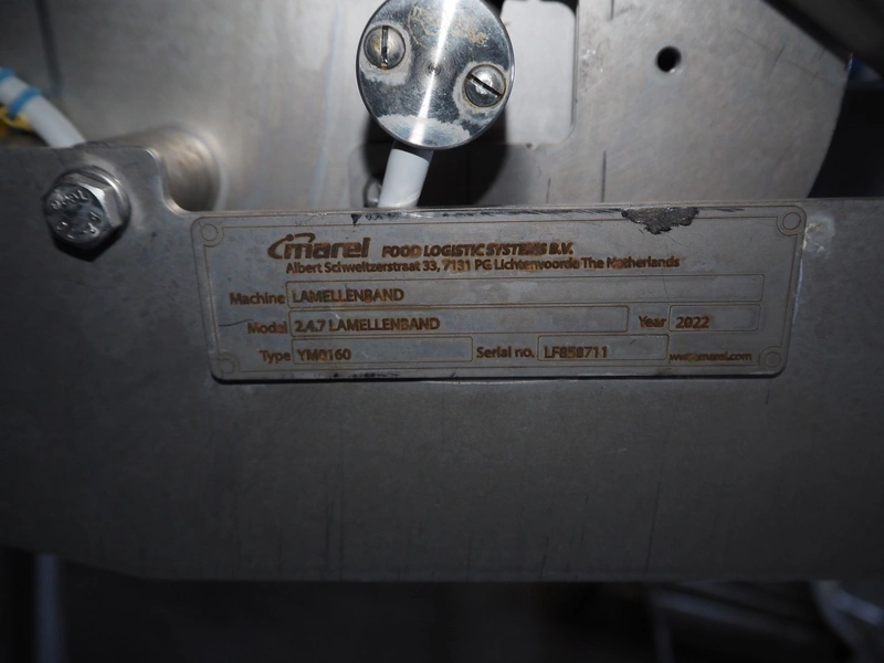 Marel elevating belt, model: 2.4.7 LAMELLENBAND, type: YM0160, serial number: LF858711, year of construction: 2022, s/s frame, plastic belt, belt width: 600 mm, total dimensions: 2000 mm x 700 mm x 1250 mm.