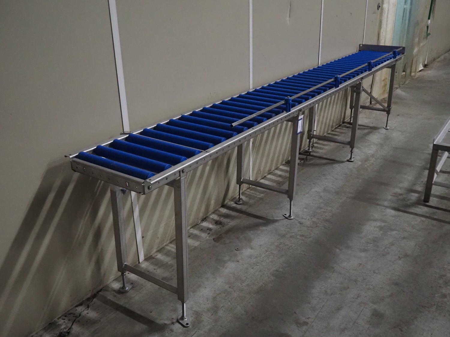 Roller conveyor, s/s frame, plastic rollers, roller width: 400 mm, total dimensions: 3900 mm x 500 mm x 850 mm.
