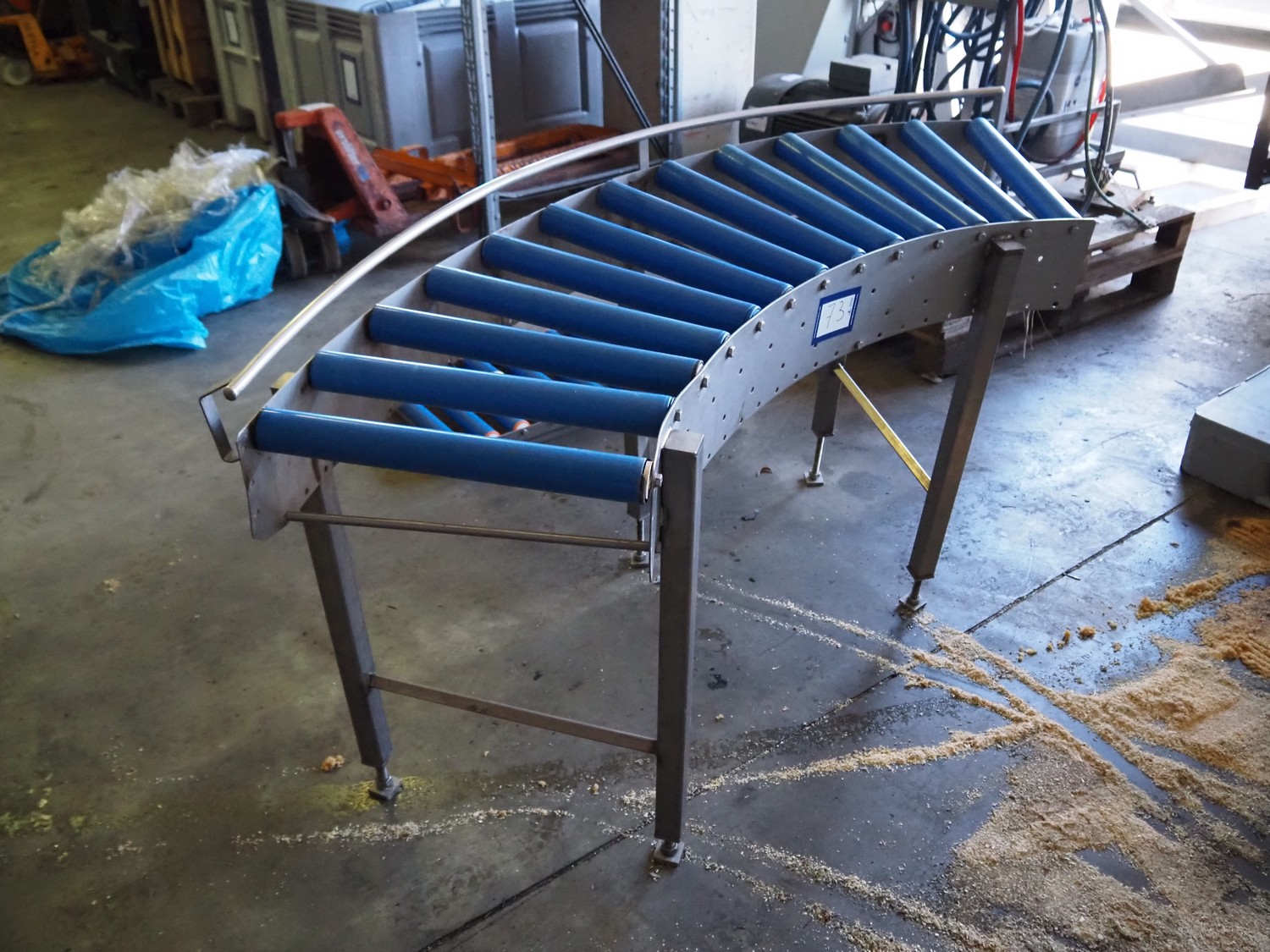 Curve conveyor, s/s frame, plastic rollers, roller width: 450 mm, total dimensions: 1600 mm x 600 mm x 920 mm.