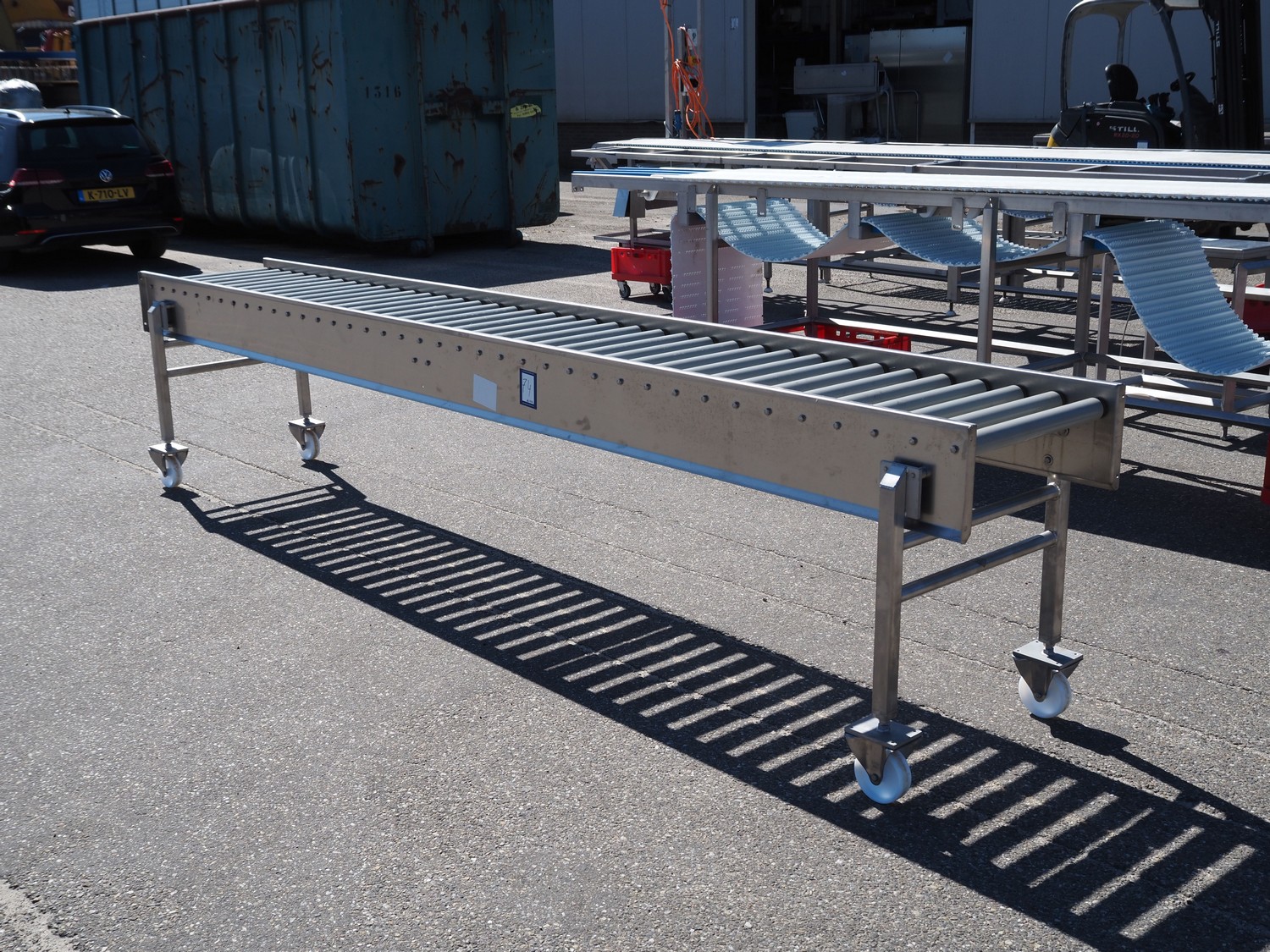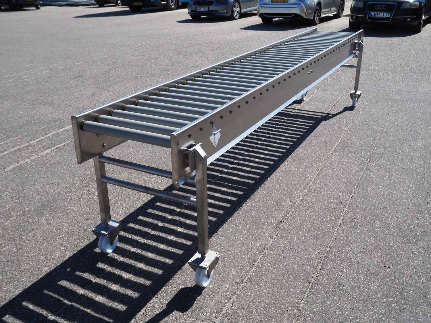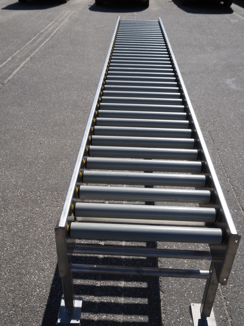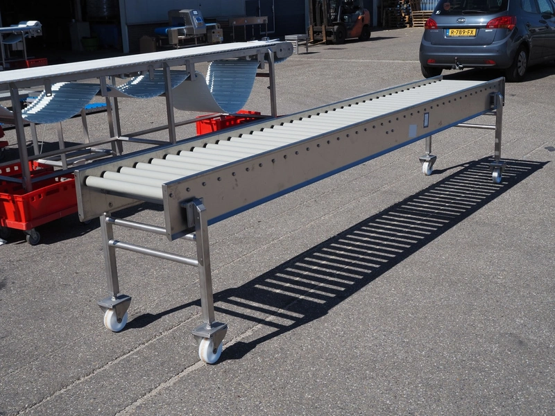 Mobile roller conveyor, s/s frame, plastic rollers, roller width: 500 mm, total dimensions: 3900 mm x 550 mm x 850 mm.