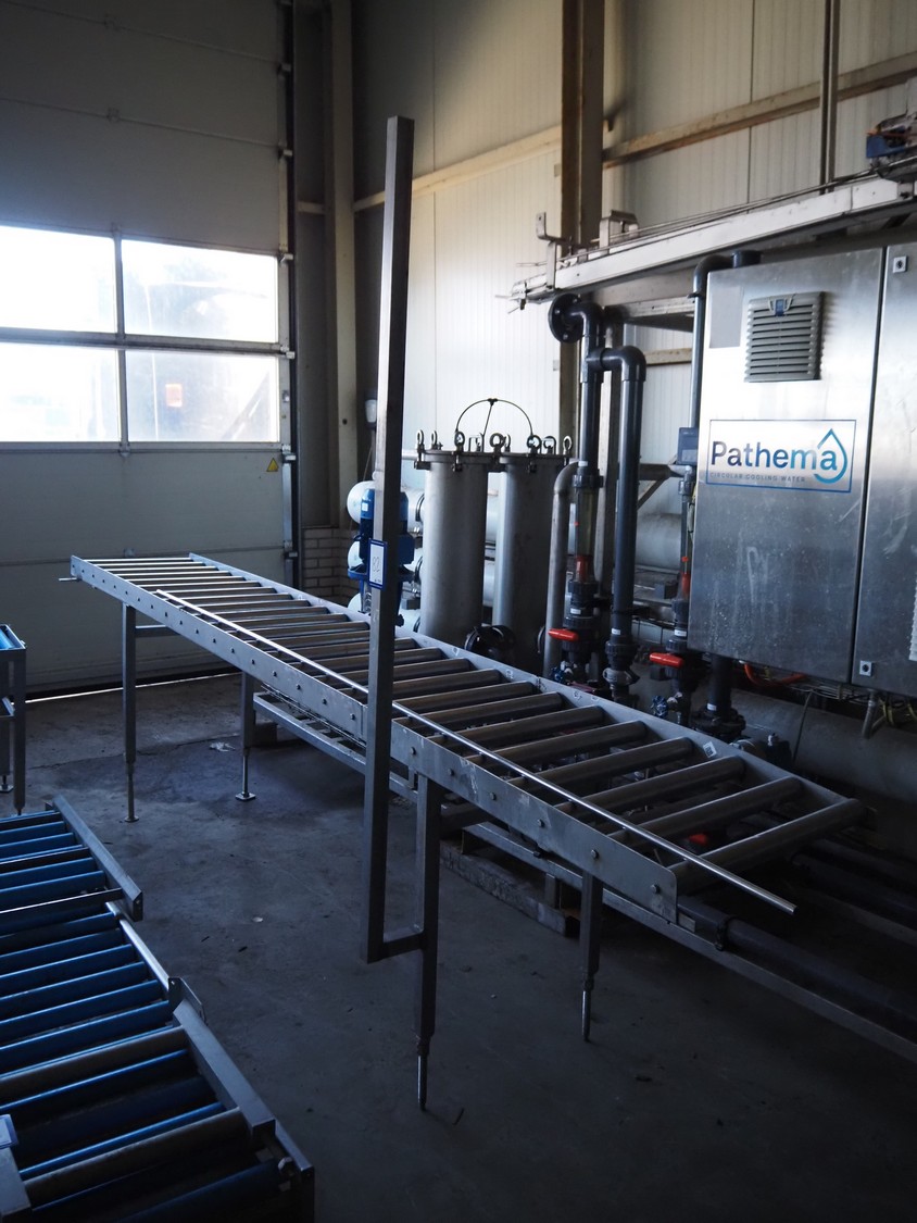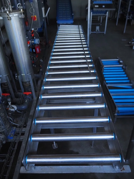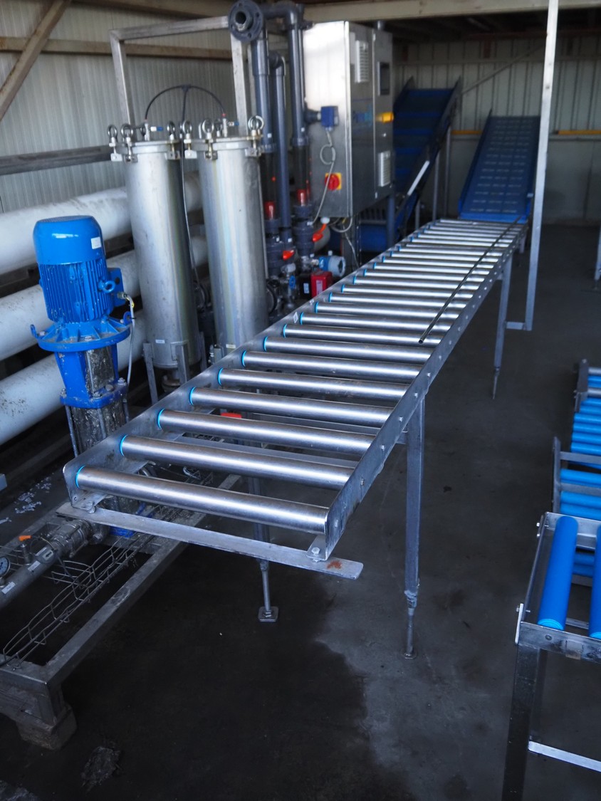 Roller conveyor, s/s frame, s/s rollers, roller width: 540 mm, total dimensions: 3700 mm x 650 mm x 2200 mm.