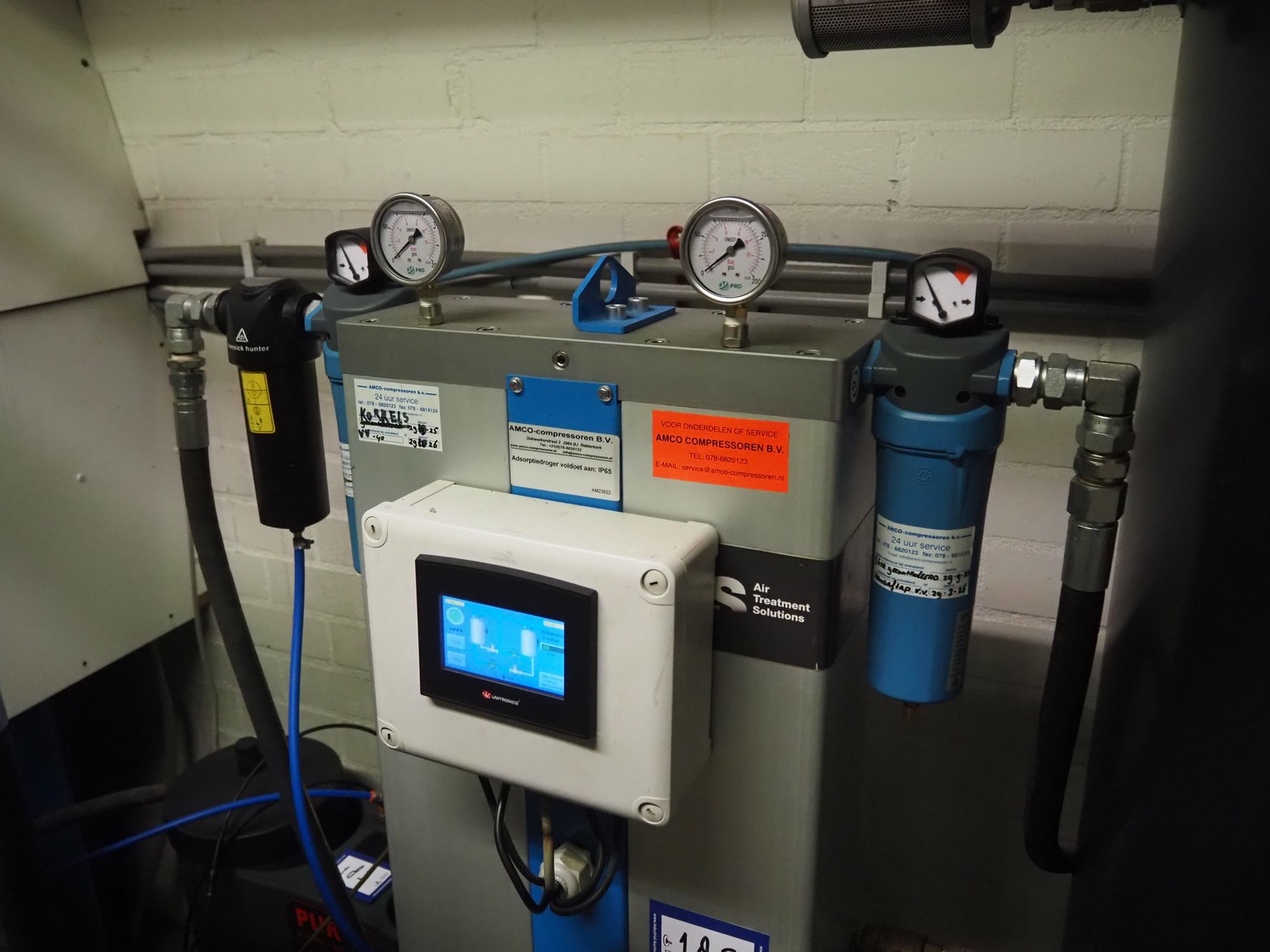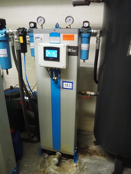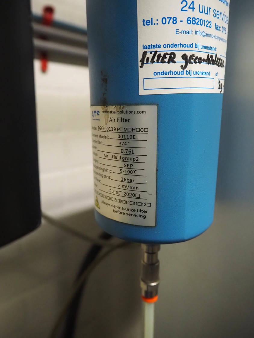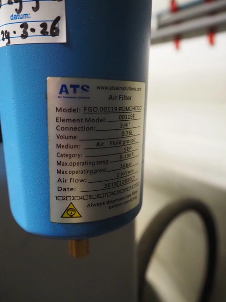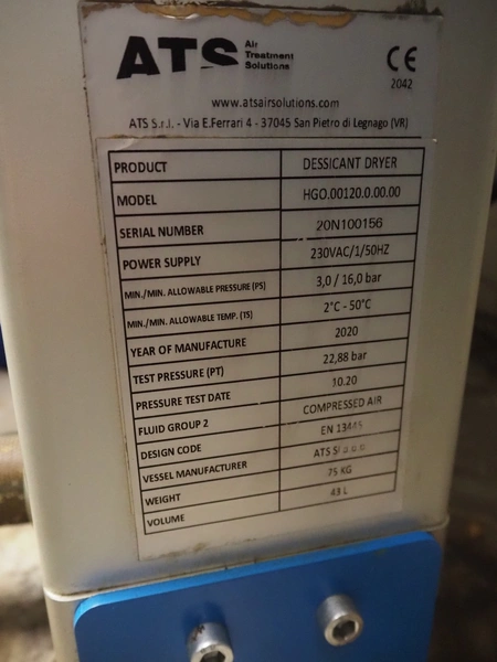 ATS Solutions dessicant dryer, model: HGO.00120.0.00.00, serial number: 2ON100156, year of construction: 2020, 230 V, 1 Ph, 50 Hz, minimum / maximum allowable pressure: 3.0 bar / 16.0 bar, test pressure: 22.88 bar, volume:43 liter, weight: 75 kg, dimensions: 800 mm x 300 mm x 1550 mm.