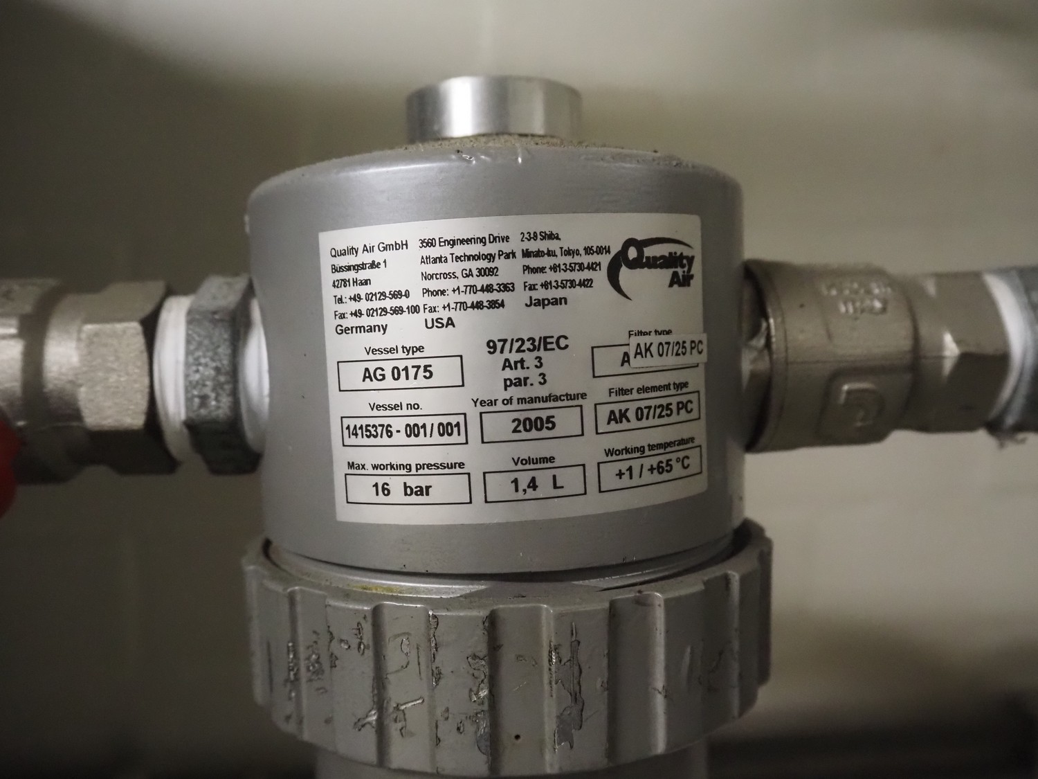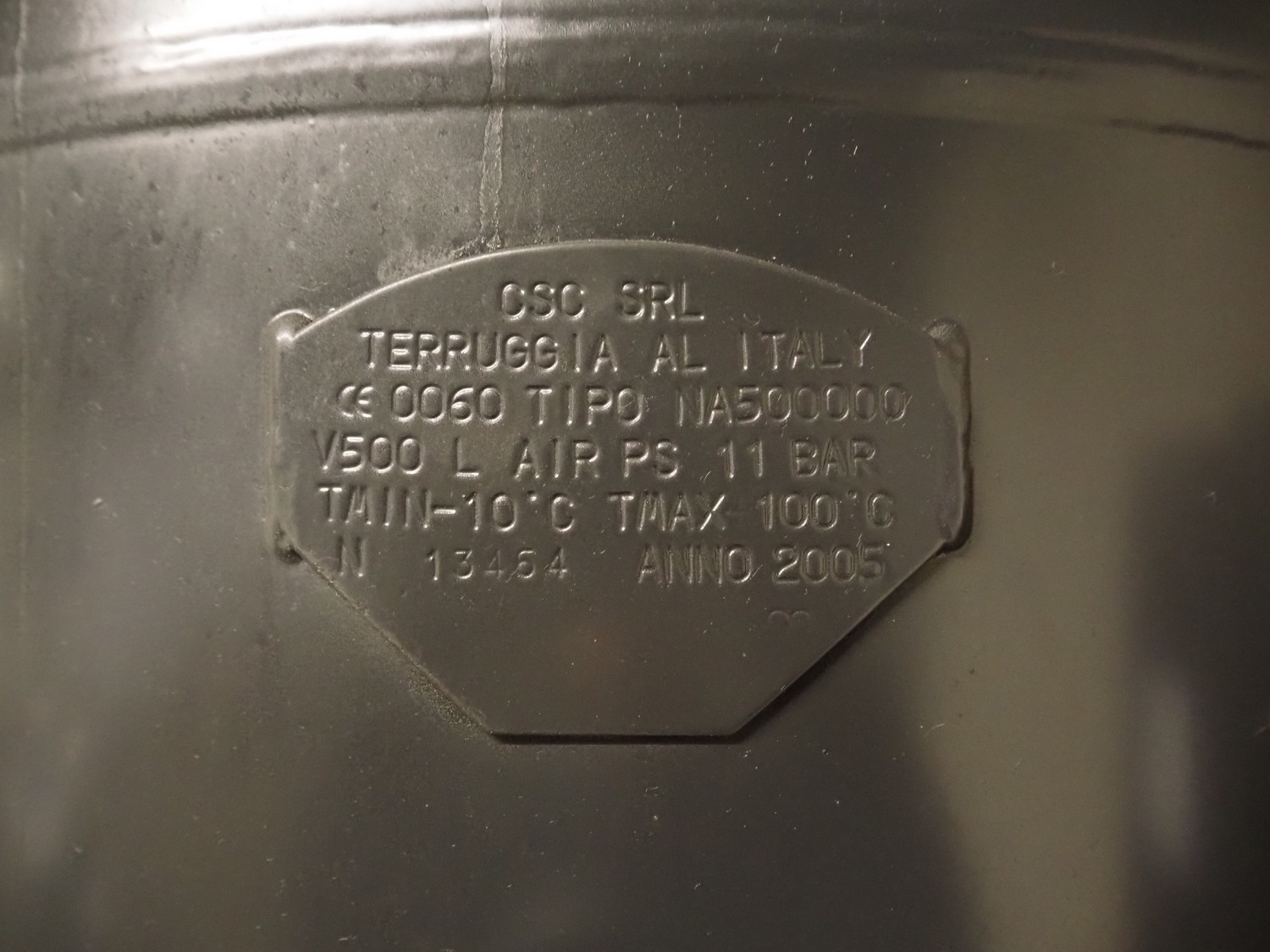 CSC SRL pressure vessel, number: 13454, year of construction: 2005, volume: 500 liter, maximum working pressure: 11 bar, minimum / maximum working temperature: -10˚ / -100˚C, dimensions: 1100 mm x 600 mm x 2200 mm.