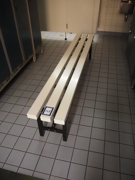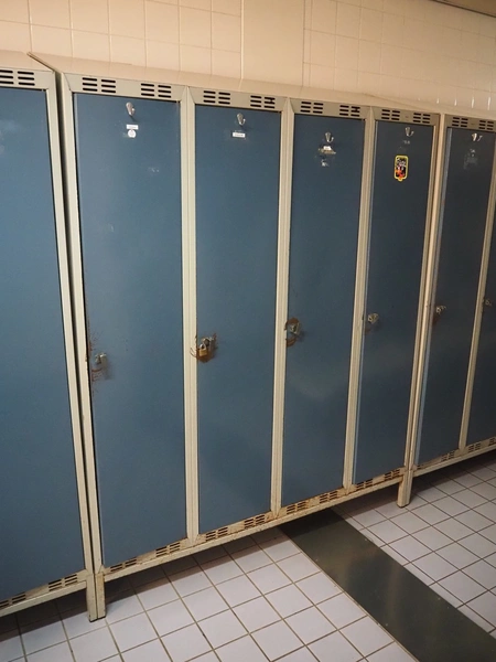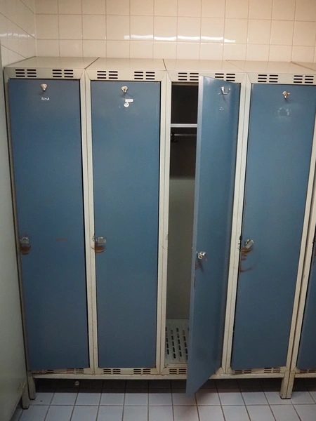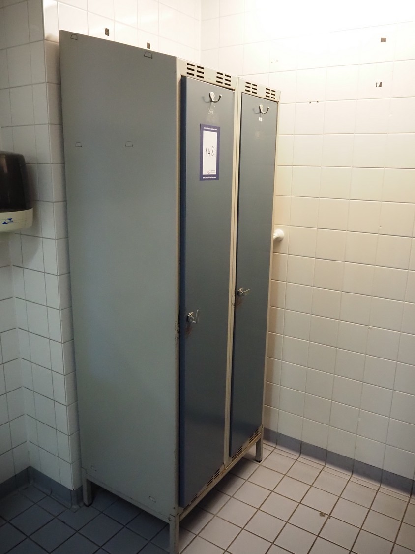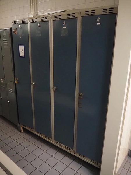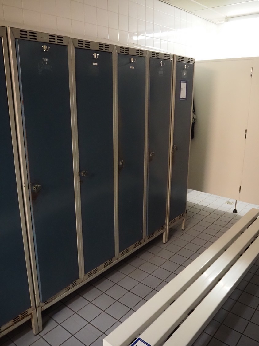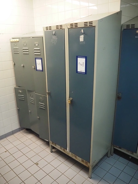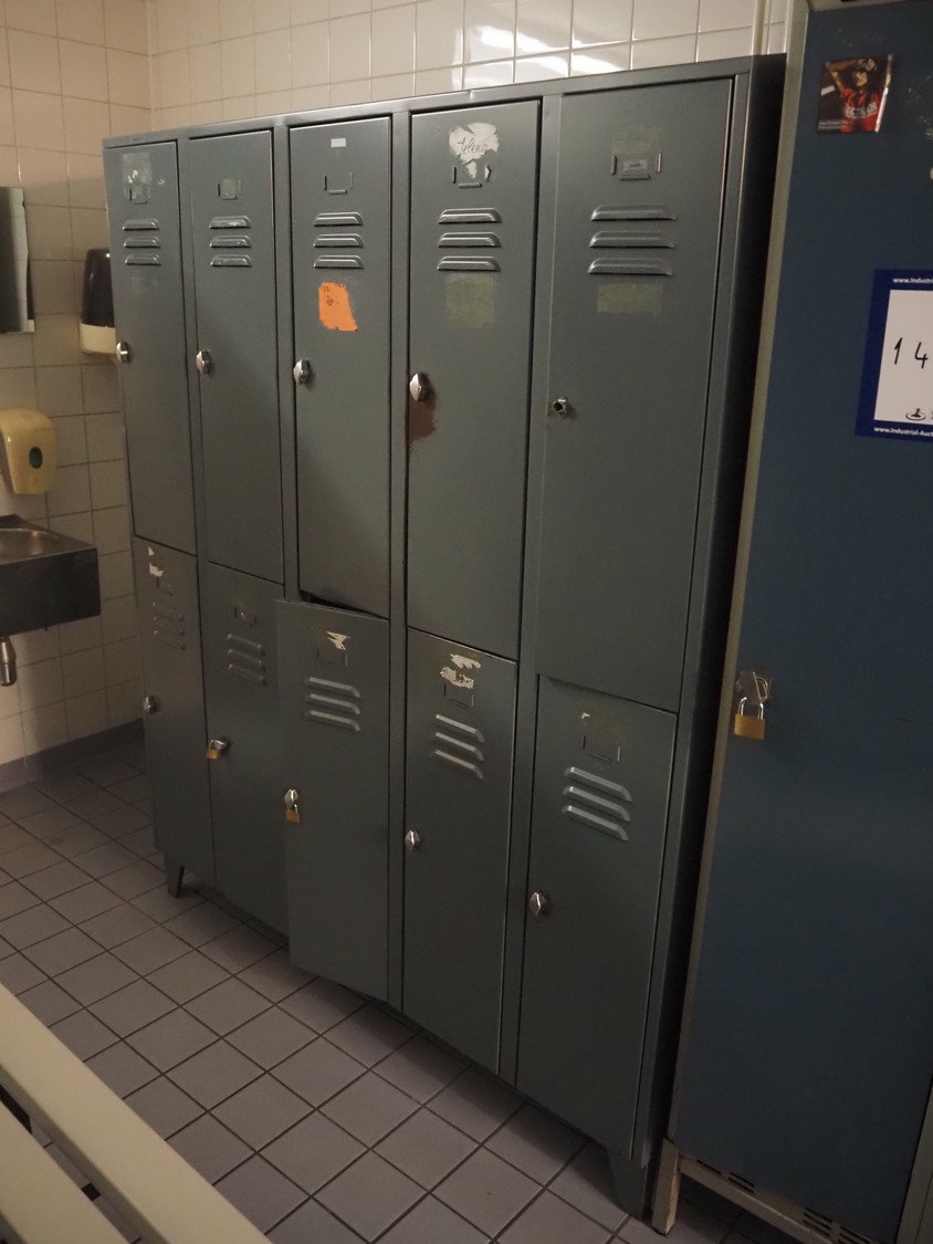 9 pcs. various lockers, dimensions: (4x) 1600 mm x 600 mm x 2100 mm, (2x) 800 mm x 550 mm x 2100 mm, (1x) 1500 mm x 500 mm x 1950 mm, (1x) 400 mm x 550 mm x 1100 mm and (1x) 900 mm x 500 mm x 1950 mm. Including bench.