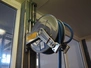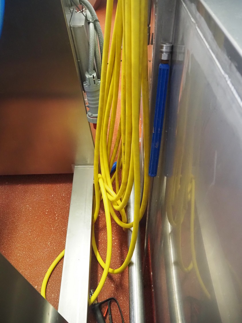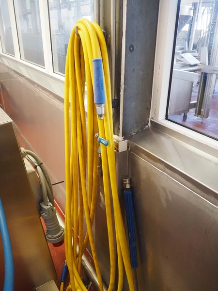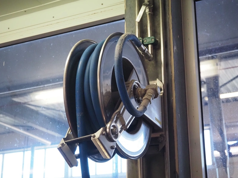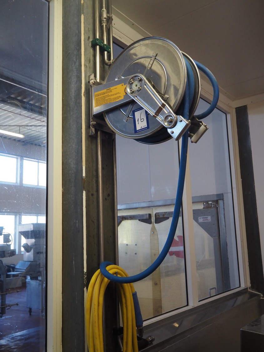 S/s hose reel with hose and pistol, dimensions: 500 mm x 500 mm x 250 mm and extra plastic hose with pistol.