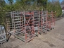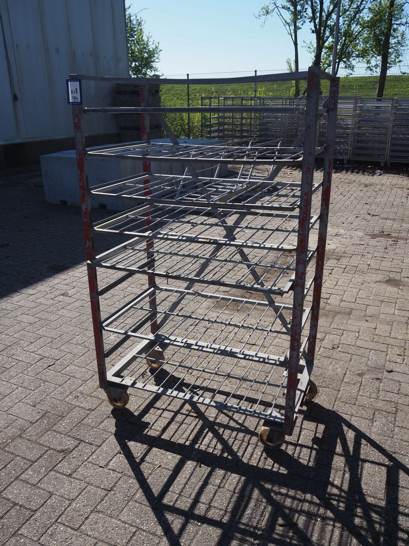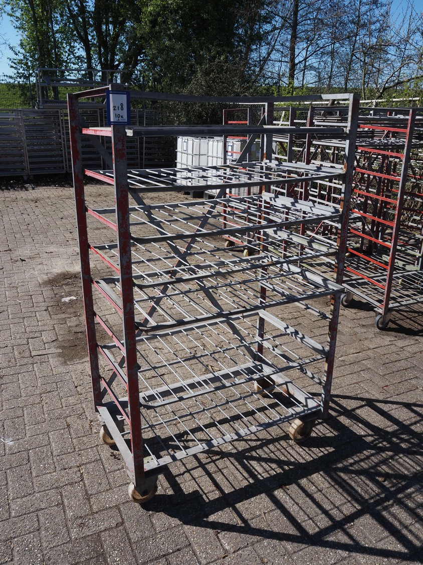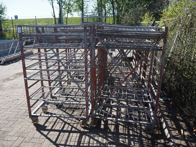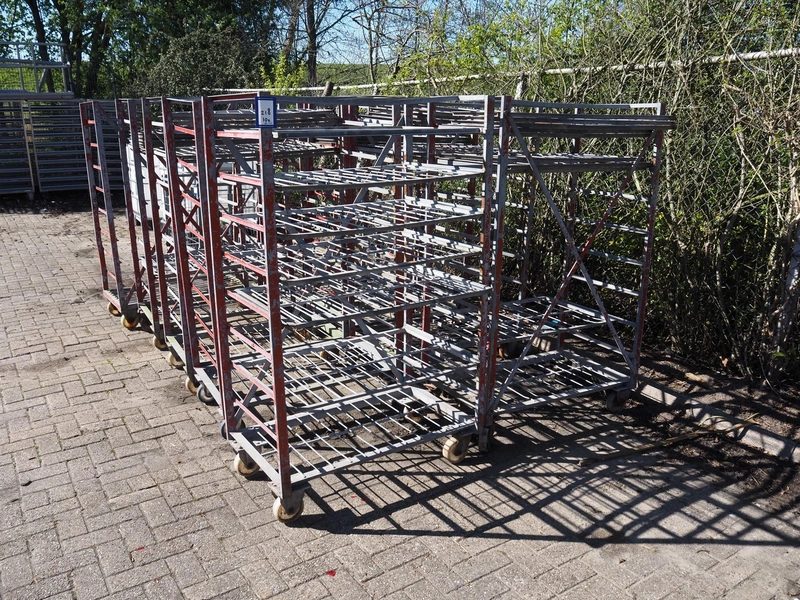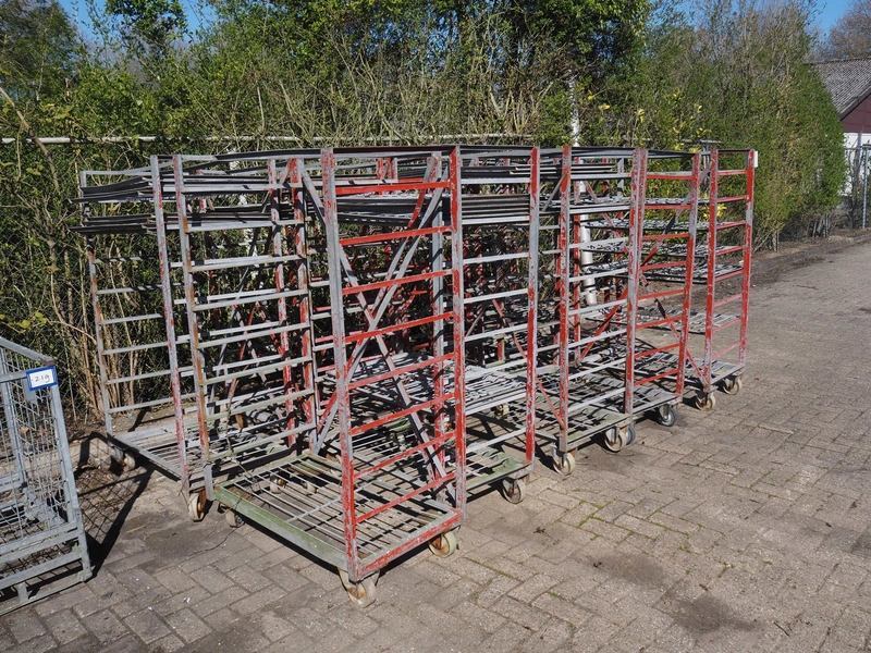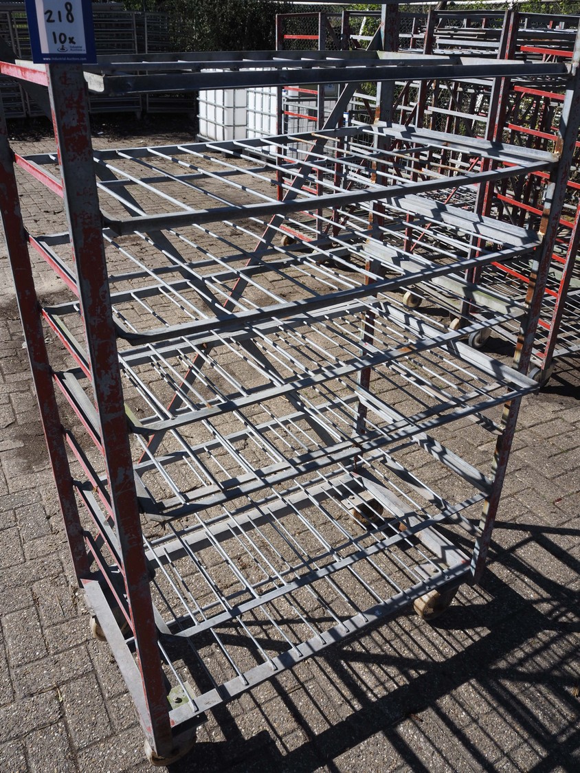 10 steel trolleys, 8 floors, dimensions floors: (8x) 920 mm x 600 mm, total dimensions: (10x) 1000 mm x 600 mm x 1650 mm.
