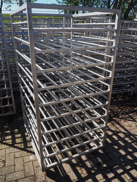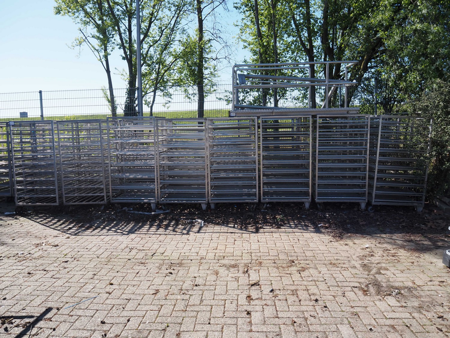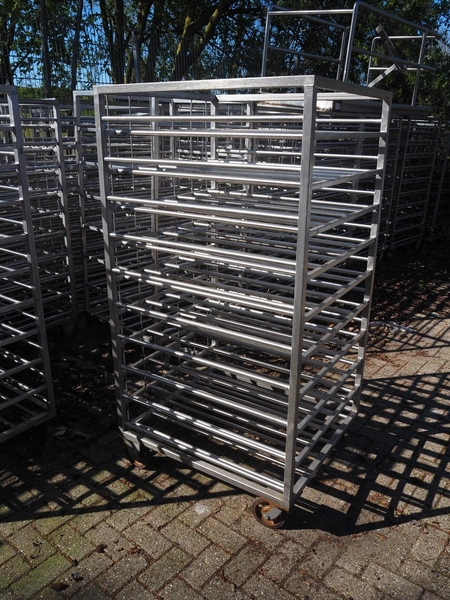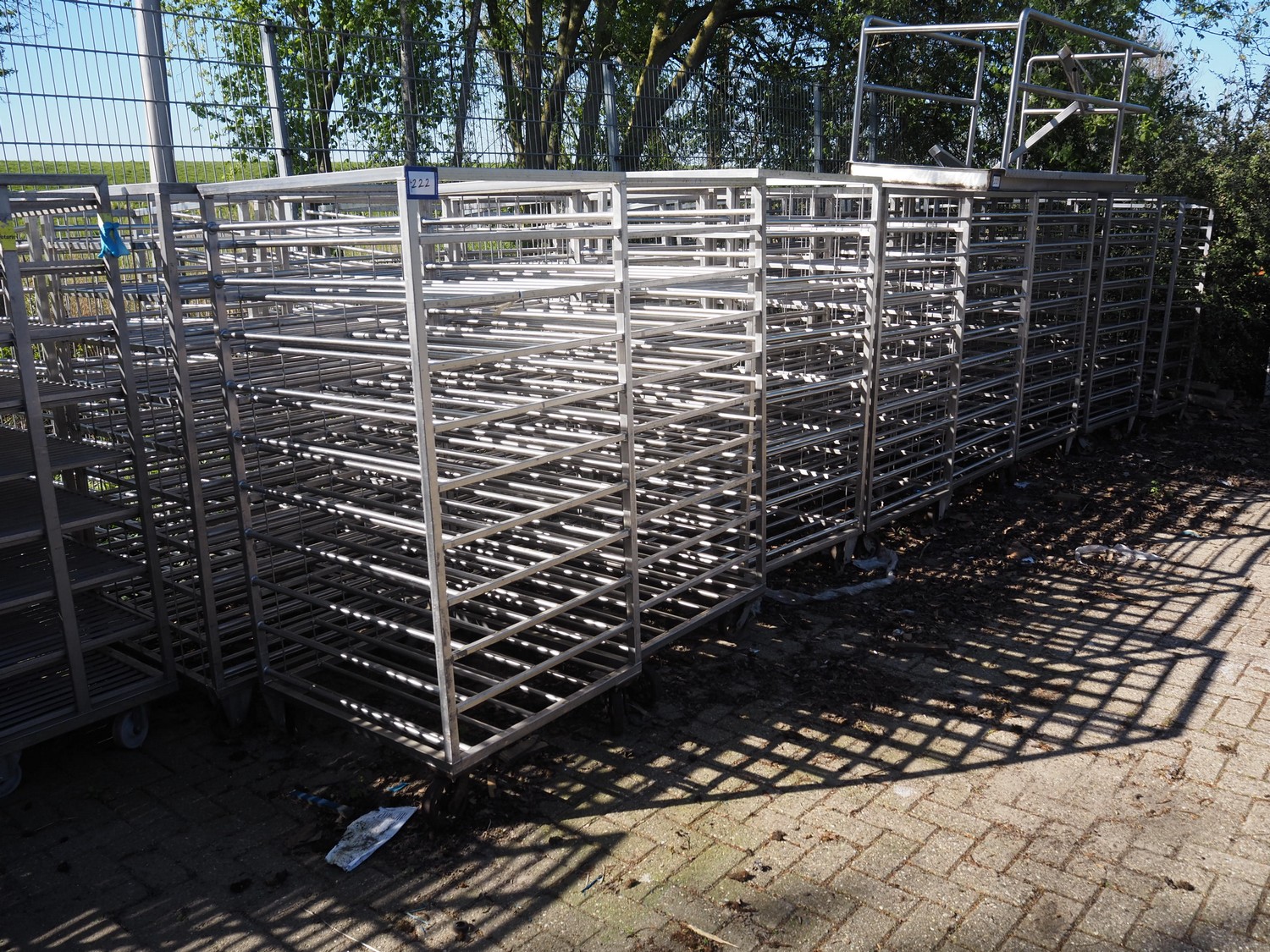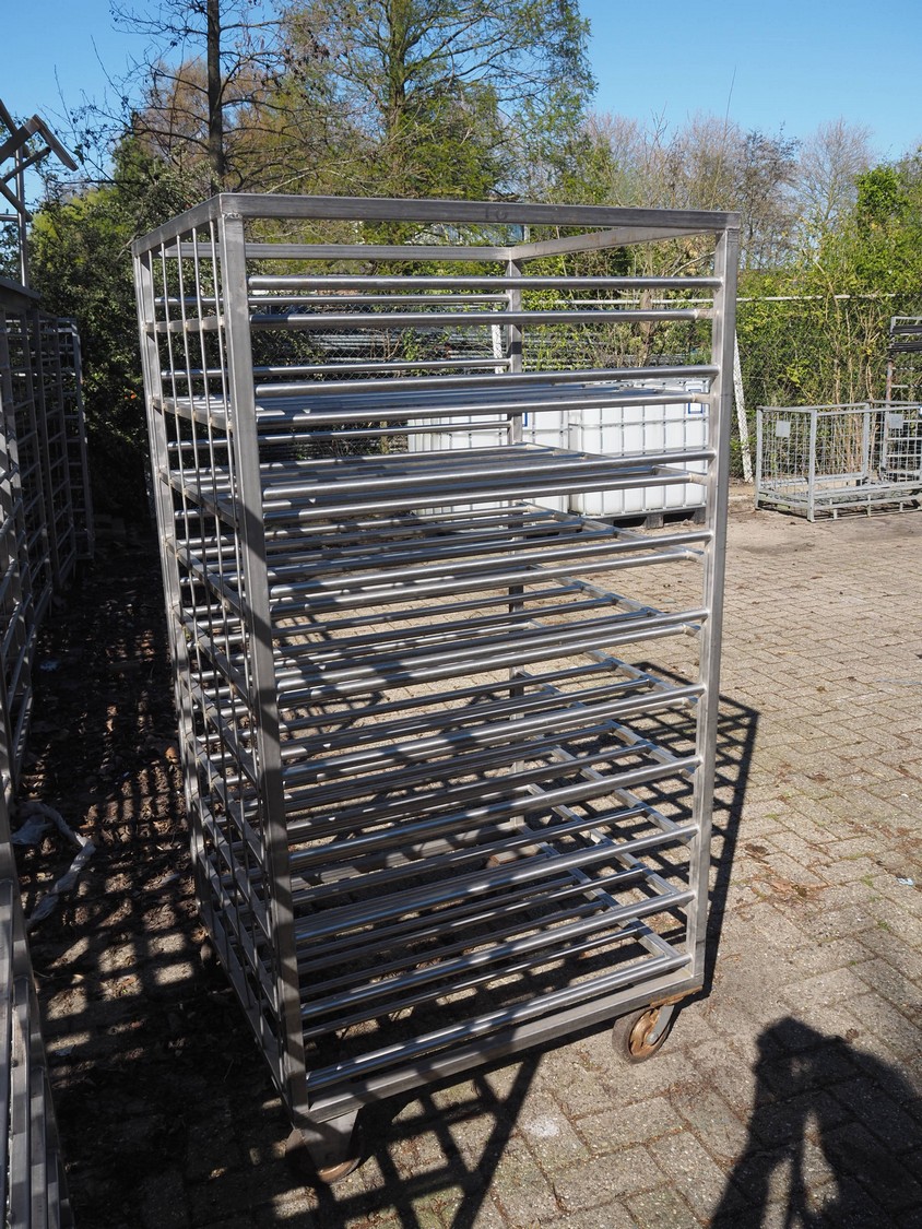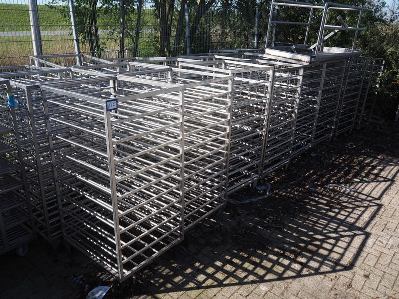 24 s/s trolleys, 10 floors, dimensions floors: (10x) 900 mm x 750 mm, total dimensions: (24x) 810 mm x 900 mm x 1700 mm.