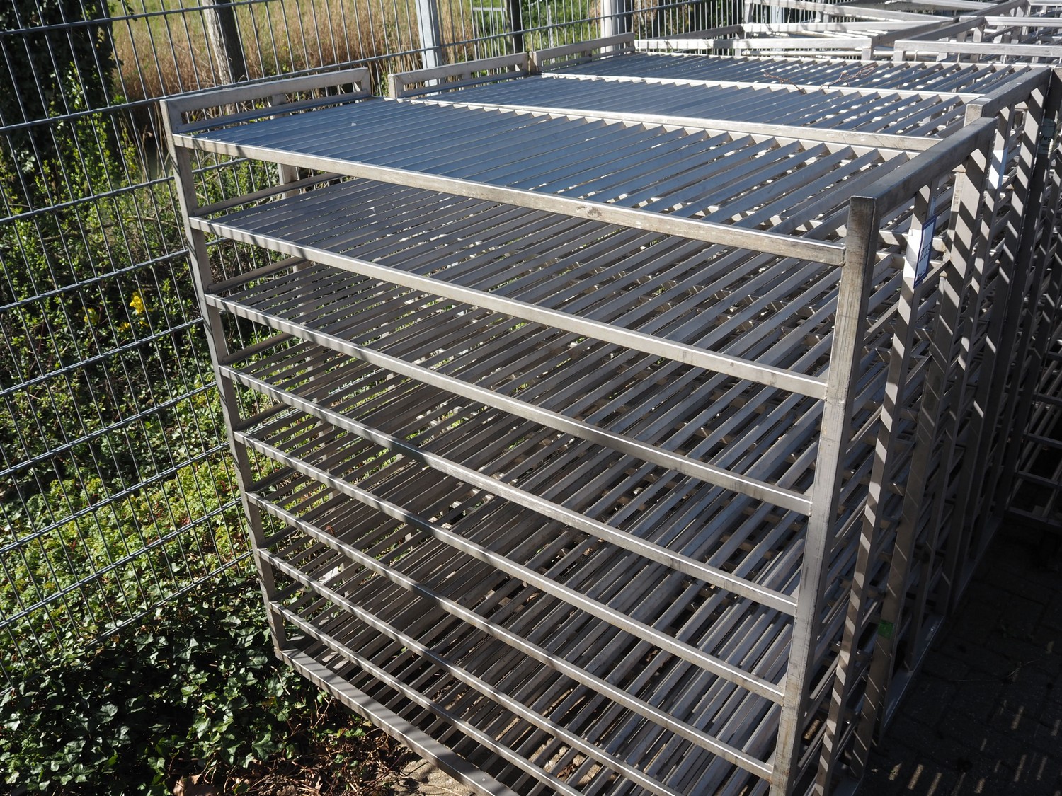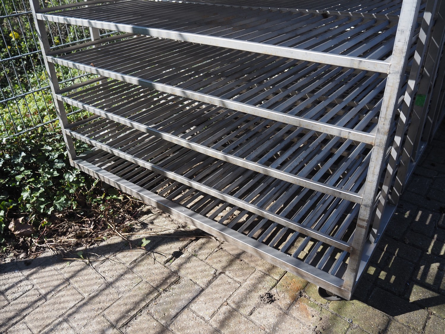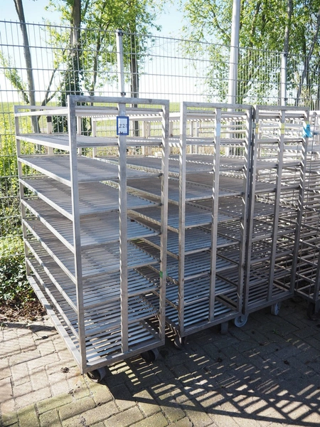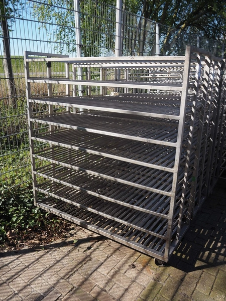 3 s/s trolleys, 9 floors, dimensions floors: (9x) 1480 mm x 580 mm, total dimensions: (3x) 1550 mm x 600 mm x 1750 mm.