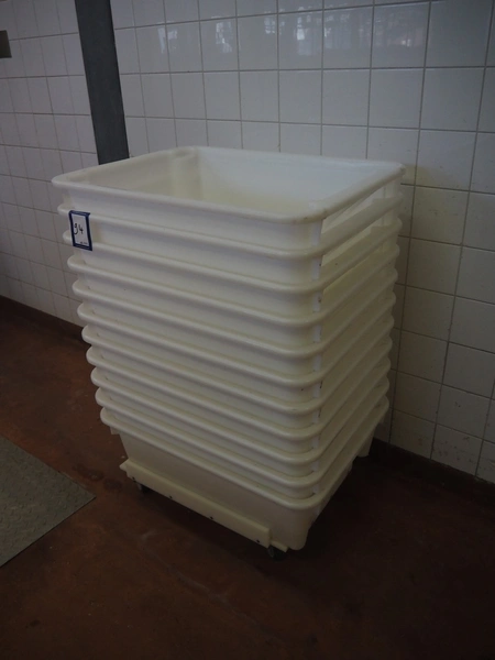 Rollie with 11 plastic bins, dimensions bins: (11x) 800 mm x 600 mm x 250 mm, total dimensions: 800 mm x 600 mm x 1100 mm.