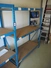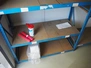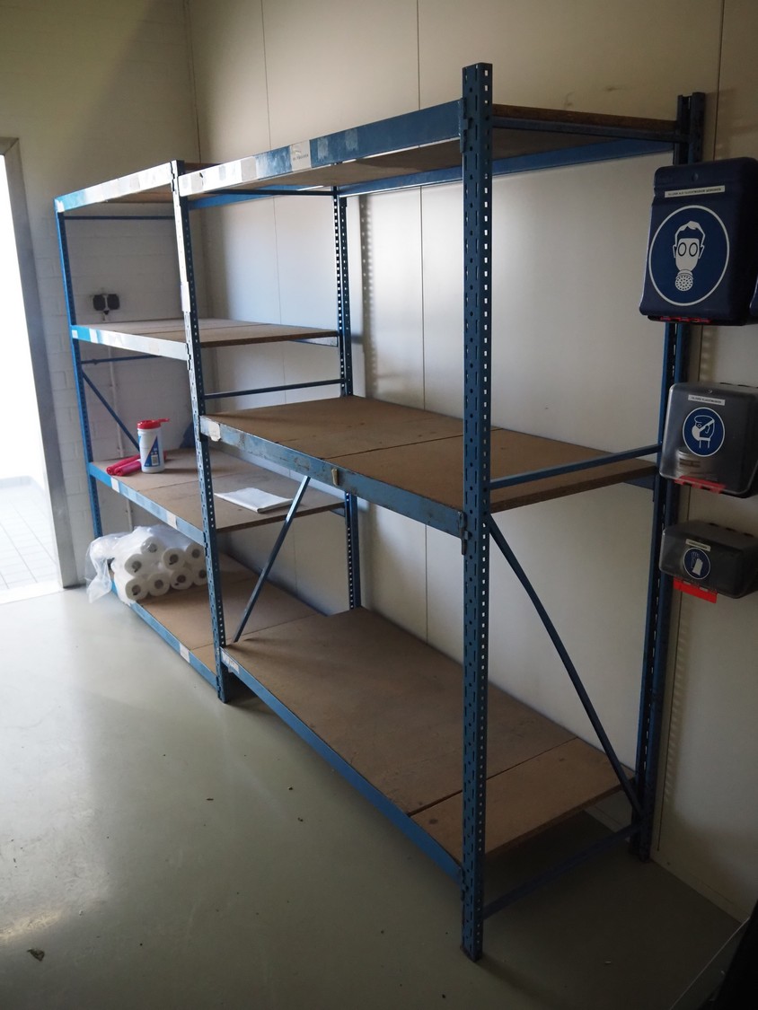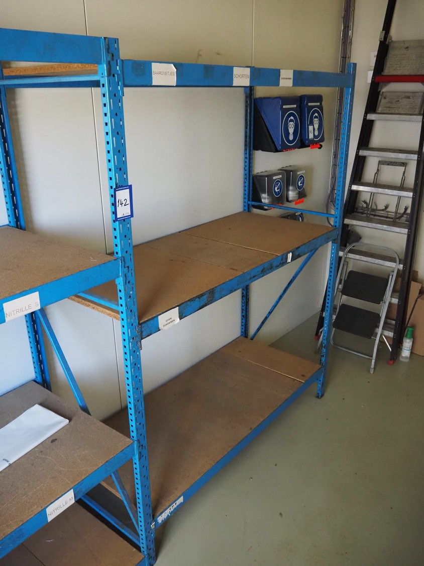Steel storage rack with wooden plates, 1 x 3 floors and 1 x 4 floors, floor dimensions: (7x) 1500 mm x 640 mm, total dimensions: 3200 mm x 640 mm x 2000 mm.