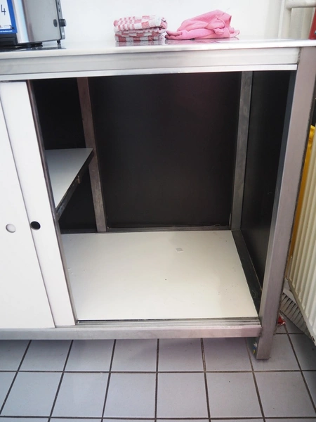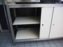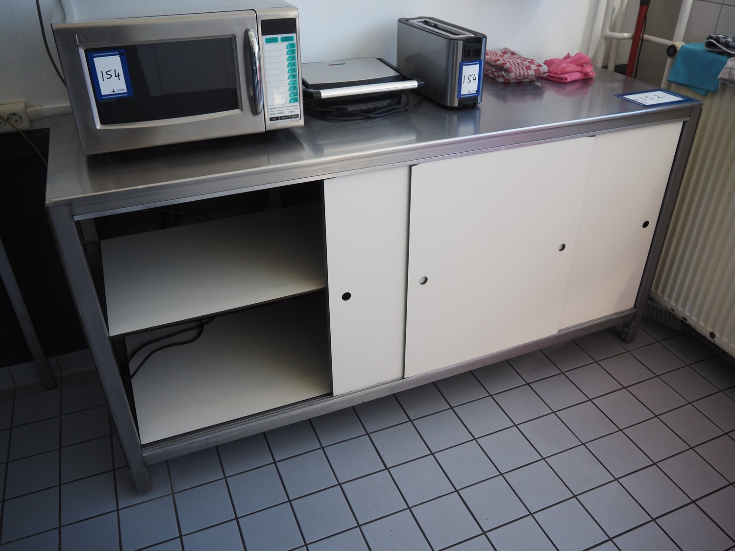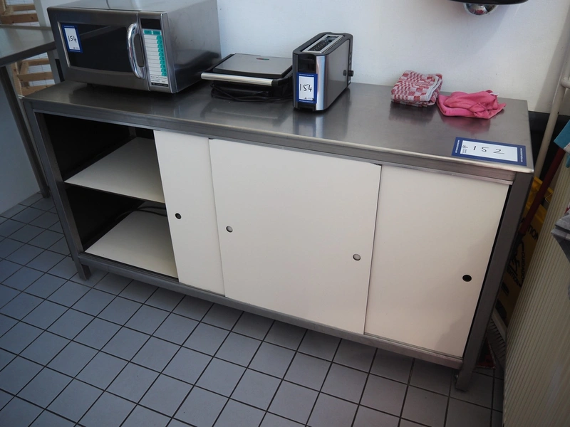 S/s table with wooden cabinet, dimensions: 1800 mm x 600 mm x 940 mm.
