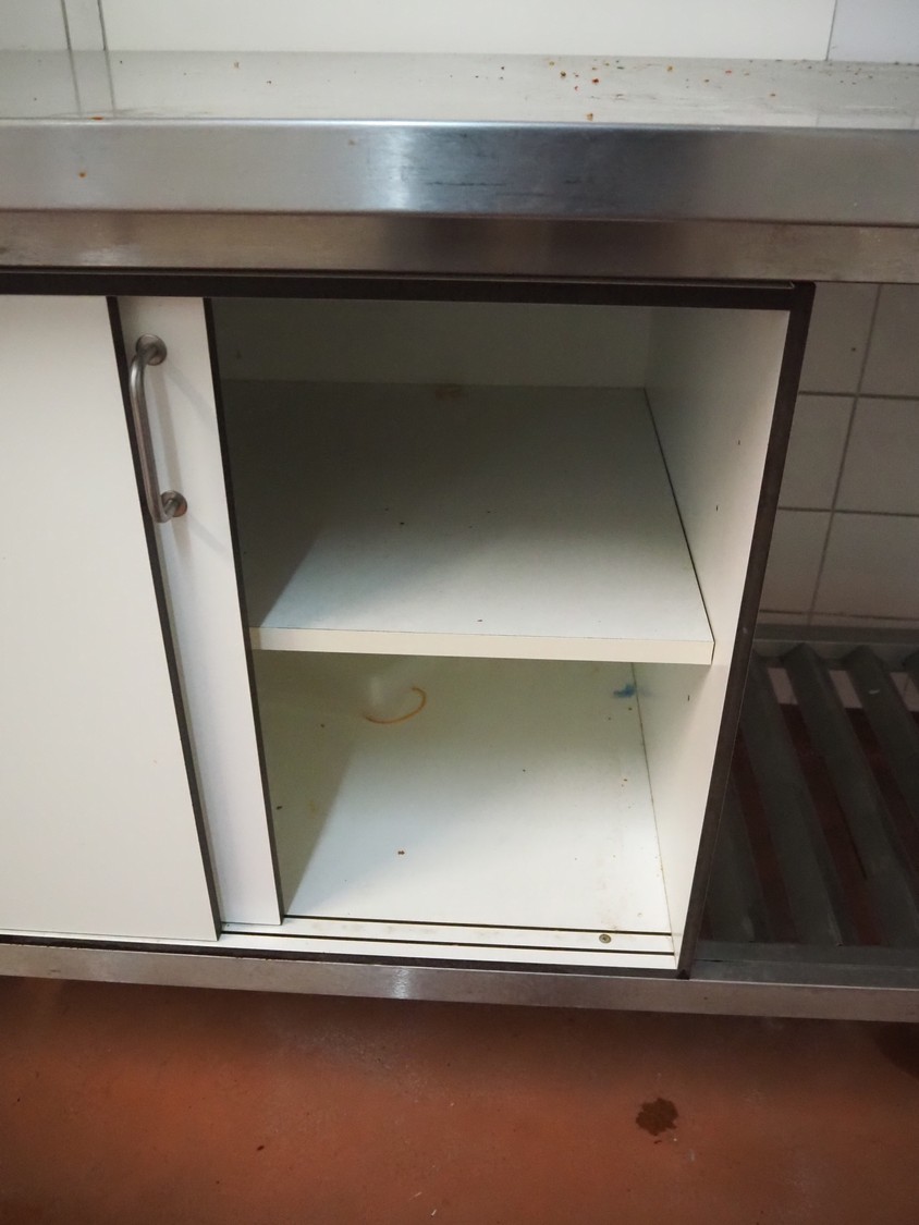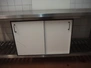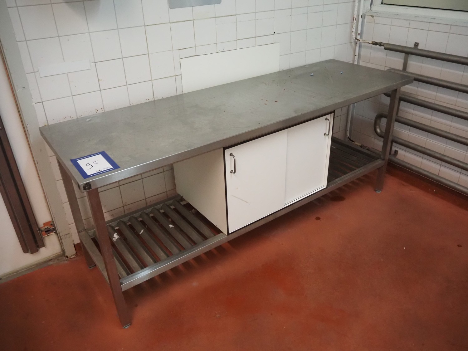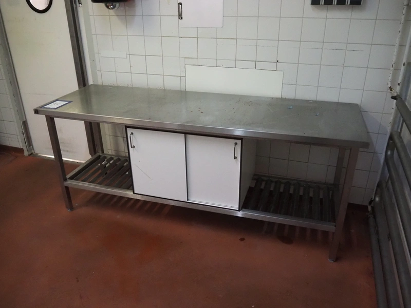 S/s table with wooden cabinet, dimensions: 2150 mm x 700 mm x 900 mm.