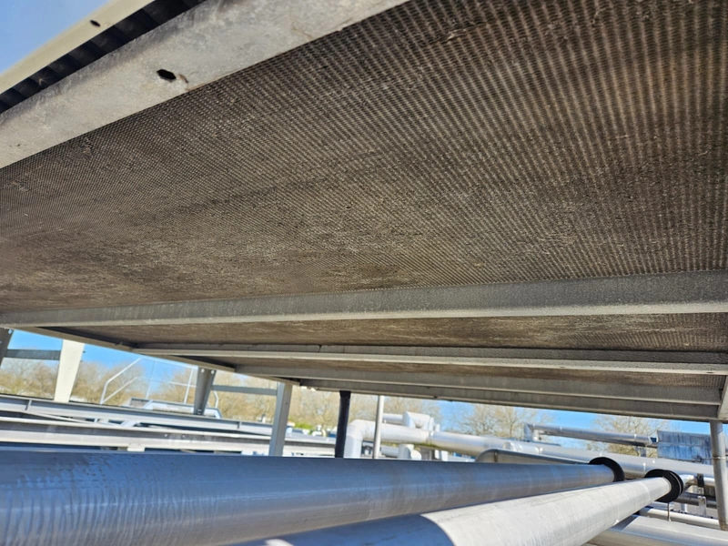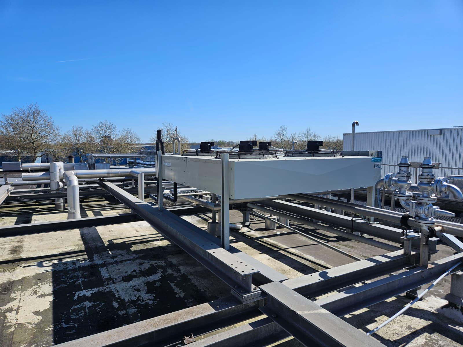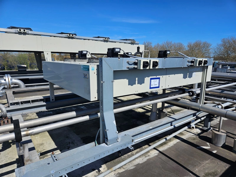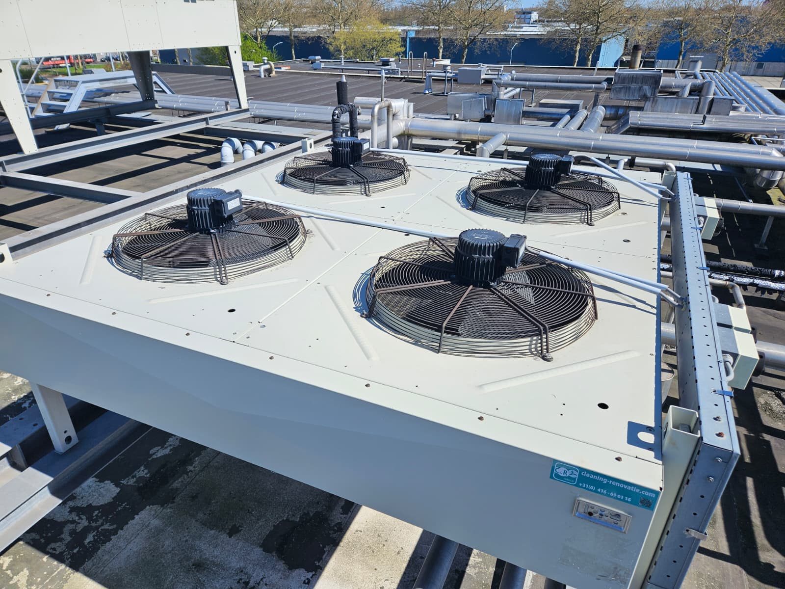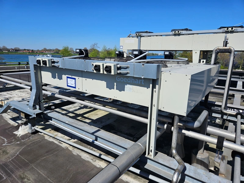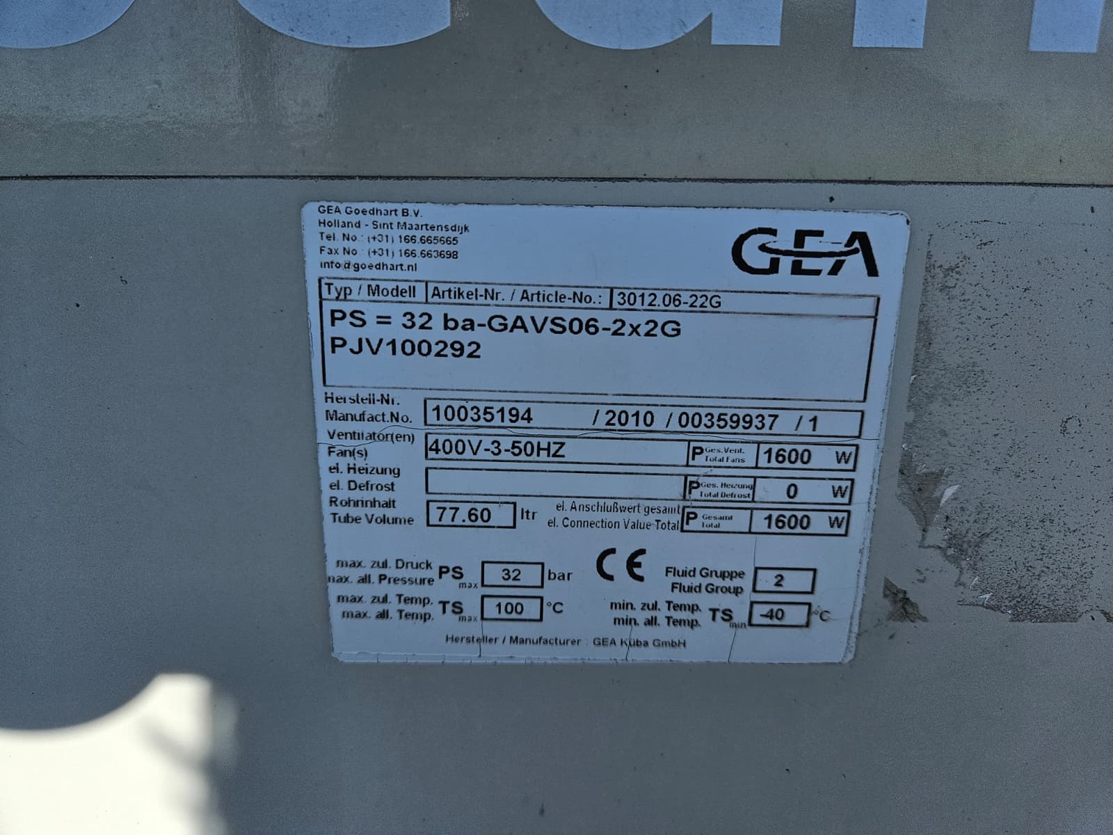GEA Goedhart B.V. roof condenser, type / model: PS = 32 ba-GAVS06-2x2G, manufacturing number: 10035194 / 2010 / 00359937/ 1, 400 V, 3 Ph, 50 hz, total fans: 1600 W, maximum allowable pressure: 32 bar, maximum working temperature: 100˚C, tube volume: 77.60 liter, 4 fans, total dimensions: 2500 mm x 2400 mm x 1100 mm.