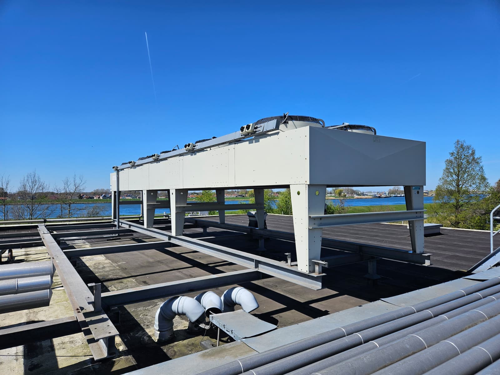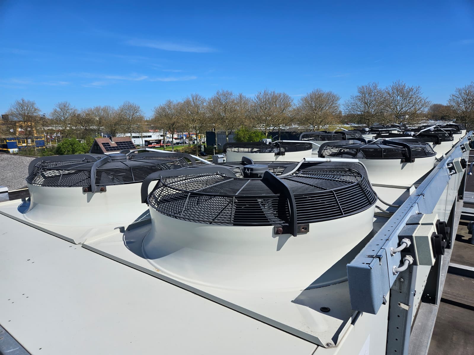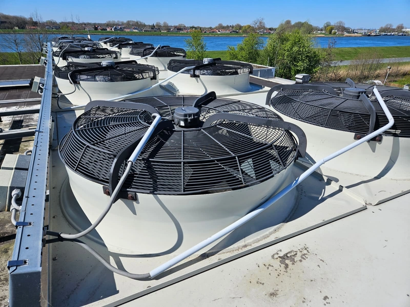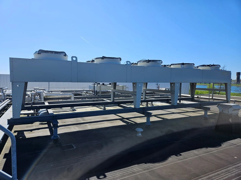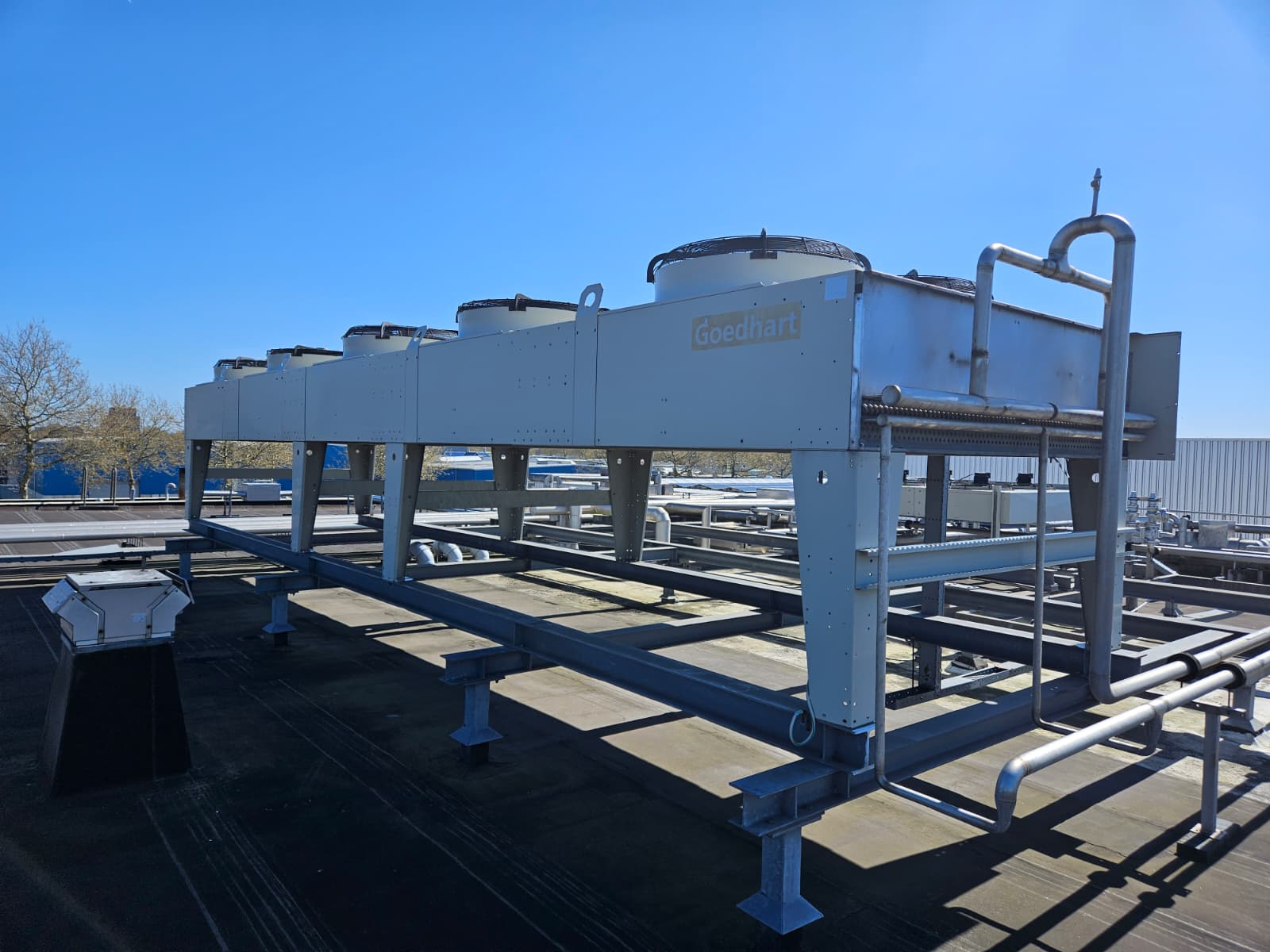 GEA Goedhart B.V. roof condenser, 400 V, 3 Ph, 50 hz, total fans: 22000 W, maximum allowable pressure: 32 bar, maximum working temperature: 100˚C, tube volume: 366.00 liter, air capacity: 246.500 m³ per hour, 10 fans, weight: 2575 kg, total dimensions: 10500 mm x 2400 mm x 2100 mm.