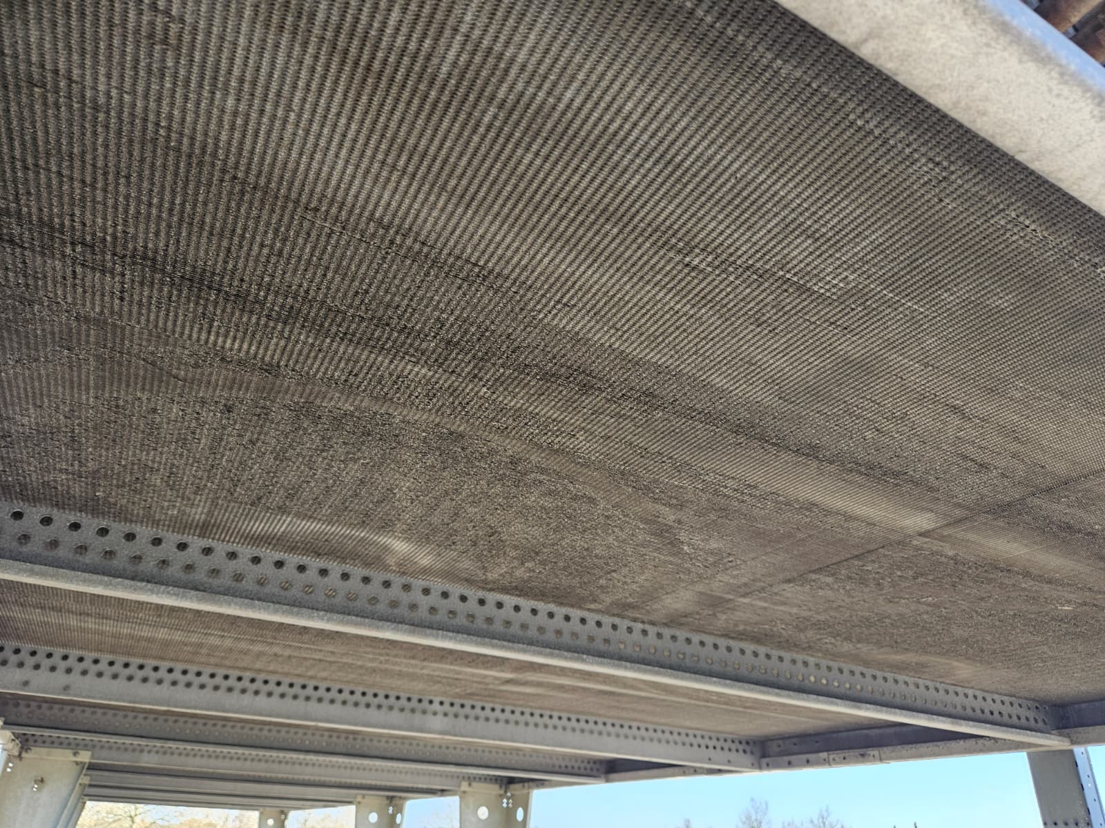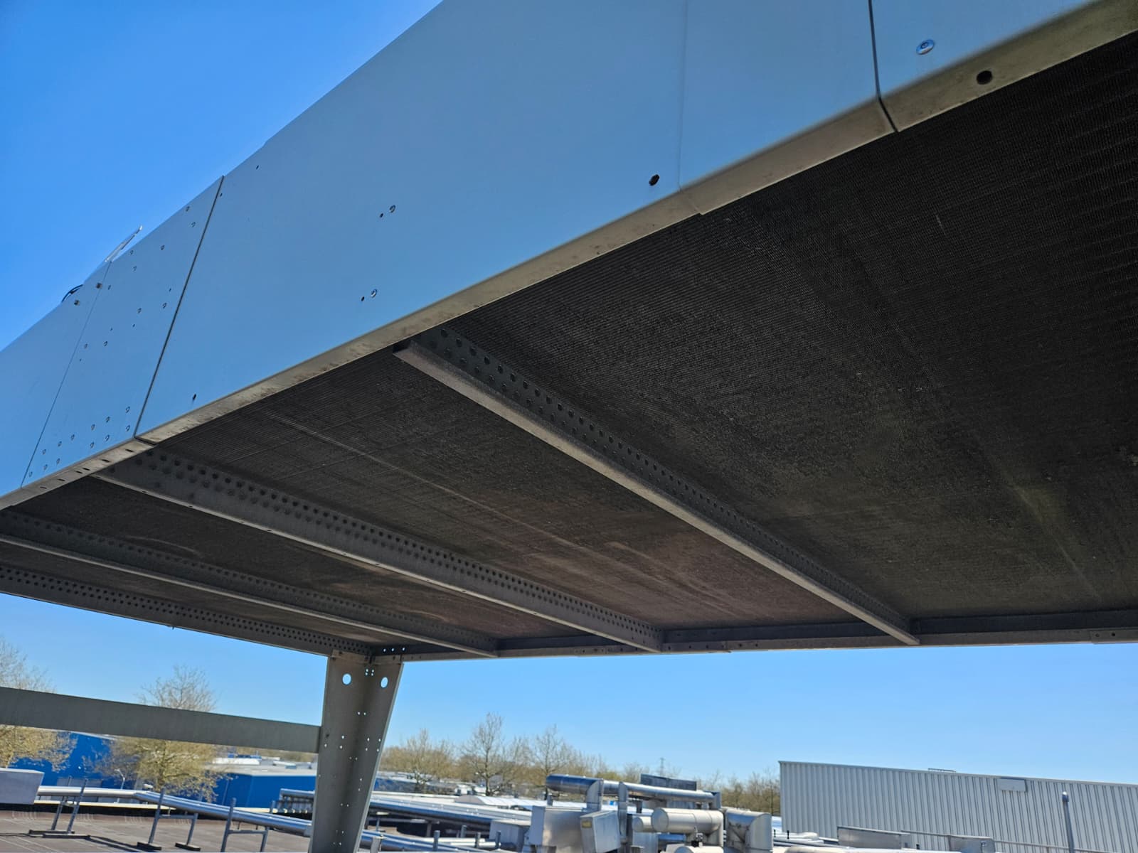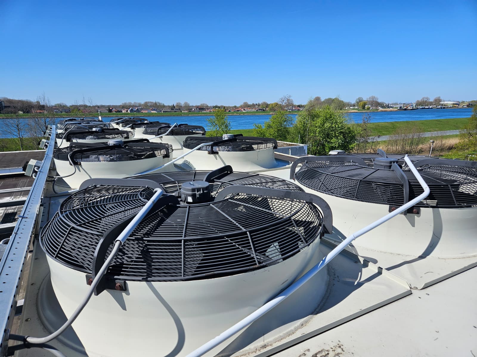 GEA Goedhart B.V. roof condenser, 400 V, 3 Ph, 50 hz, total fans: 22000 W, maximum allowable pressure: 32 bar, maximum working temperature: 100˚C, tube volume: 366.00 liter, air capacity: 246.500 m³ per hour, 10 fans, weight: 2575 kg, total dimensions: 10500 mm x 2400 mm x 2100 mm.