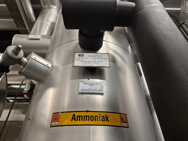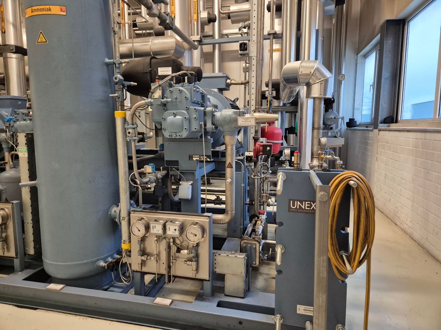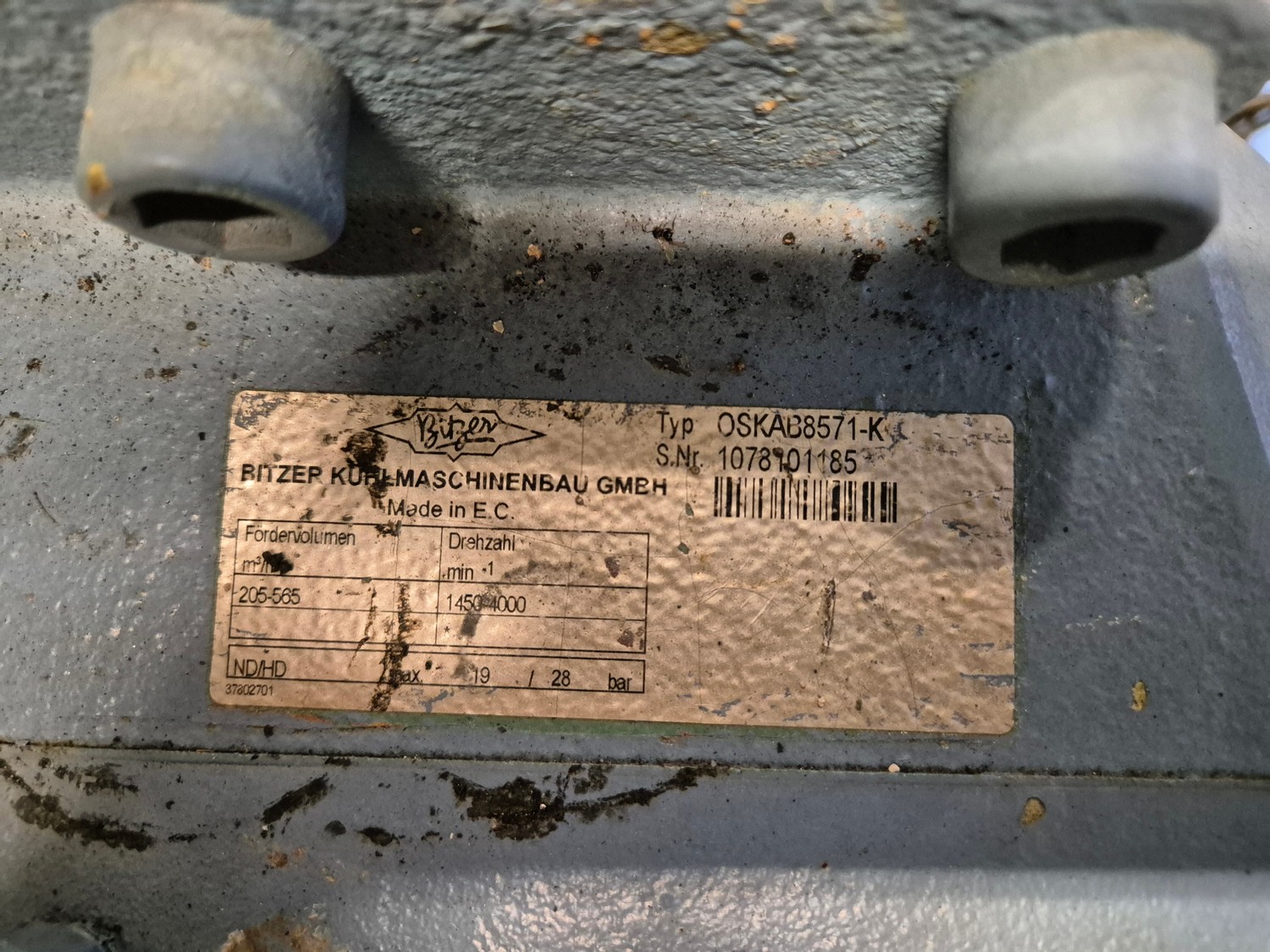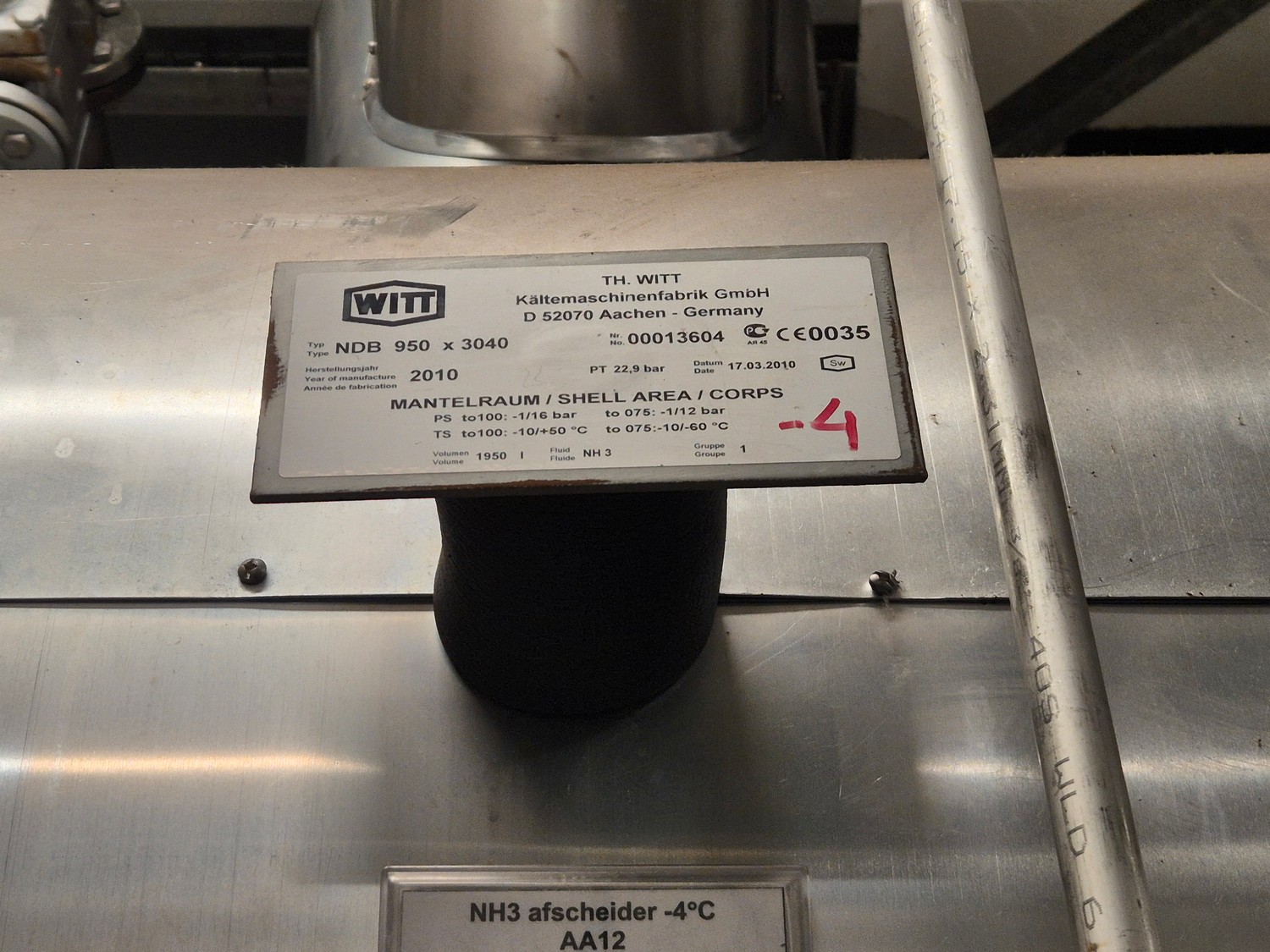 Bitzer Kühlmaschinenbau GmbH NH3 compressor installation with 4 pcs. Bitzer Kühlmaschinenbau GmbH screw compressor, compressor 1: (-4˚C section), type: OSKA 8851 K, cooling capacity: 235 kW, 3000 rates per minute / 50 Hz, nominal capacity: 90 kW, compressor 2: (-4˚C section), type OSKA 8551-K, cooling capacity: 284 kW, 3500 rates per minute / 60 Hz, nominal capacity: 90 kW, compressor 3: (-30˚C section), type: OSKAB 7461 K, cooling capacity: 82 kW, 3500 rates per minute / 60 Hz, nominal capacity: 30 kW, compressor 4: (-40˚C section), type: OSKAB 8571 K, cooling capacity: 90 kW, 3500 rates per minute / 60 Hz, nominal capacity: 75 kW, 3 pcs. WITT separation vessel, refrigerant: NH3, capacity: 500 kW / 75 kW / 150 kW, volume: 1950 liter / 753 liter / 330 liter, 4 pcs. Witt liquid pumps, type: HRP 3232, motor capacity: 1.0 kW, complete switch cabinet, total dimensions switch cabinet: 7000 mm x 600 mm x 2200 mm.